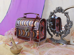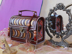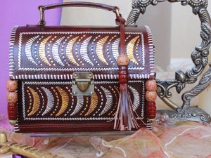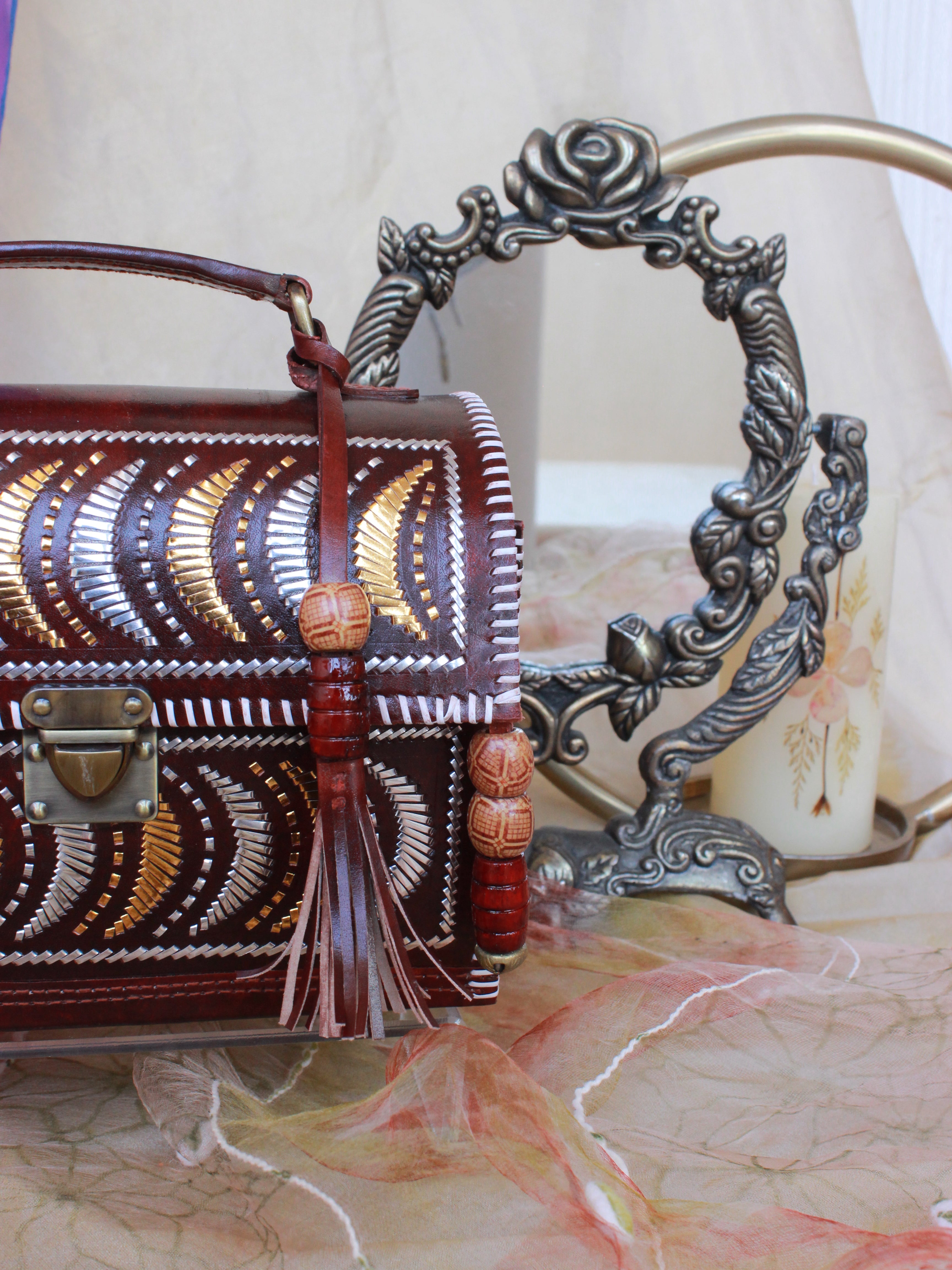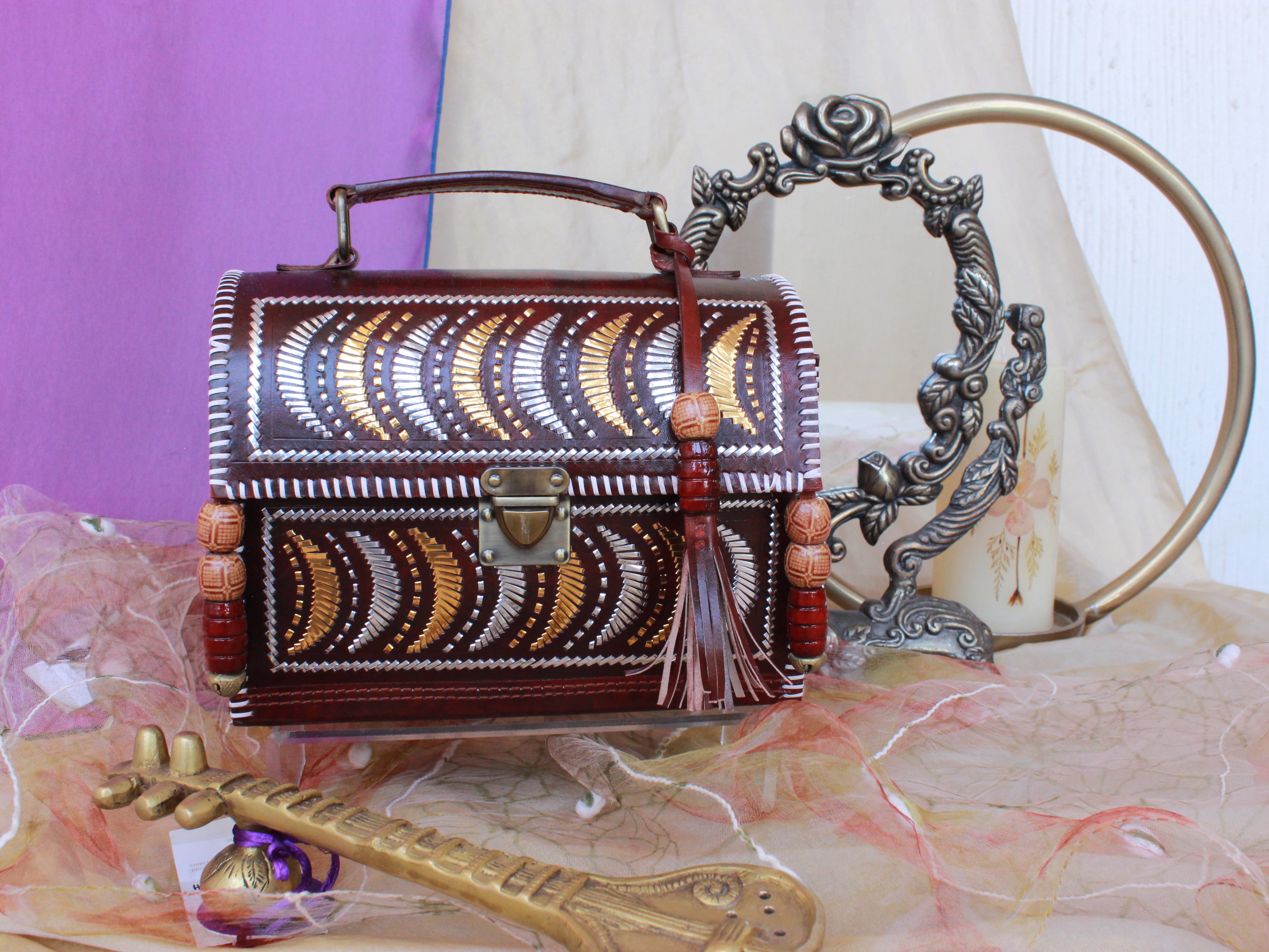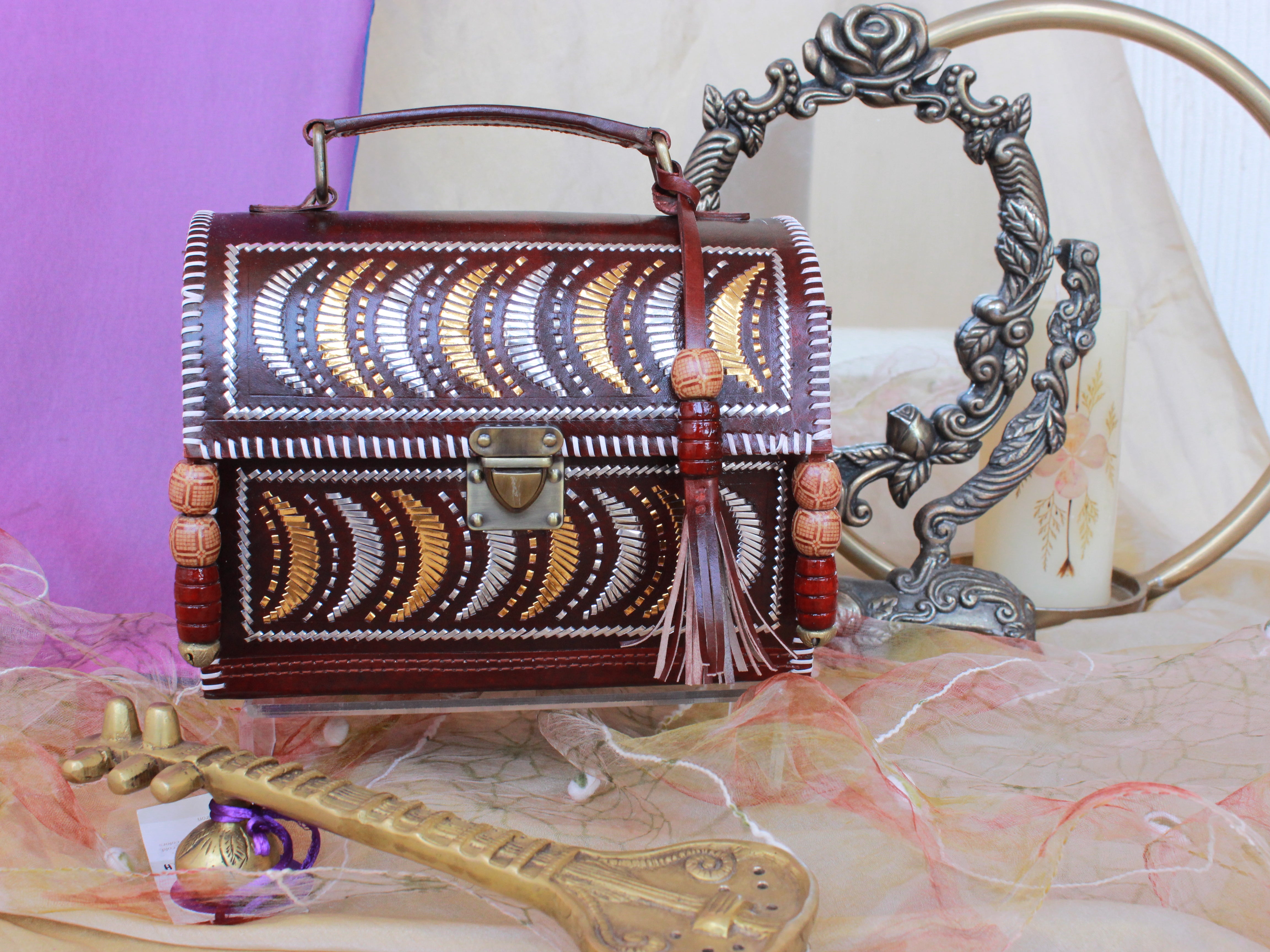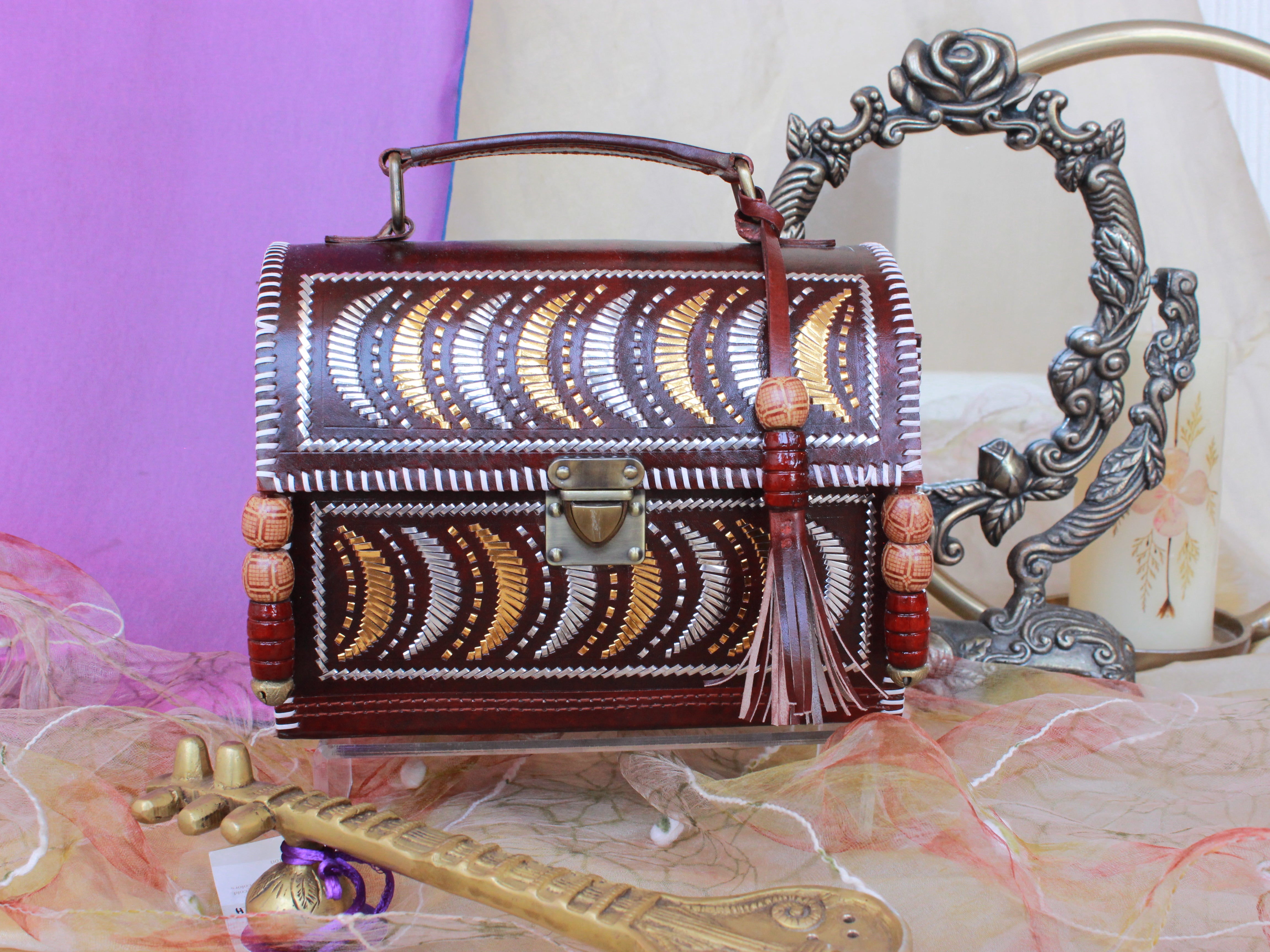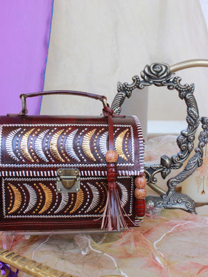 Elevate your style with Romaani's Ardh Chandra Zari Bag, handcrafted from premium brown leather and adorned with intricate gold and silver zari embroidery. The intricate hand embroidery forms the unique Ardh Chandra (Half-Moon) design, symbolic of celestial beauty.A masterpiece from Kutch, this bag blends tradition with modern luxury, making it a versatile and timeless accessory.