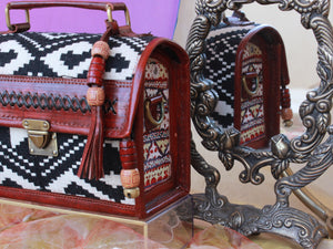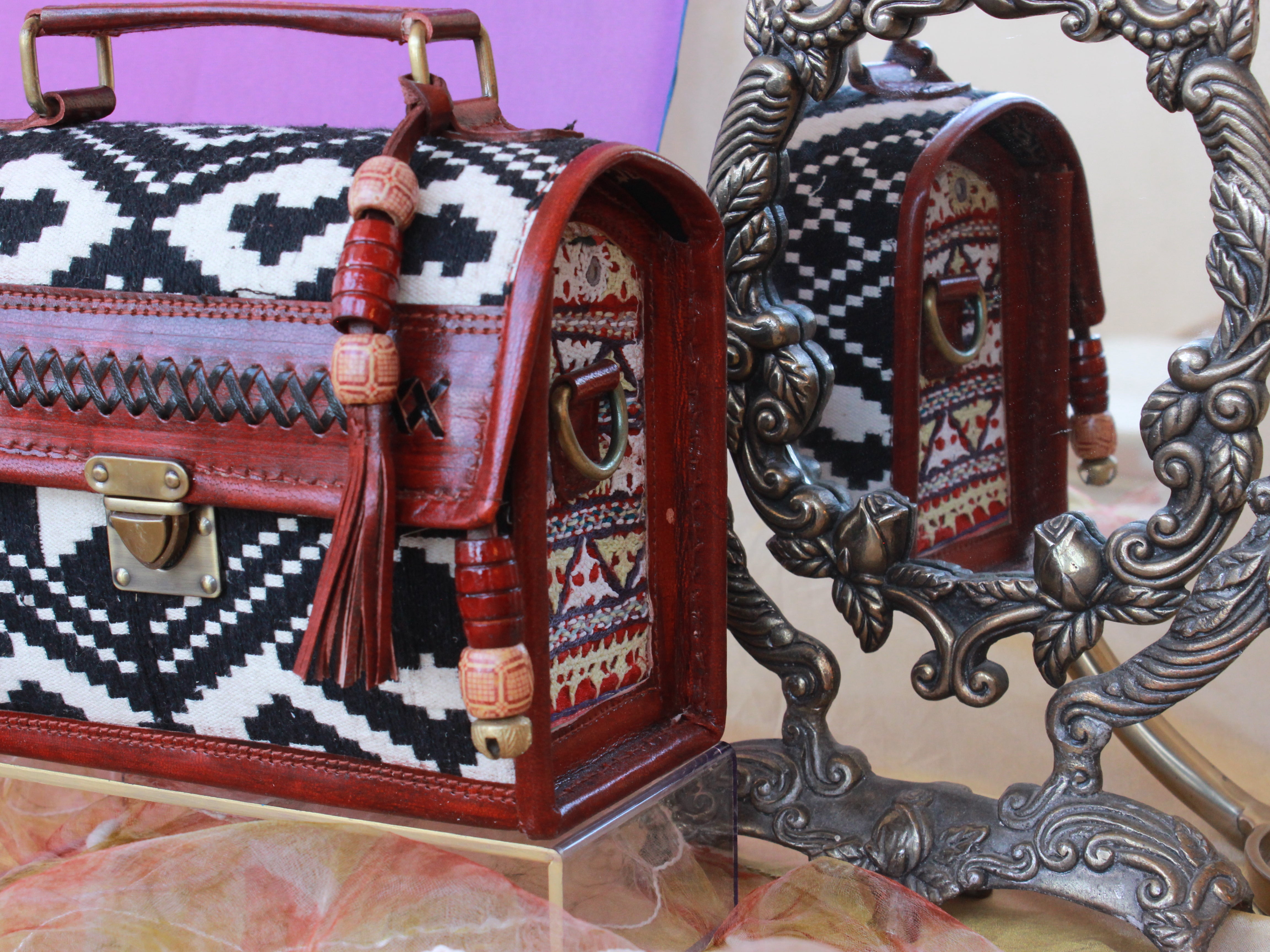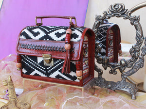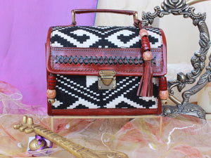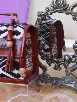Handcrafted from premium leather, this versatile piece blends tradition with modern luxury. The intricate jacquard design adds a touch of sophistication, making it a timeless accessory. Lined with Ajrakh fabric for a boho-luxe feel, this bag can be carried as a handheld piece or worn as a sling with its additional strap.
