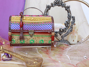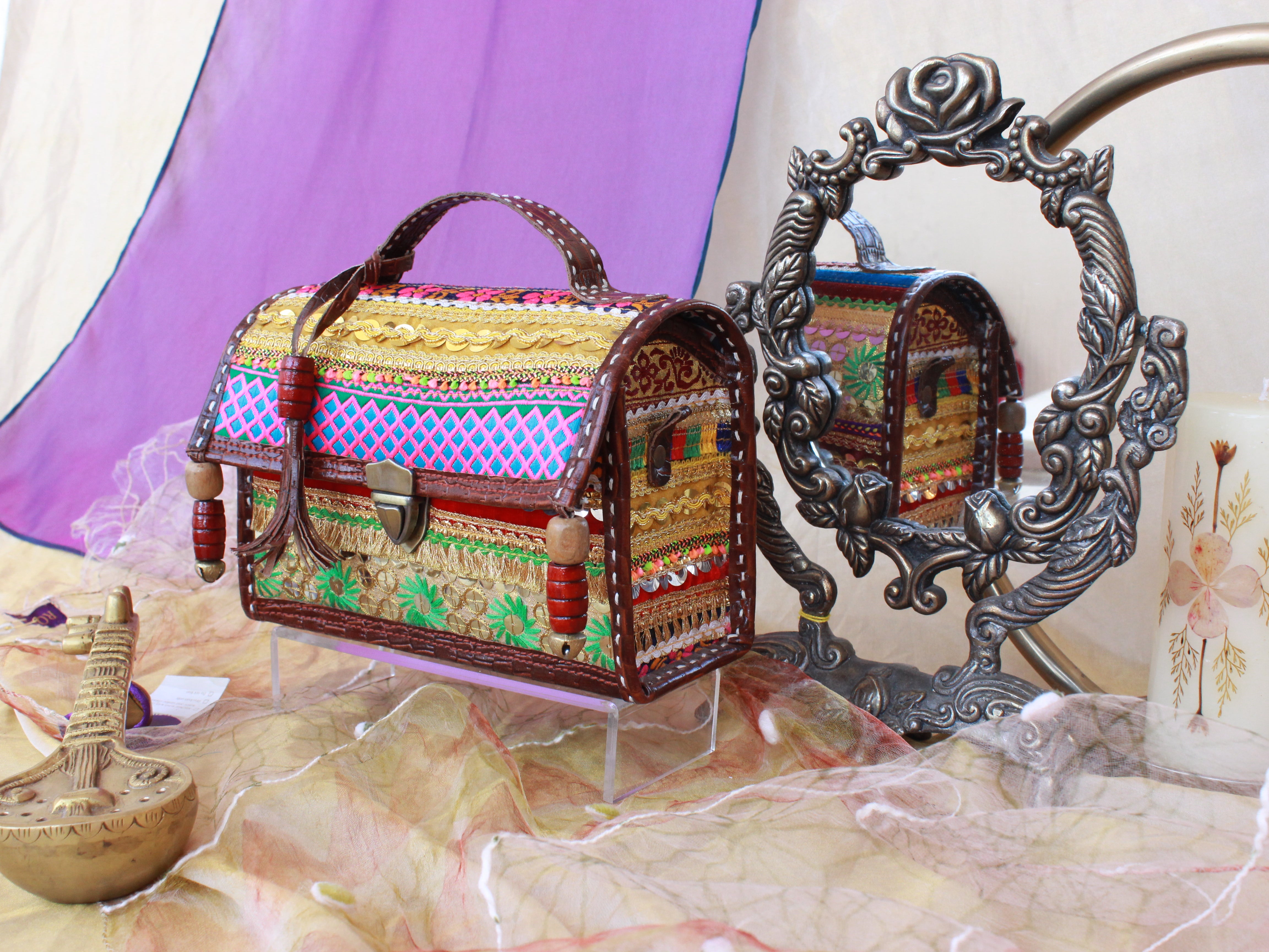Brighten your wardrobe with Romaani's Multicolor Patchwork Box Bag. Handcrafted from premium leather and covered in vibrant patchwork, this bag is a celebration of color and craftsmanship. The Ajrakh-lined interior adds a boho-luxe touch, and the bag offers the versatility of being used as a handheld piece or a sling with its additional strap.