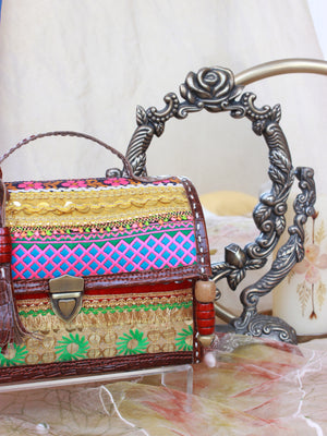 Brighten your wardrobe with Romaani's Multicolor Patchwork Box Bag. Handcrafted from premium leather and covered in vibrant patchwork, this bag is a celebration of color and craftsmanship. The Ajrakh-lined interior adds...