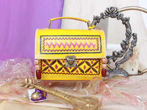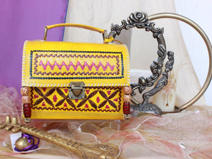 Step into elegance with Romaani's Nakshatriya Yellow Box Bag, intricately embroidered in a criss-cross starry pattern with brown and maroon leather. This bag, inspired by celestial beauty, combines traditional craftsmanship with modern design. Lined with Ajrakh fabric for a boho-luxe feel, it can be used as a handheld piece or worn as a sling with its additional strap.