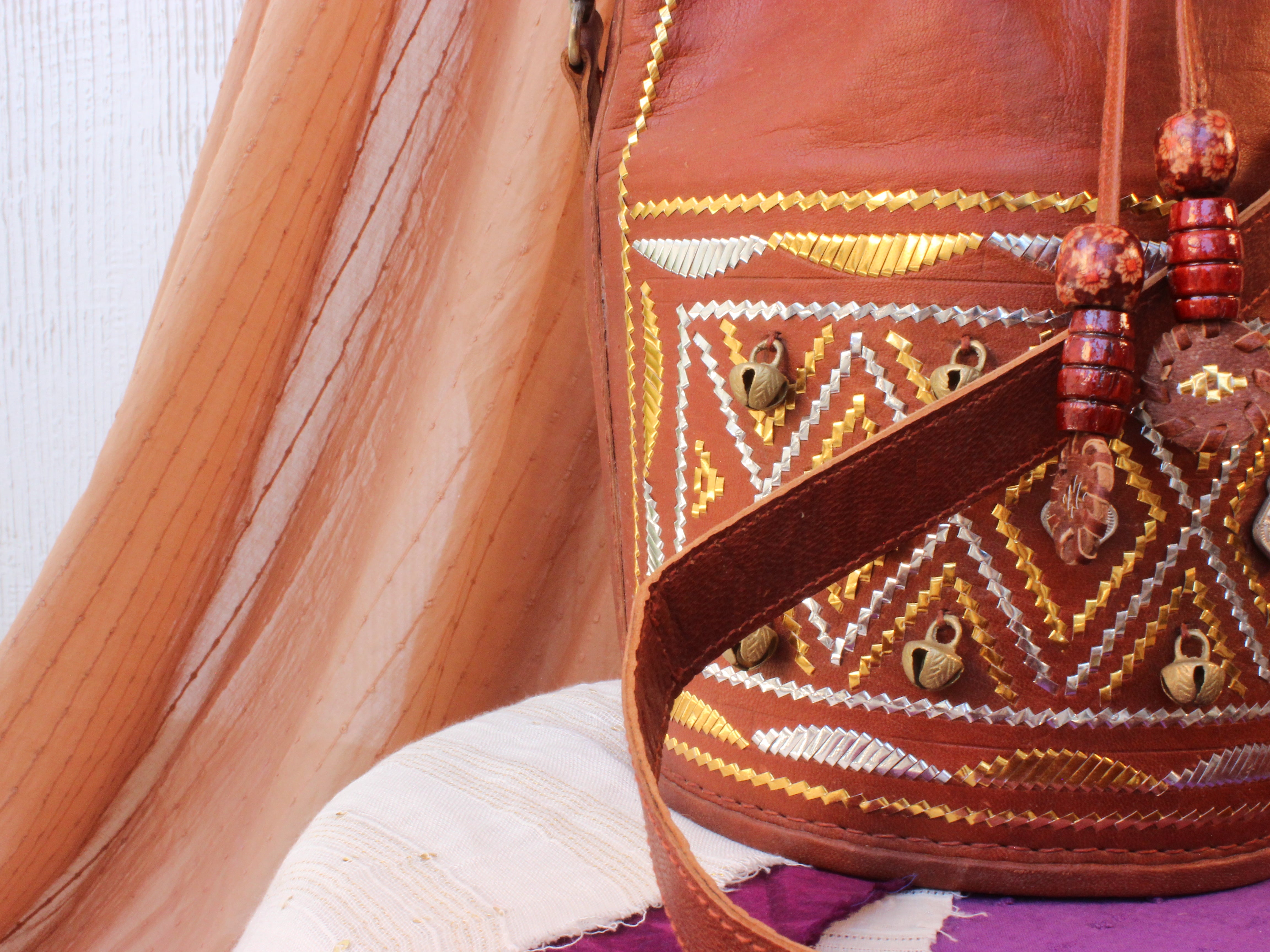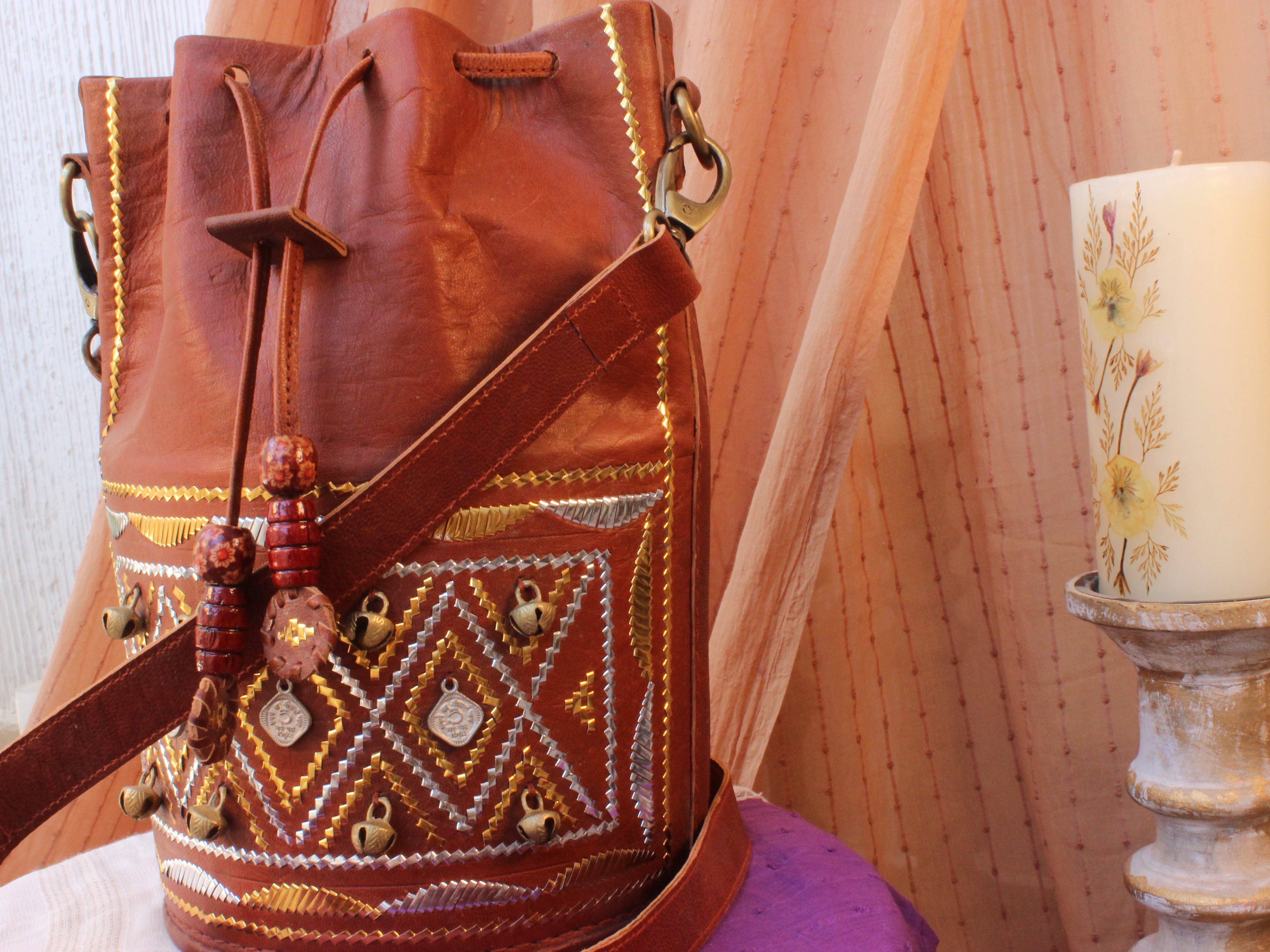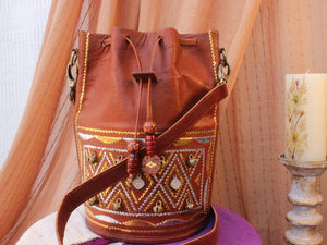 Embrace tradition with Romaani's Brown Leather Bucket Bag, exquisitely embroidered with zari and adorned with ghunghroo attachments. This handcrafted piece blends the beauty of traditional craftsmanship with contemporary design. The Ajrakh-lined interior adds a luxurious touch, making it the perfect boho-luxe accessory.