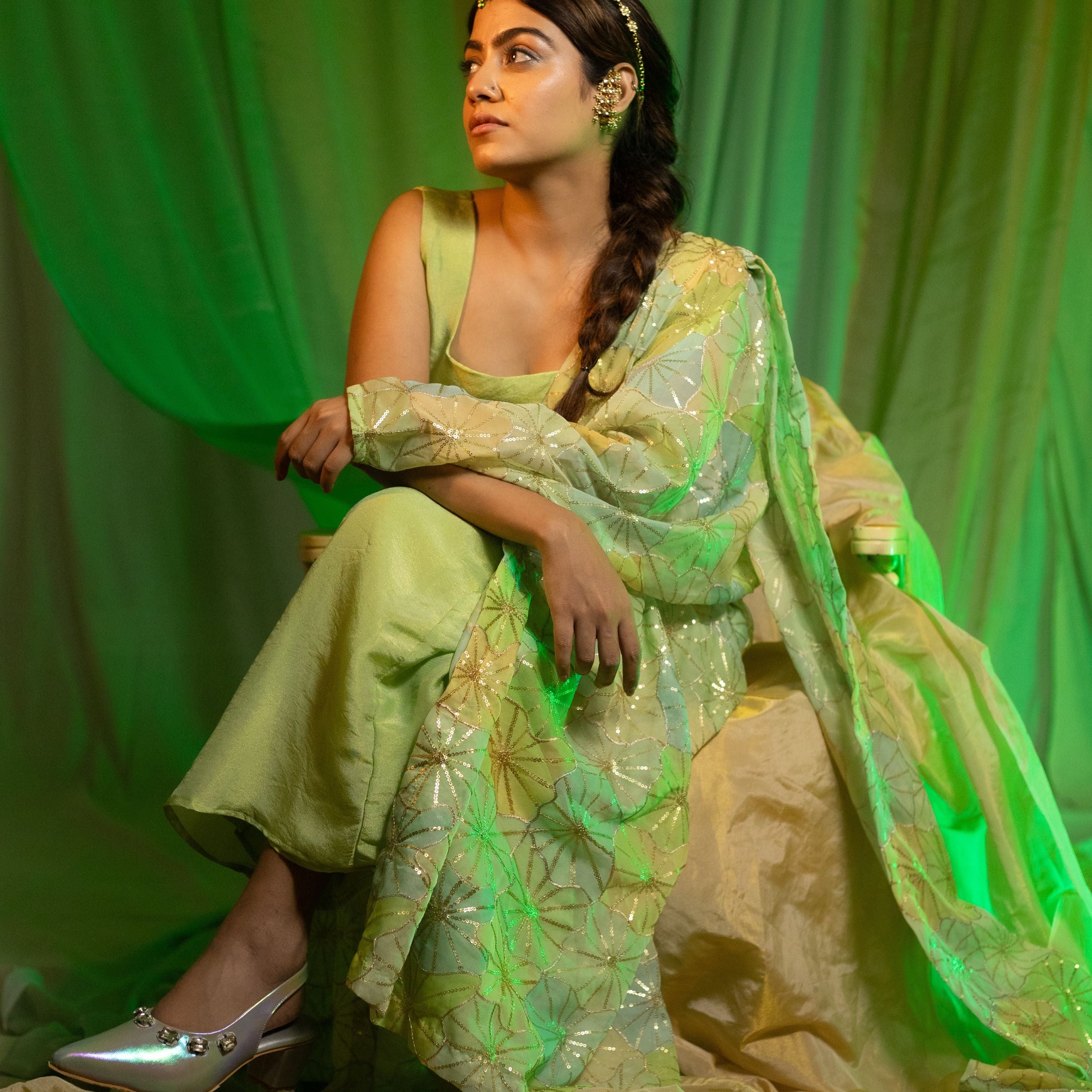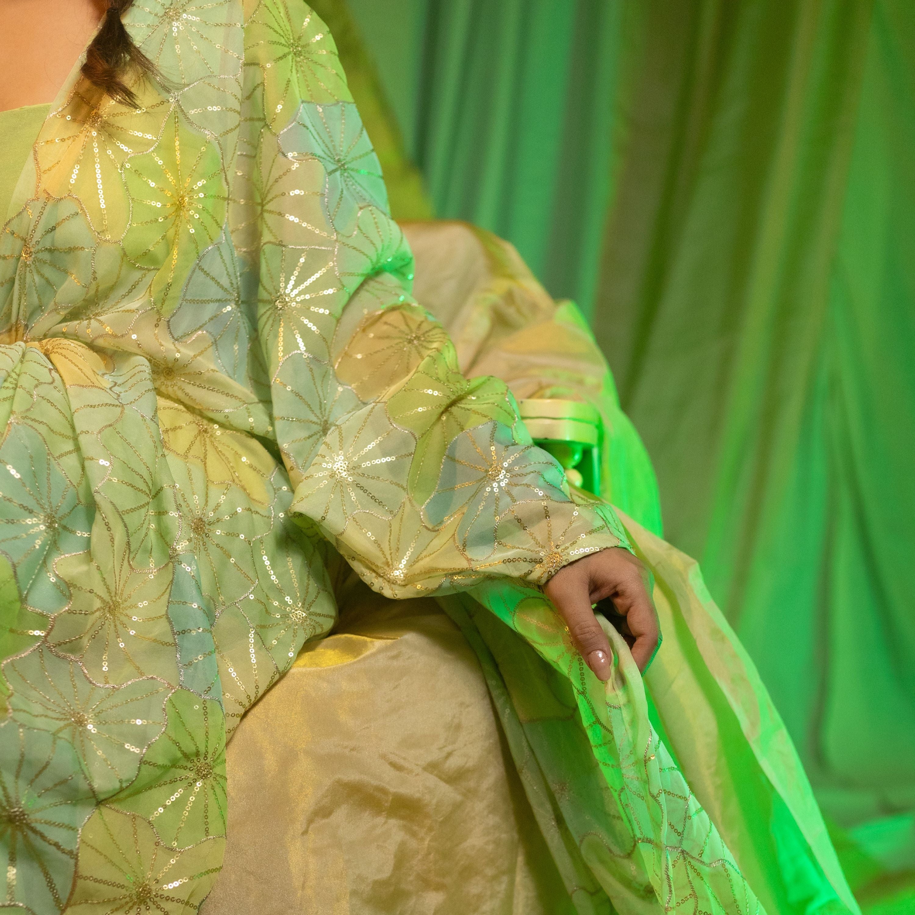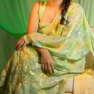 Elevate your wardrobe with the Barkha Saree Drape, crafted in luxurious embroidered georgette. The soothing shades of Mint Blue and Mint Green create a refreshing, airy look that’s perfect for daytime celebrations and intimate gatherings.