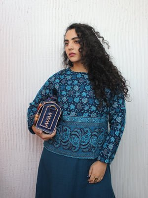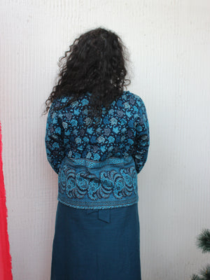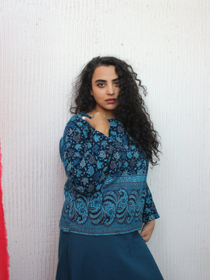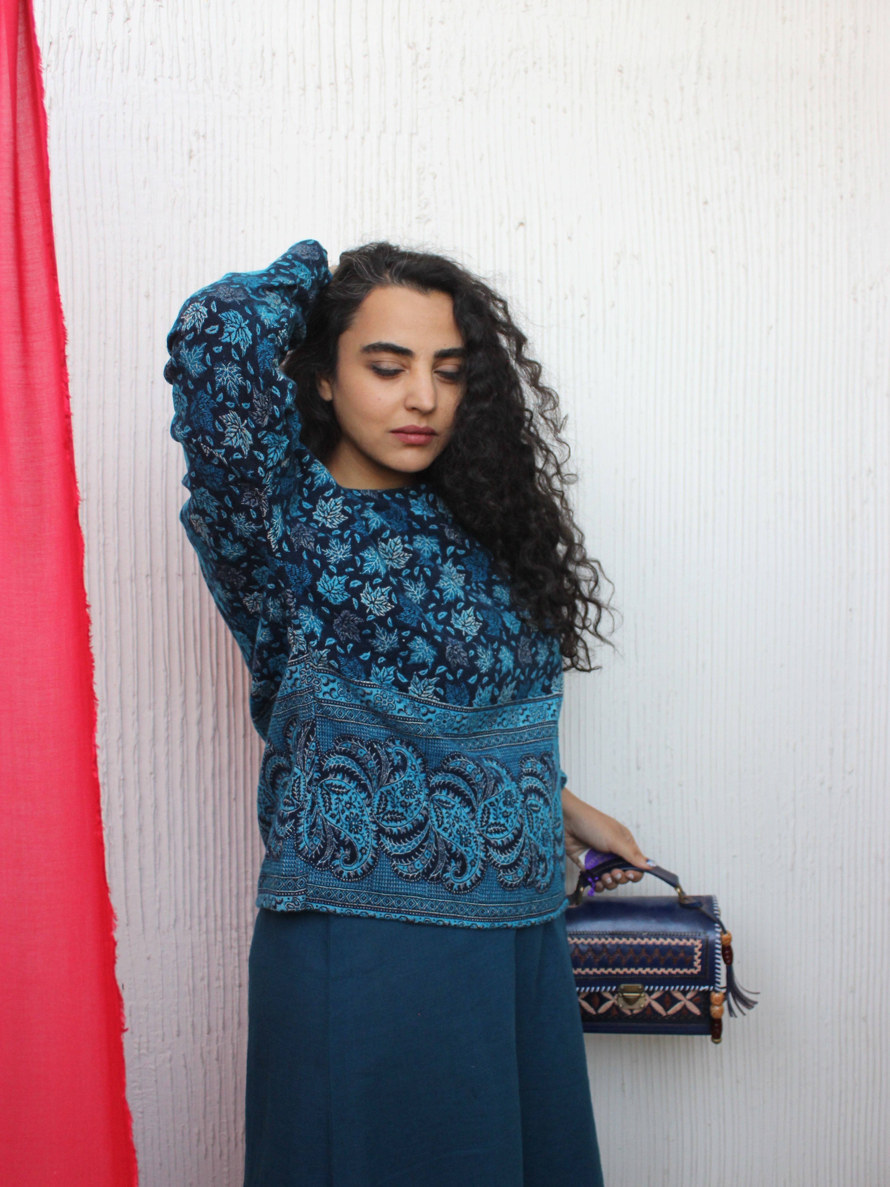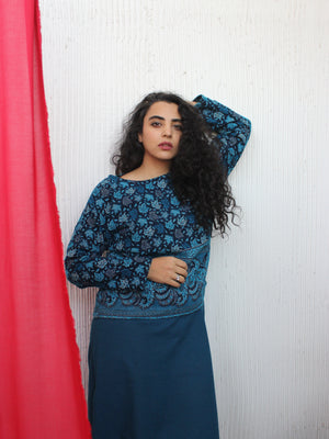 Wrap yourself in the warmth of the Neelika Top, a blue woollen creation crafted from shawl-like fabric adorned with elegant leaf patterns. Its soft texture and relaxed silhouette make it a versatile addition to your winter wardrobe, blending comfort with style effortlessly. Pair it with denims or wide-leg pants for a timeless look. See the last image for size chart.