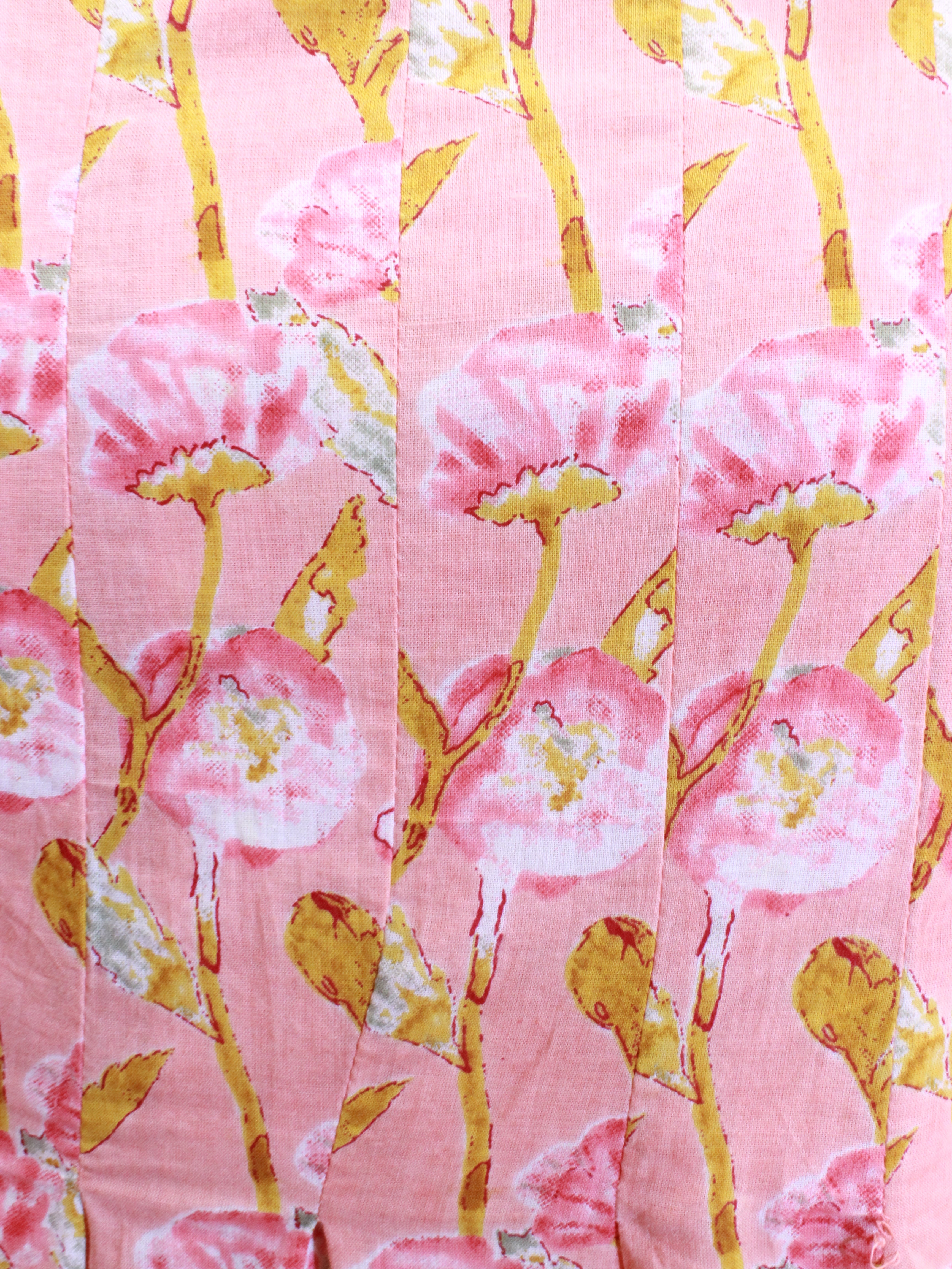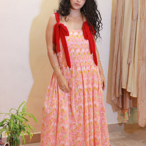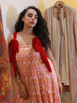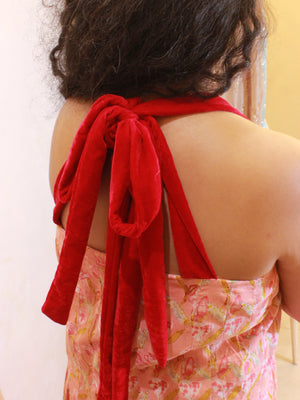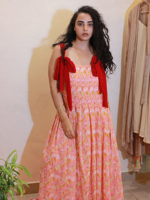 In pink hand-blocked cotton, this velvet dress with shoulder-tie straps and box pleats is a unique piece for day or night events. Ships within 5-7 working days.