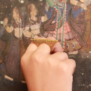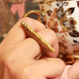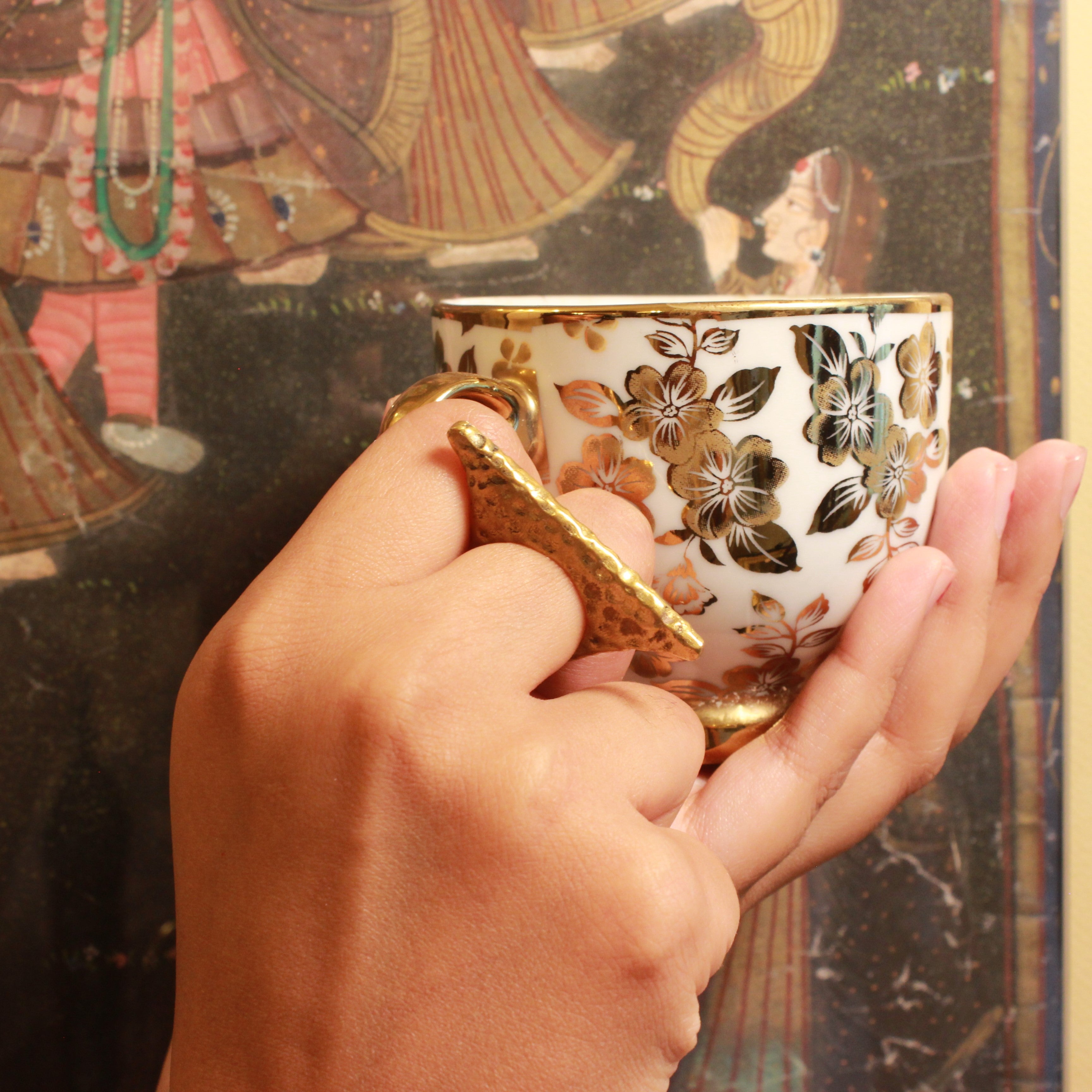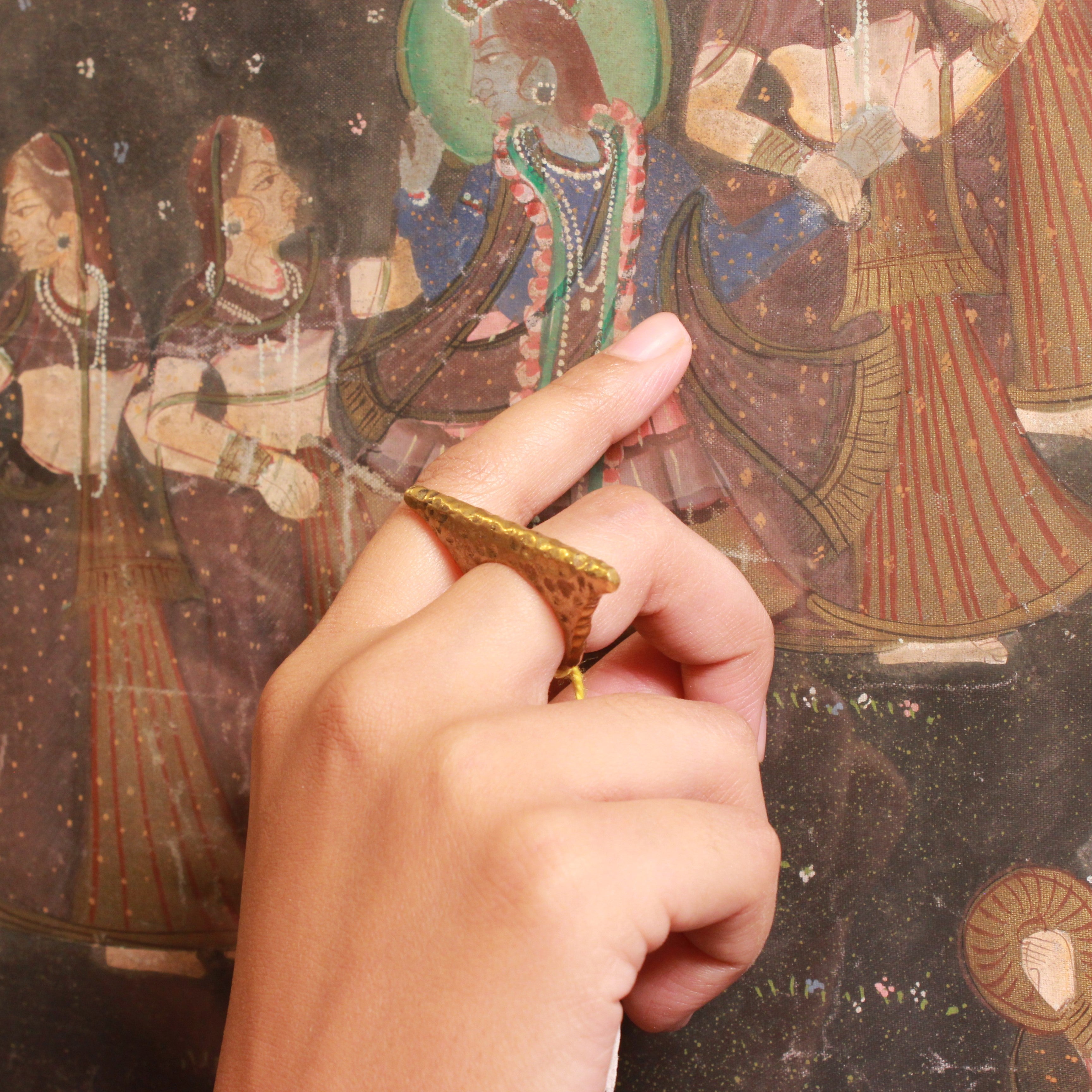 The Ring is a hammered brass masterpiece shaped into a bold triangular form. This modern piece makes a subtle yet striking statement.