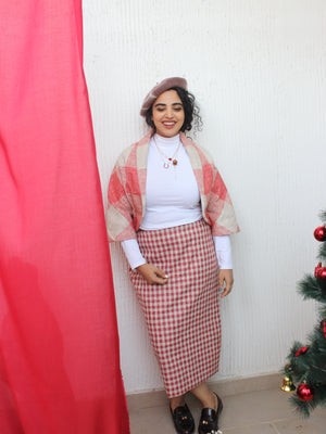 The Ruby Checkered Skirt is a chic pencil skirt crafted from jute in a striking red and white checkered pattern. Designed for a flattering fit, this piece is perfect for making a bold statement, whether paired with a crisp shirt for work or a cozy sweater for casual outings. See the last image for size chart.