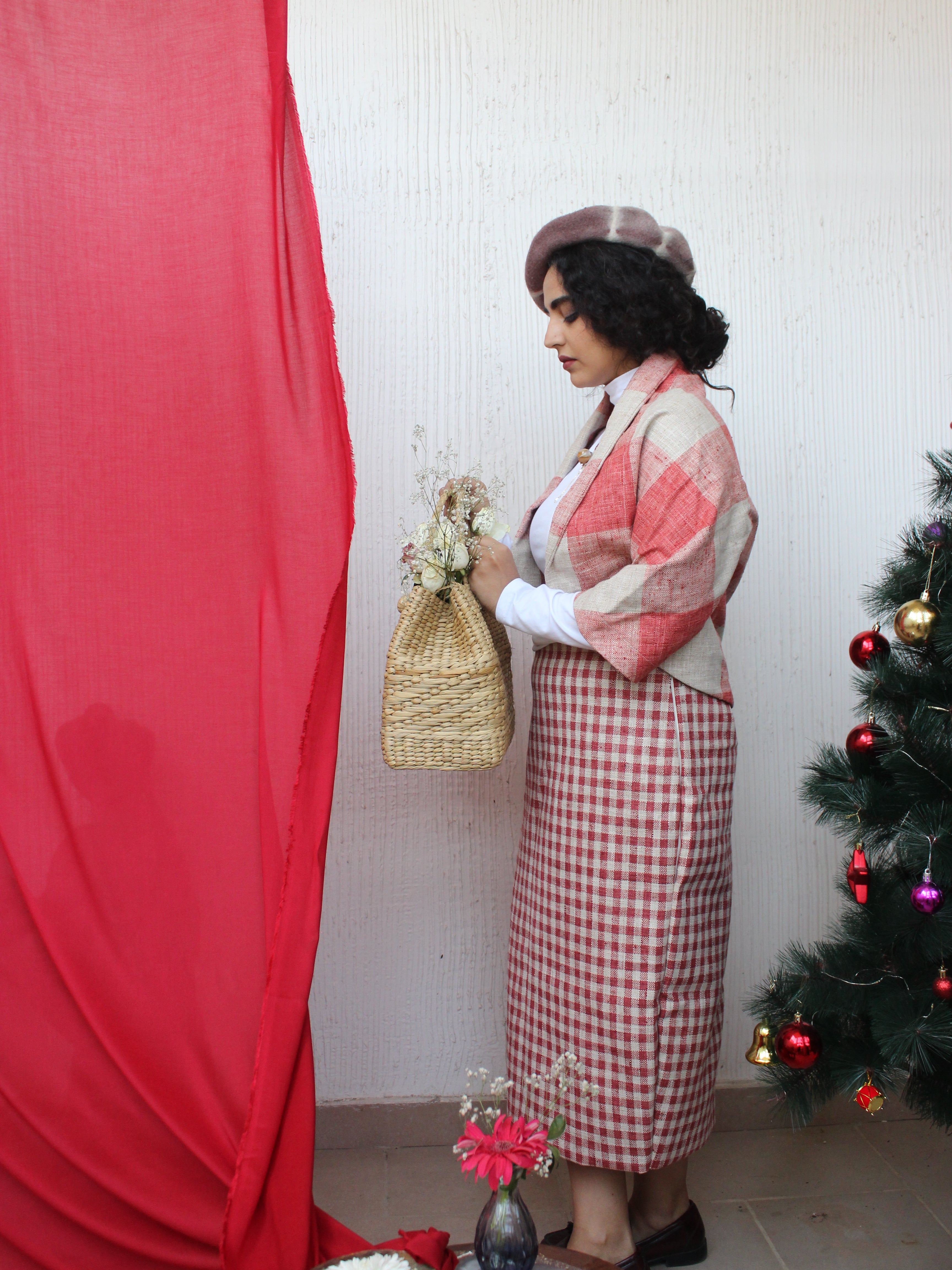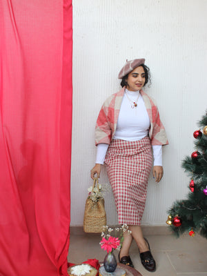 The Ruby Checkered Skirt is a chic pencil skirt crafted from jute in a striking red and white checkered pattern. Designed for a flattering fit, this piece is perfect for making...