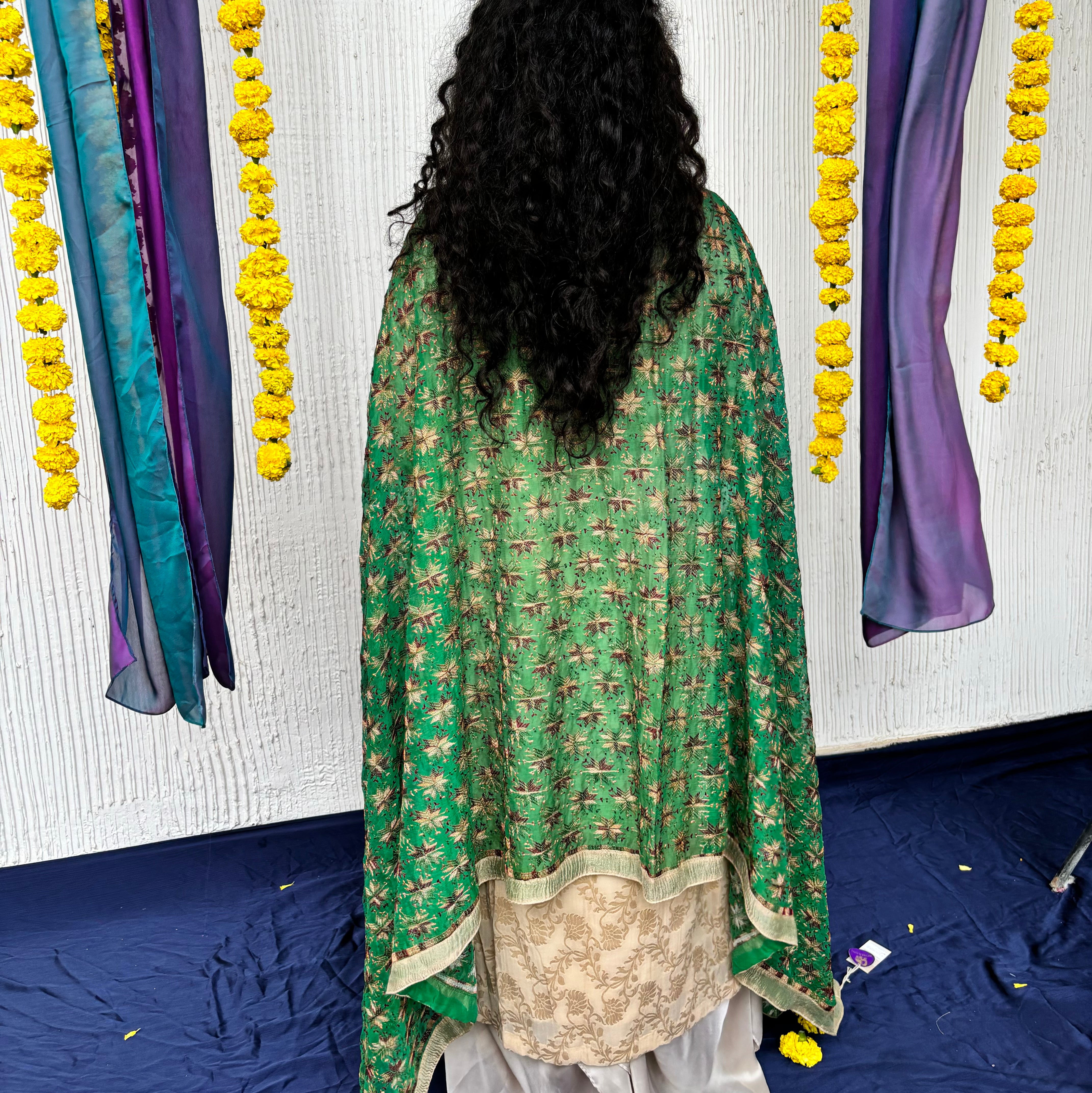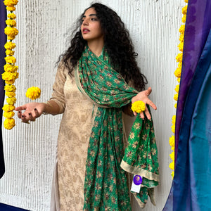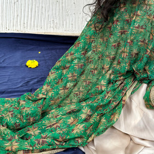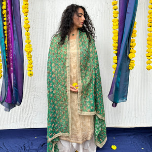 Discover the timeless beauty of our Green Phulkari Dupatta, a masterpiece of ancient craftsmanship from Amritsar. This exquisite piece showcases a smaller all-over pattern in rich maroon and beige, intricately hand-embroidered with luxurious silk threads. The delicate artistry of Phulkari, a technique with deep roots in Punjab's heritage, brings a touch of tradition and elegance to your wardrobe.