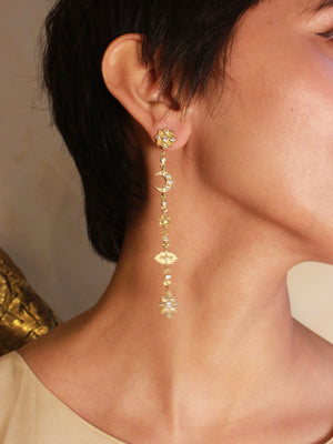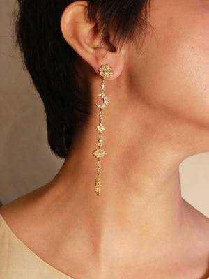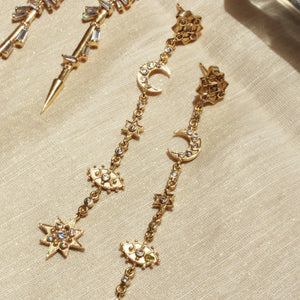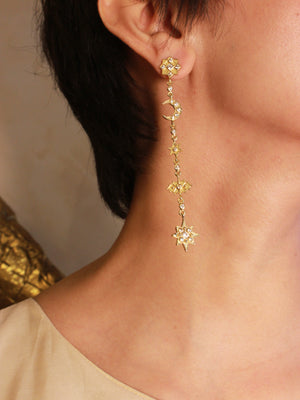 The Grahan Danglers inspired by eclipse are delicate brass earrings featuring moon and star motifs, elegantly encrusted with CZ stones. These celestial-inspired danglers capture the beauty of the night sky, adding a touch of magic to your look. Perfect for festive occasions or evening outings.