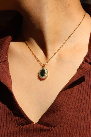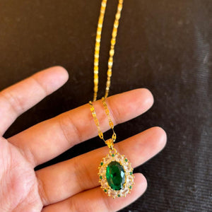 The Harita Emerald Pendant Necklace is a dainty yet eye-catching piece. Featuring a green stone encased within a CZ-embedded spherical design, this neckpiece adds a touch of subtle elegance to any outfit. Perfect for everyday wear or special moments.