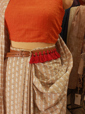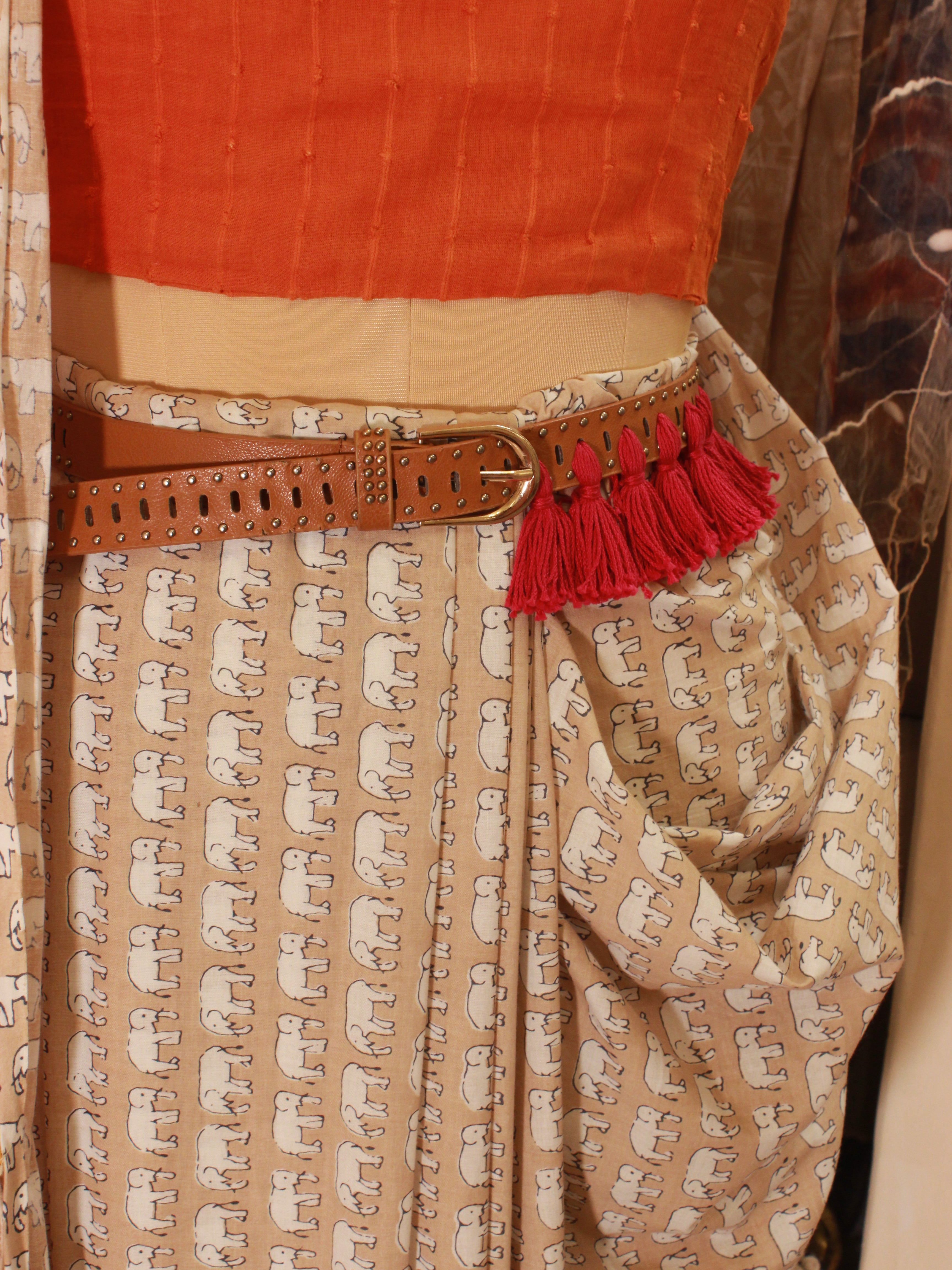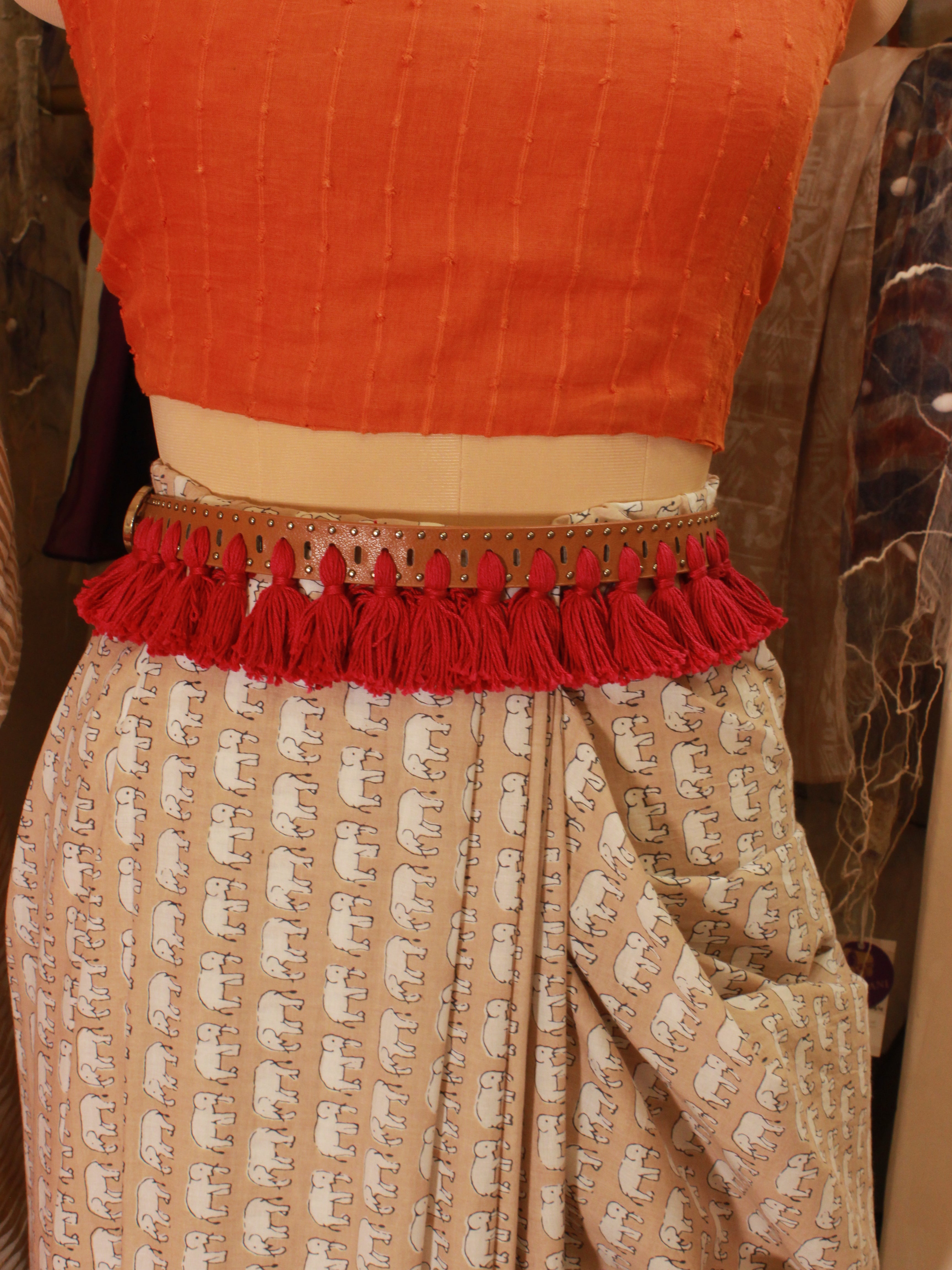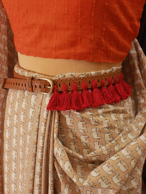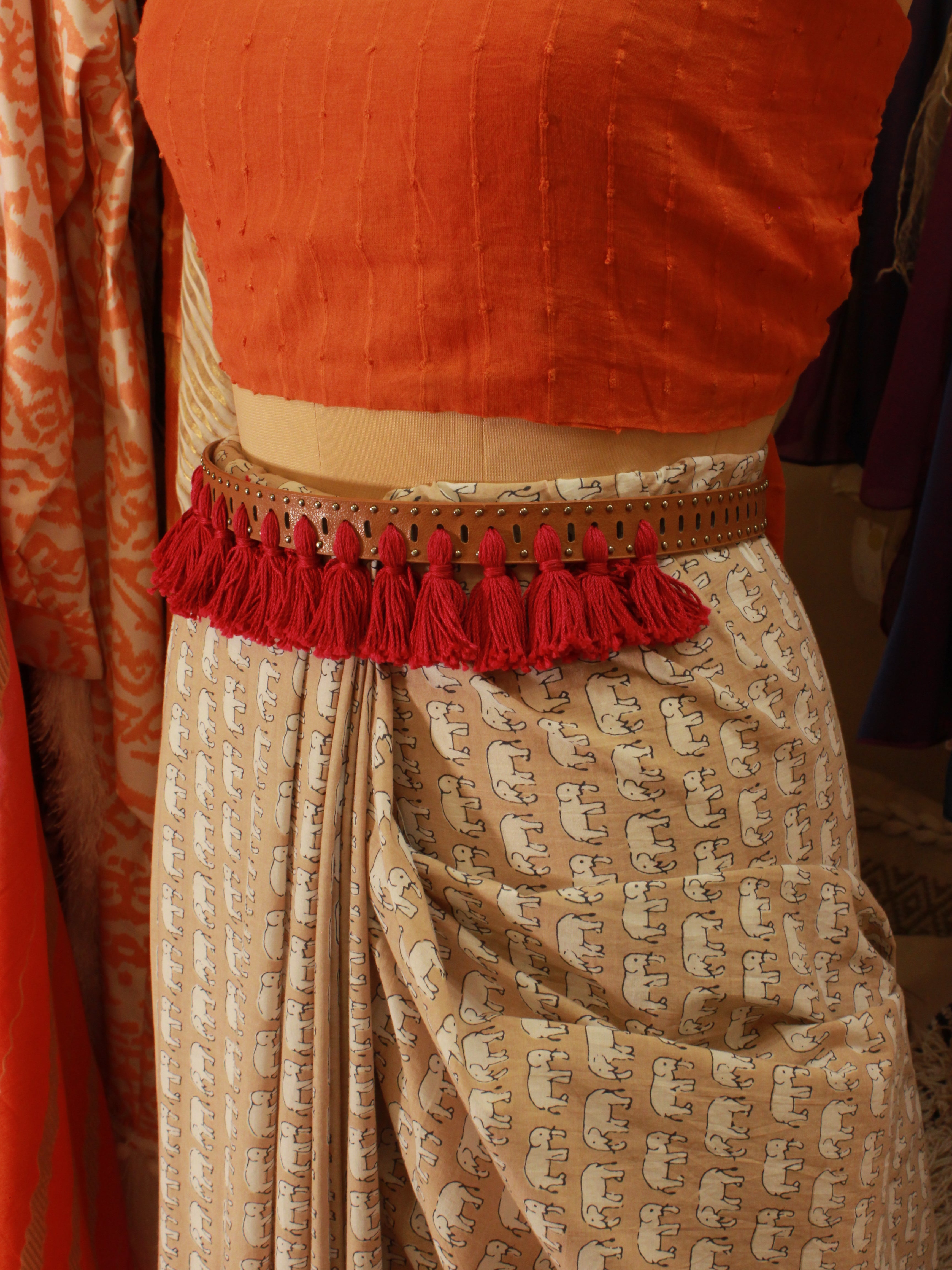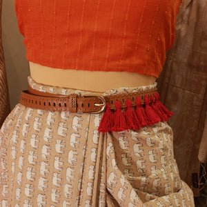 For a playful twist on classic leather, the Tan Leather Belt with Pink Tassels offers a fun, boho-inspired look. Measuring 42" long and 1" broad, the tan brown leather is adorned with small pink tassels tied through holes, paired with a sleek metallic buckle. It's a versatile accessory that adds a splash of color to everyday outfits.