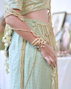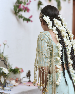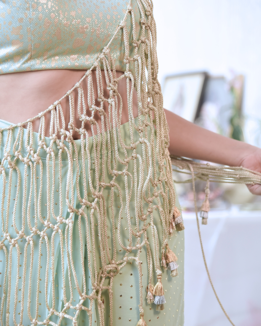 A pre-pleated saree with a hand-knotted macramé pallu in blue, paired with mukaish-style foil pleats and a cheetah-printed blouse.For the woman unafraid of contrast and charisma — easy to wear yet strikingly...