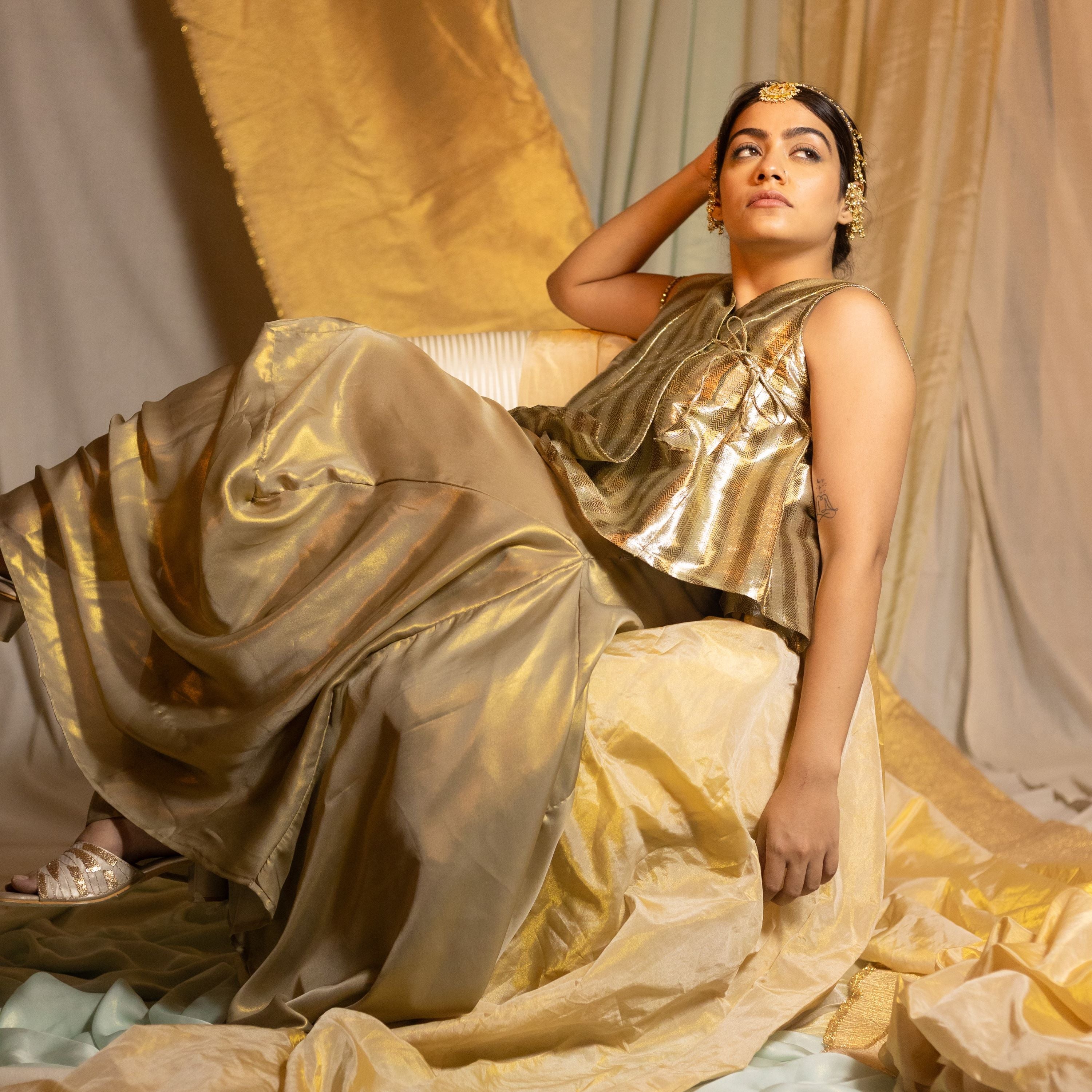 The Heer Dhoti Skirt mirrors the style of the Falak Dhoti Skirt, featuring a beige metallic fabric with a multicolor tasseled belt and embroidered laces. This skirt is perfect for adding...