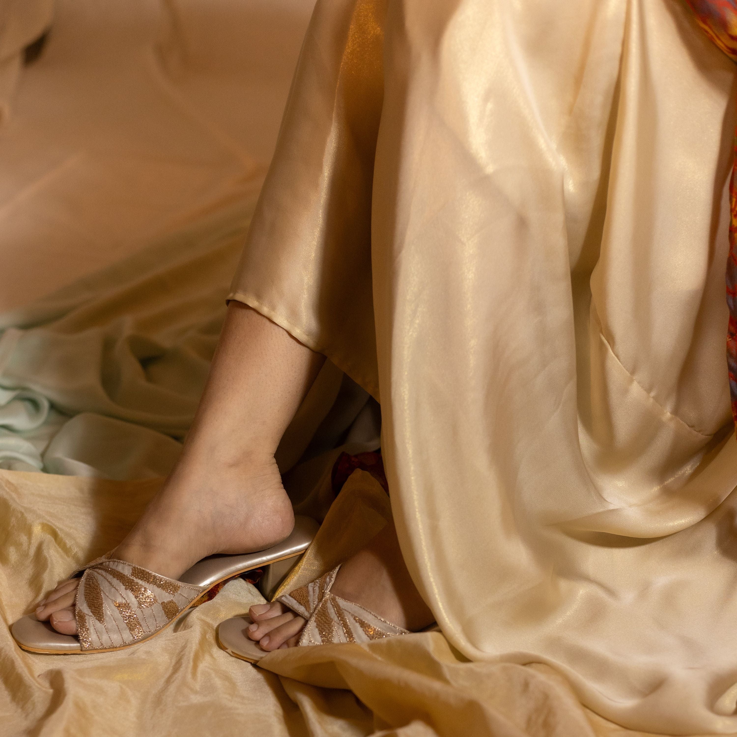 The Heer Dhoti Skirt mirrors the style of the Falak Dhoti Skirt, featuring a beige metallic fabric with a multicolor tasseled belt and embroidered laces. This skirt is perfect for adding a touch of bohemian style to your festive looks. See the last image for size chart.