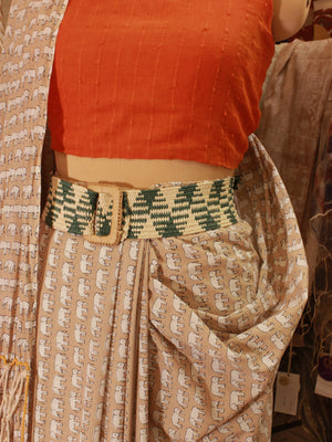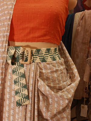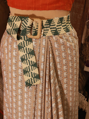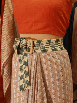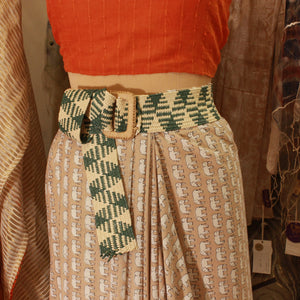 The Green & White Abstract Striped Jute Belt merges bold design with organic materials. This elasticated belt is 50" long and 2.5" broad, featuring a fresh green and white abstract pattern. The straw buckle, sized at 3.5", adds a rustic yet contemporary touch, making this belt an ideal accessory for layering over casual or semi-formal looks.