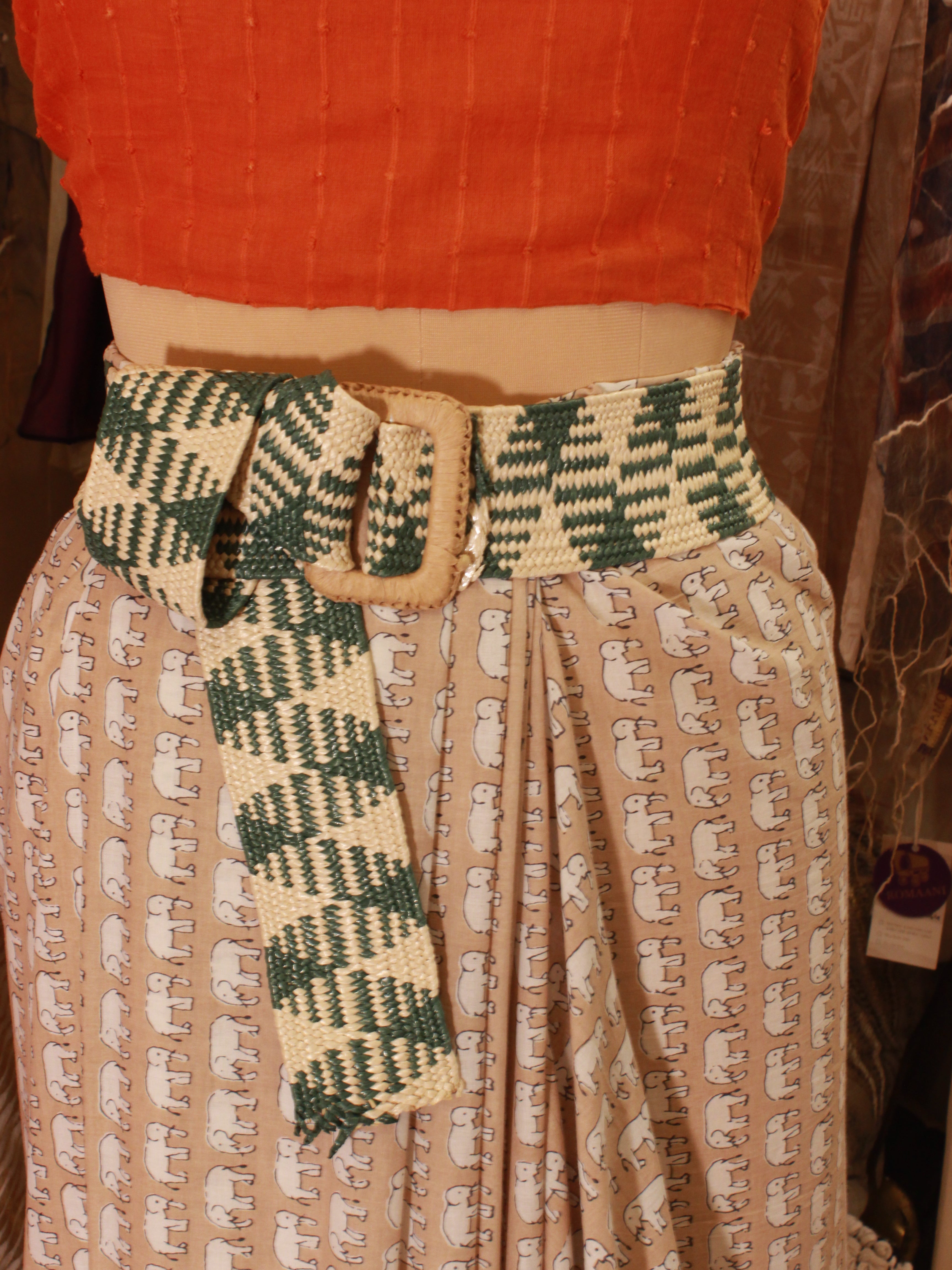 The Green & White Abstract Striped Jute Belt merges bold design with organic materials. This elasticated belt is 50" long and 2.5" broad, featuring a fresh green and white abstract pattern....