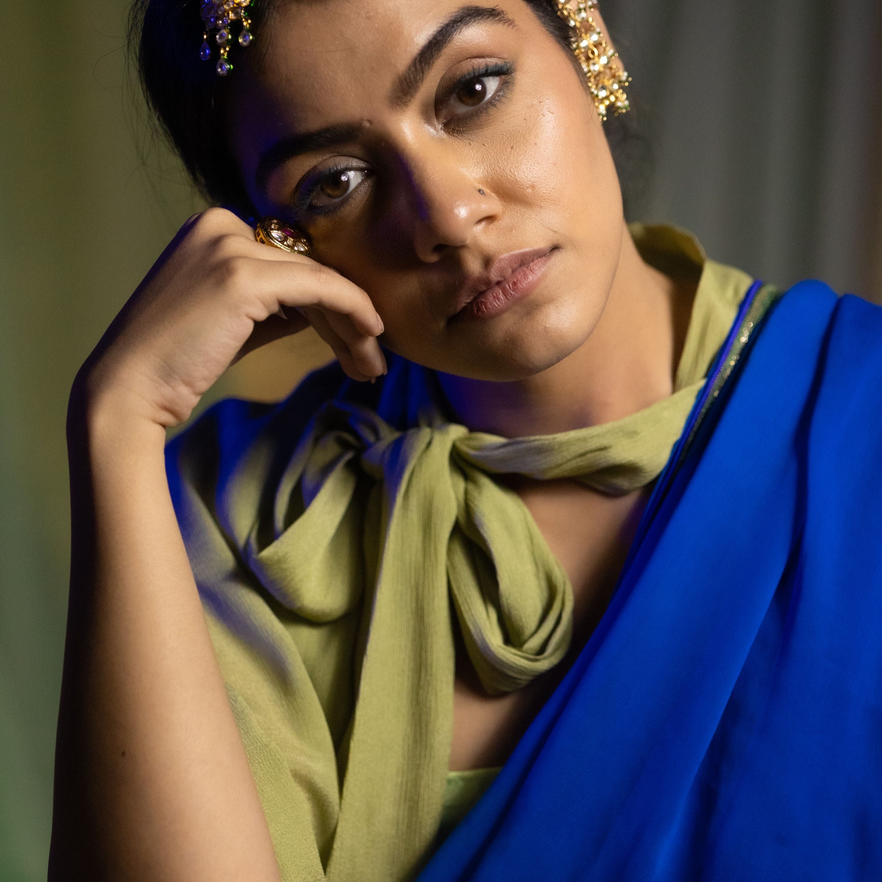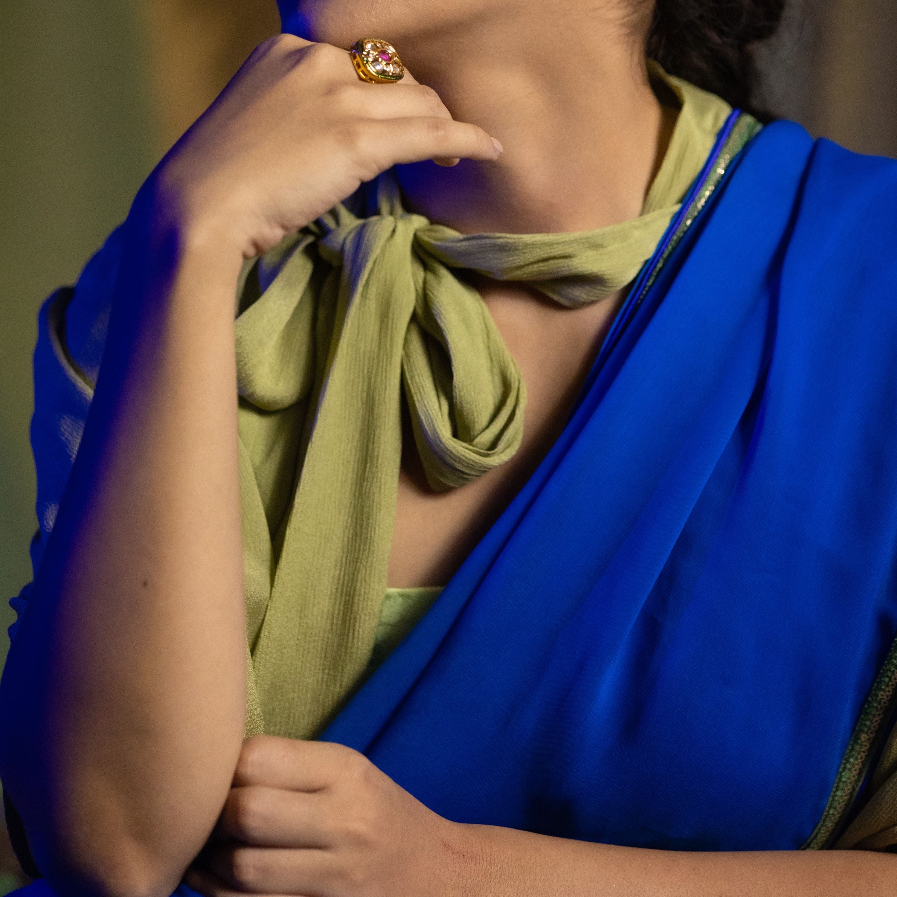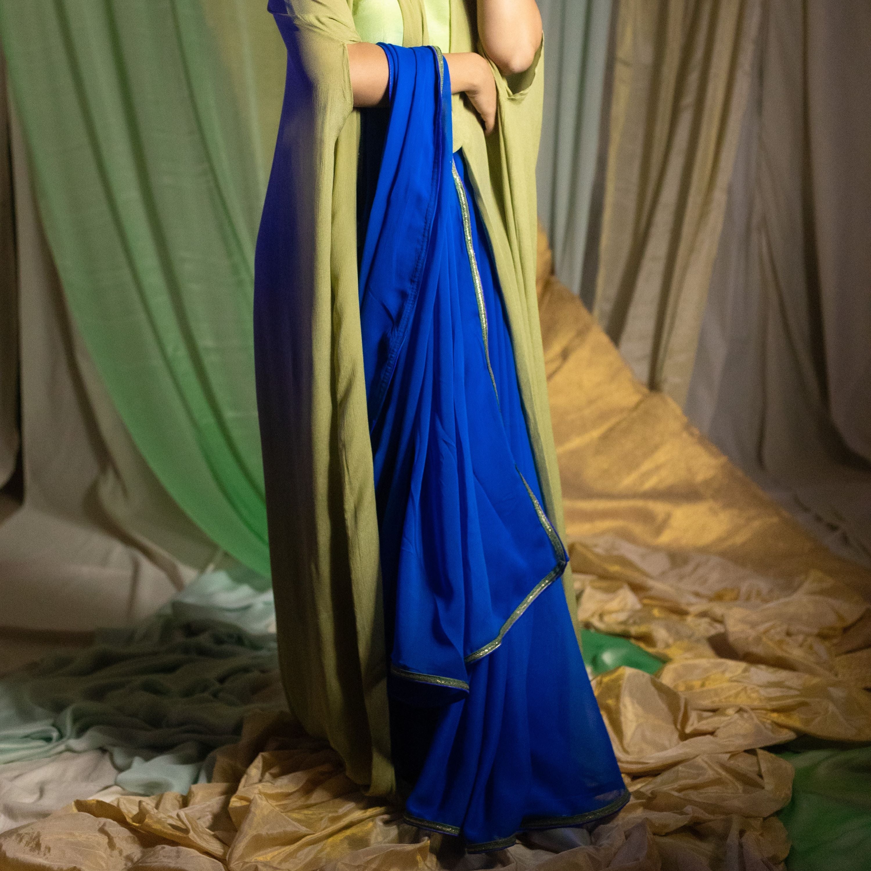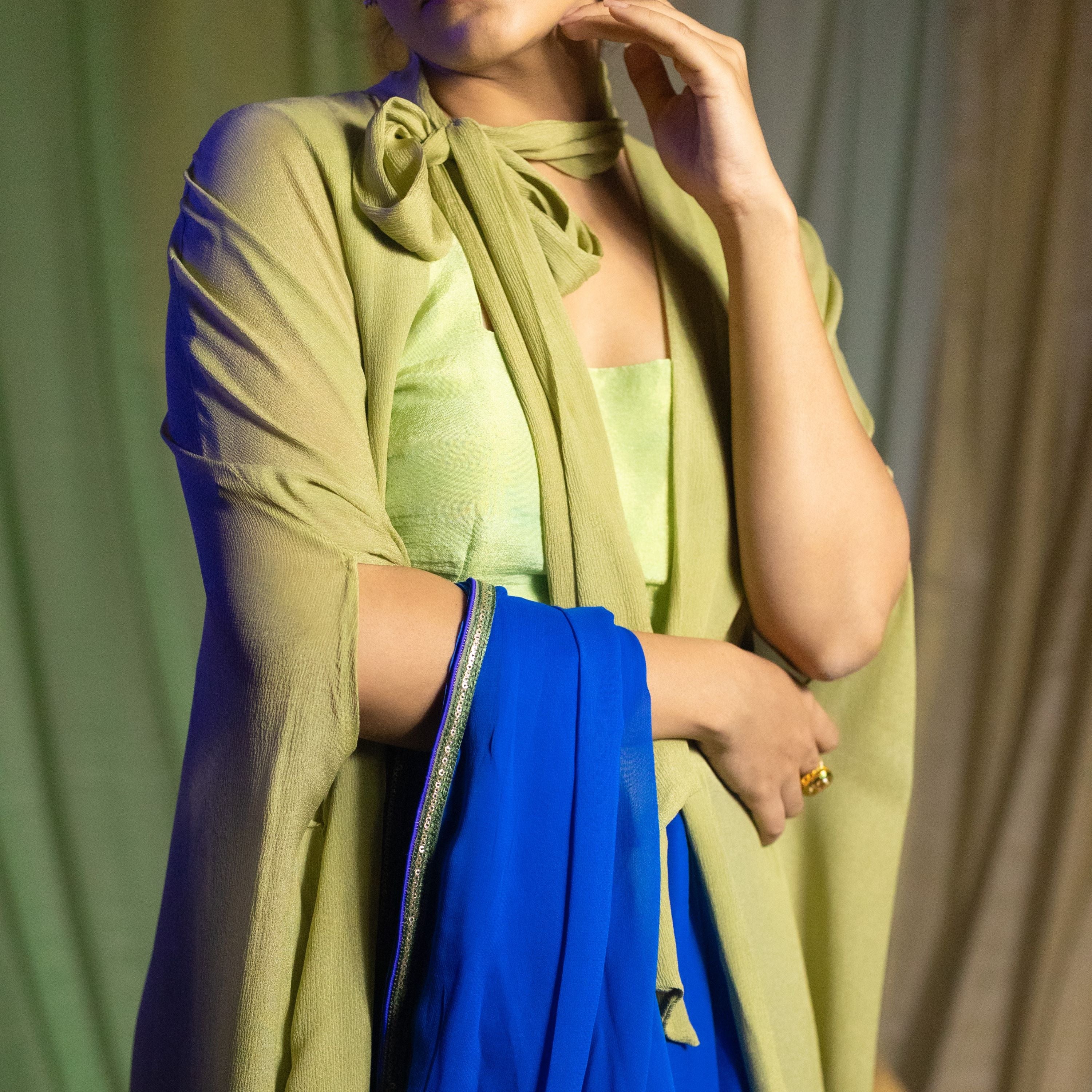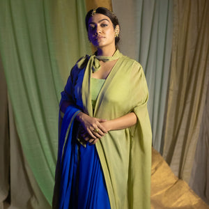 One size fits all. Our Keya Bow Tie Cape in muted green chiffon adds a touch of refined elegance to your outfit. This free-size cape features a classic bow tie design,...