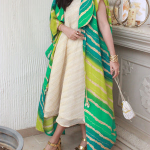 Crafted in pure cotton with shades of green, this oversized jacket features asymmetrical sleeves and golden and white leheriya stripes. The tasseled doris add a traditional touch, making this jacket a...