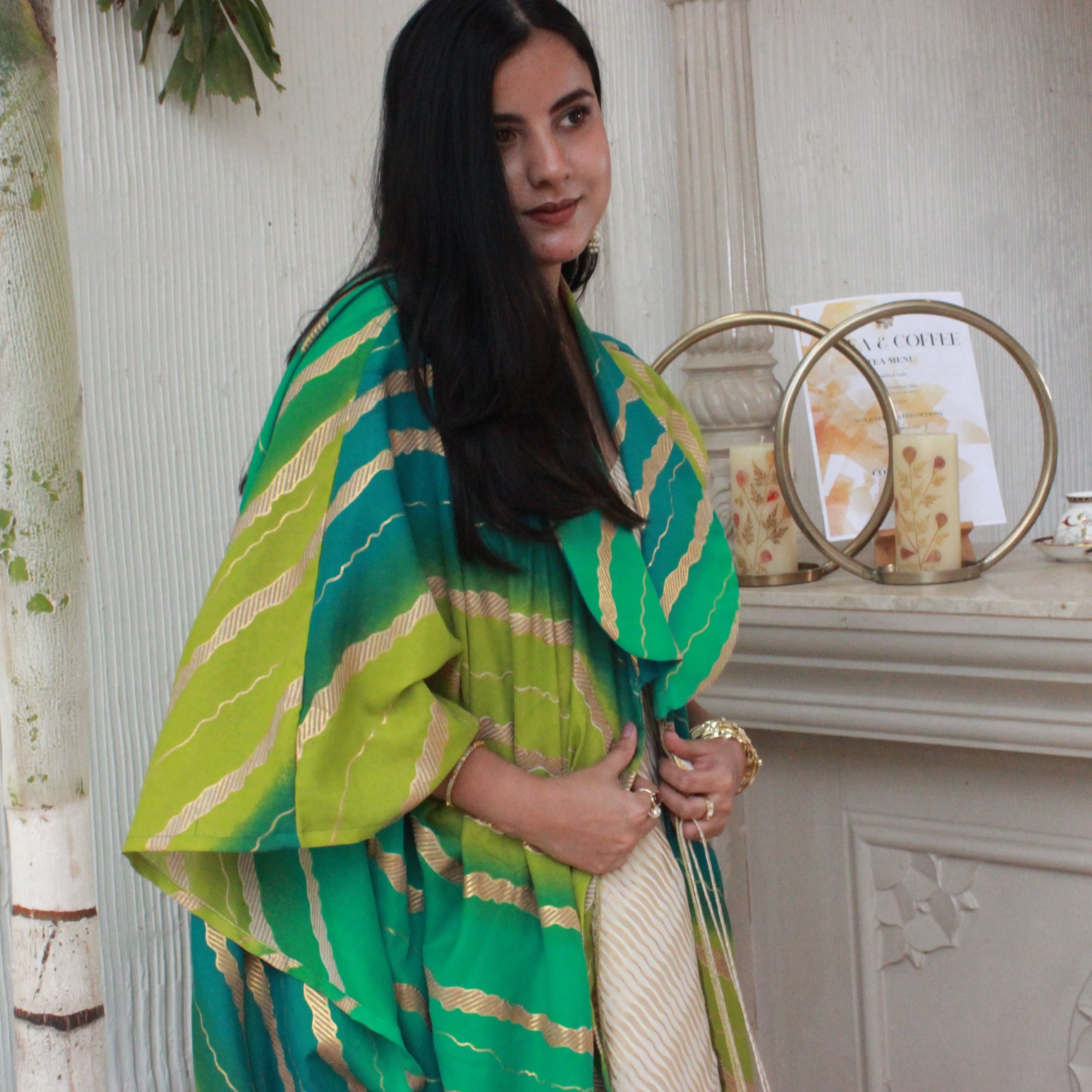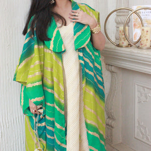Crafted in pure cotton with shades of green, this oversized jacket features asymmetrical sleeves and golden and white leheriya stripes. The tasseled doris add a traditional touch, making this jacket a one-of-a-kind statement piece perfect for layering. (Free size)