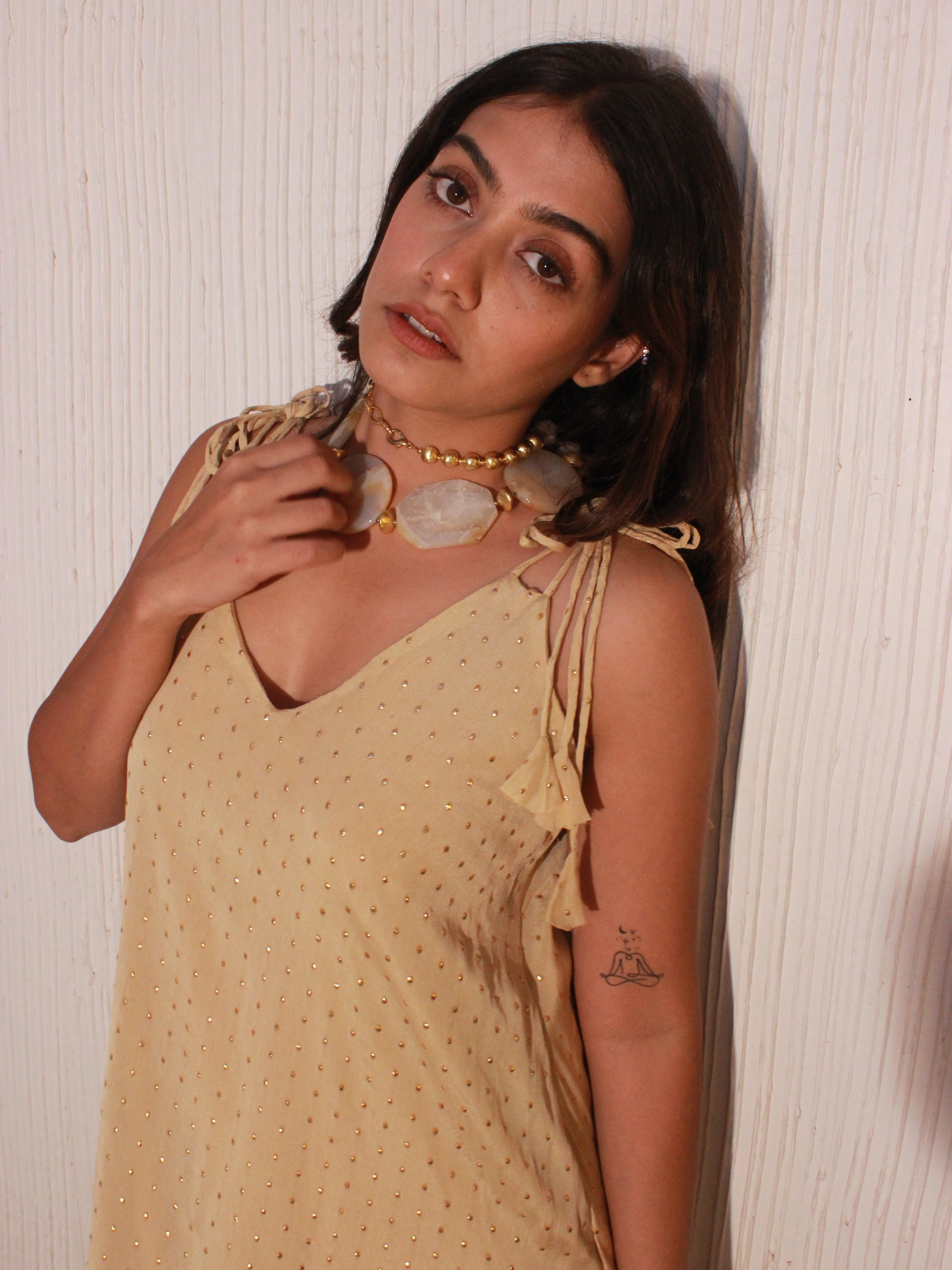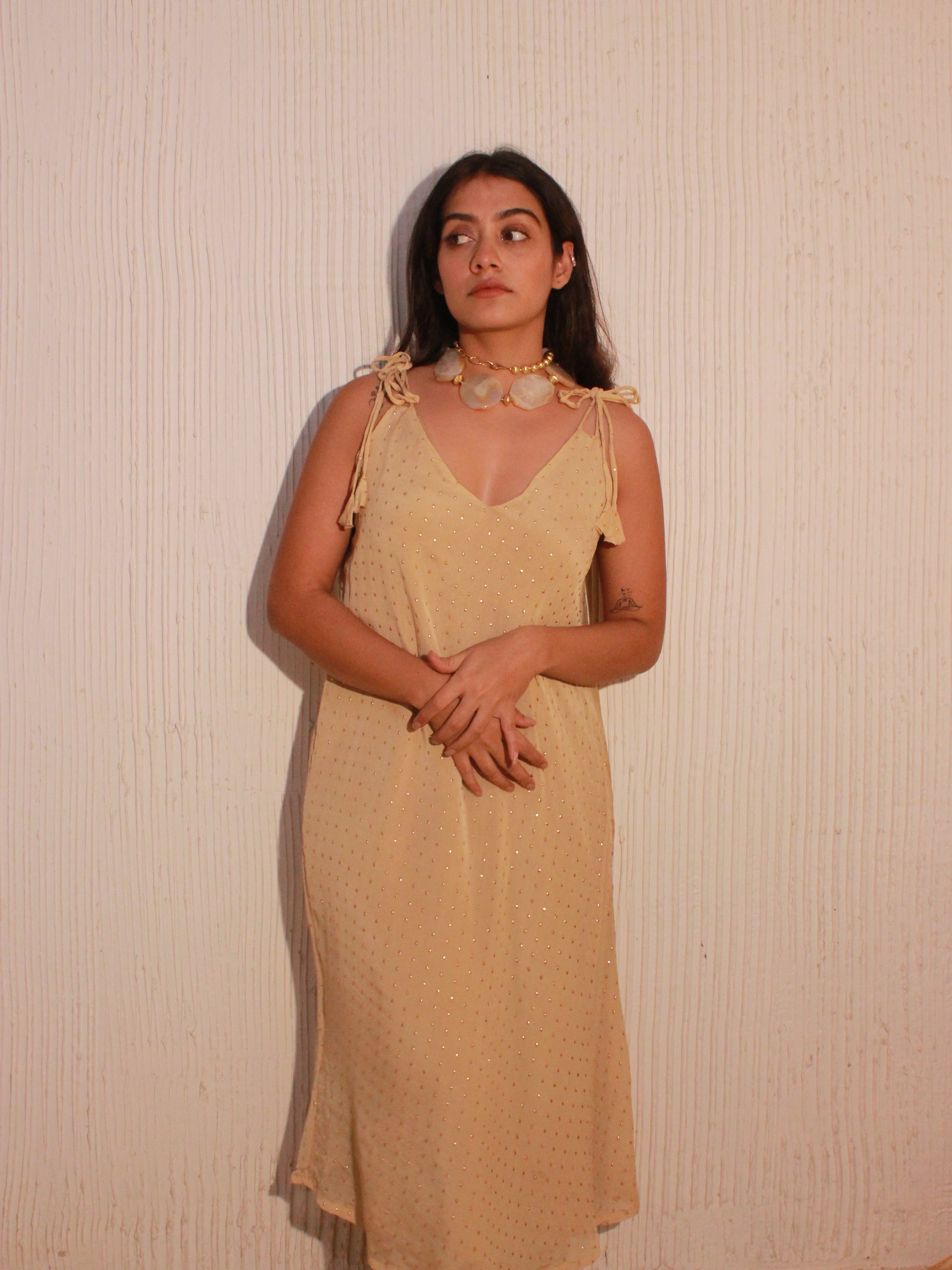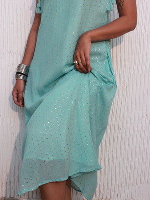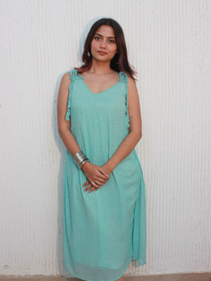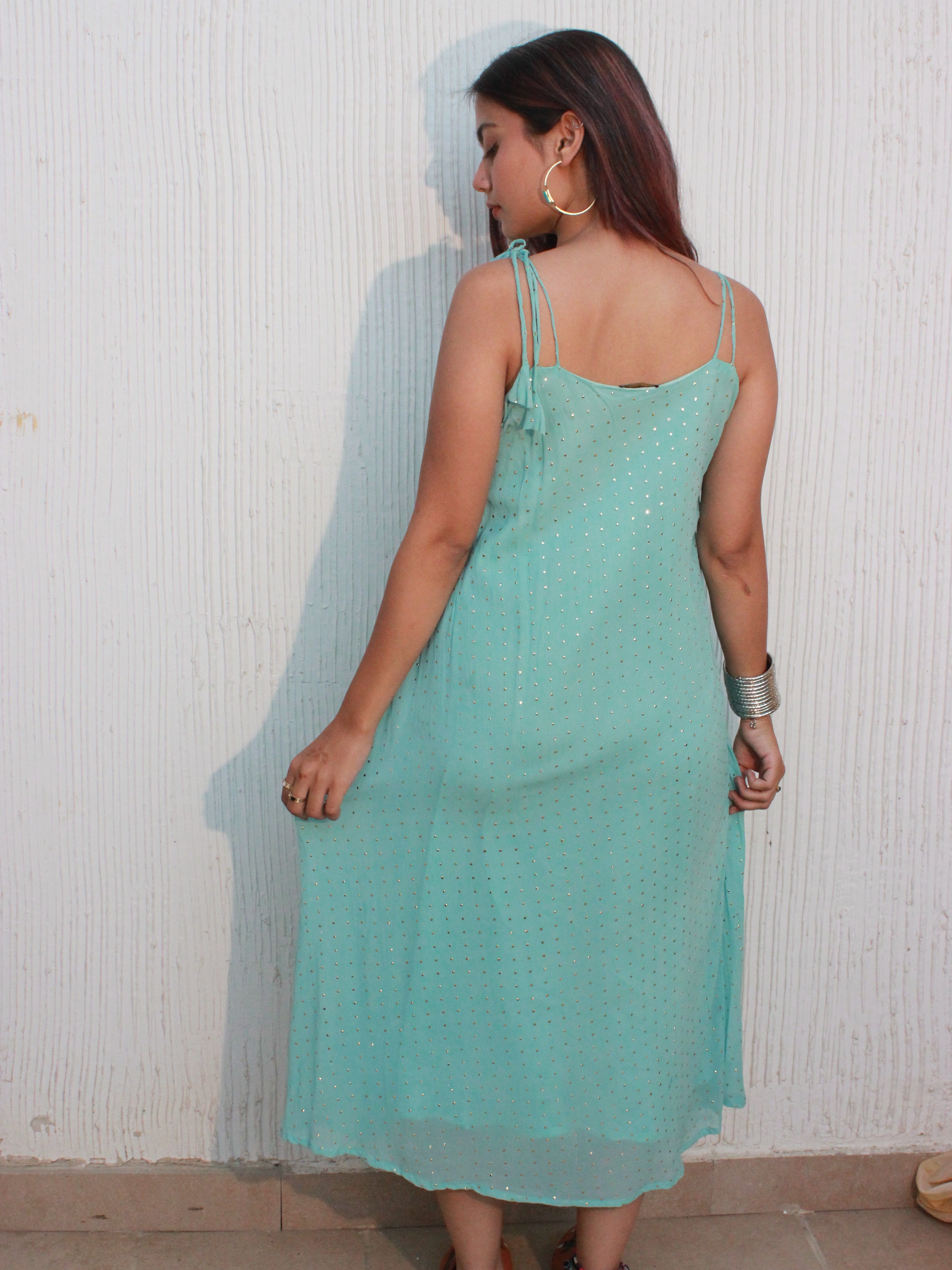 Discover the refined allure of our Mridyudyaan Collection with these versatile slip dresses, designed for the modern muse. Featuring a graceful V-neckline, each dress is crafted from lightweight chiffon or georgette and includes adjustable straps for personalized fit. Choose from these captivating options: an elegant beige adorned with intricate mukaish work, a soft powder blue with delicate mukaish detailing. Embrace a piece that brings breezy sophistication to any occasion. See the last image for size chart.