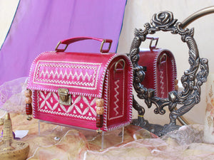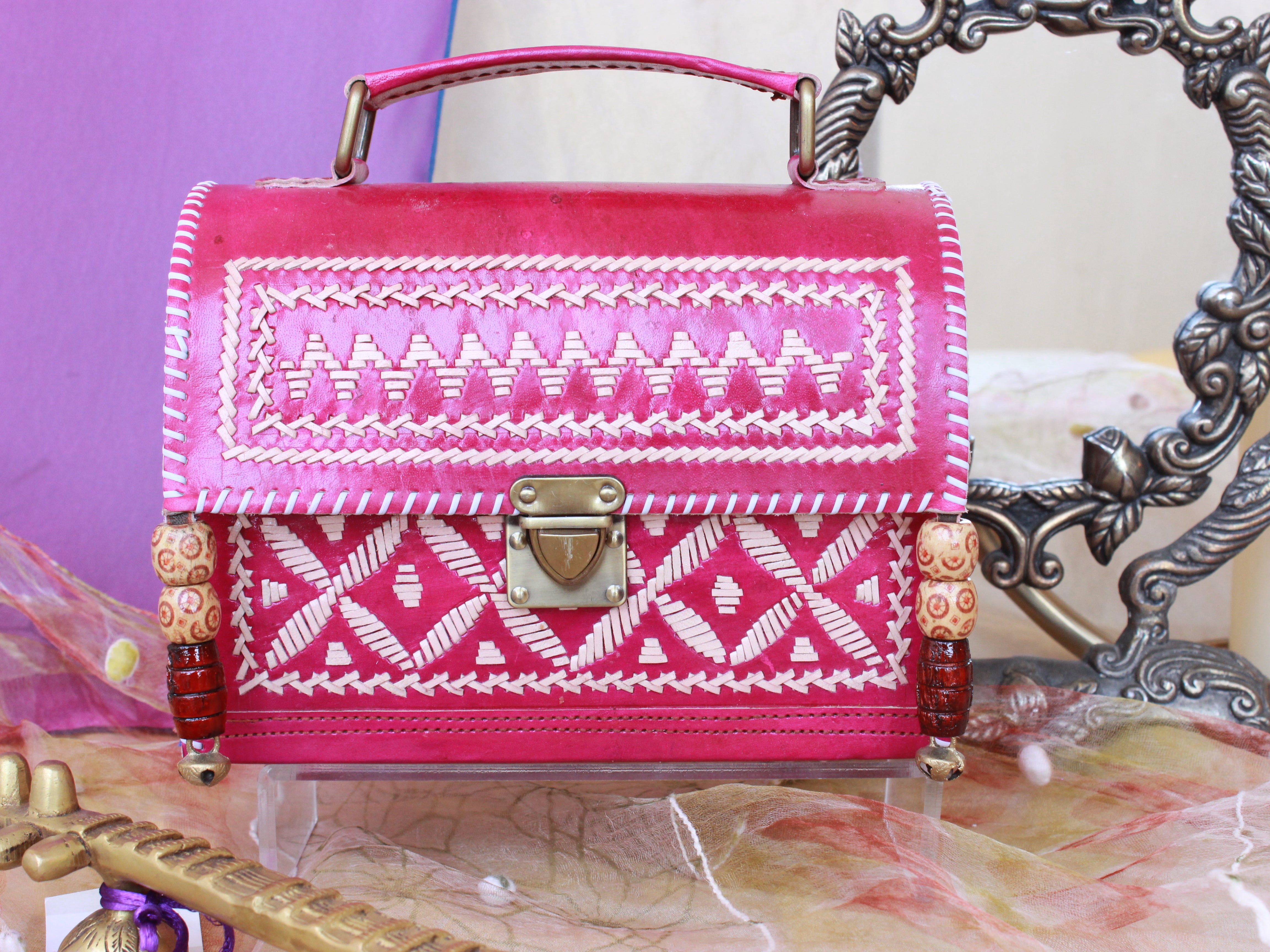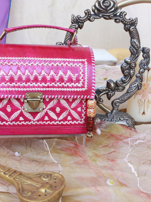 Step into a world of elegance with Romaani's Nakshatriya Pink Bag, beautifully embroidered with a starry pattern in delicate white leather. Handcrafted with care, this bag is lined with Ajrakh fabric, offering a boho-luxe experience. Whether as a handheld piece or a sling with its additional strap, it’s a perfect blend of tradition and modern luxury.