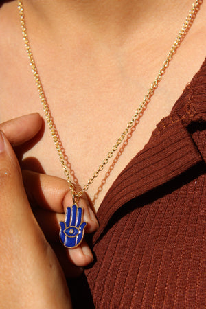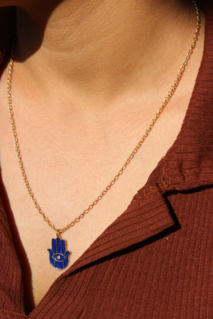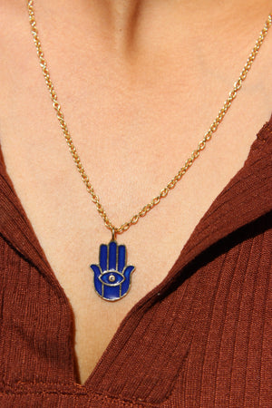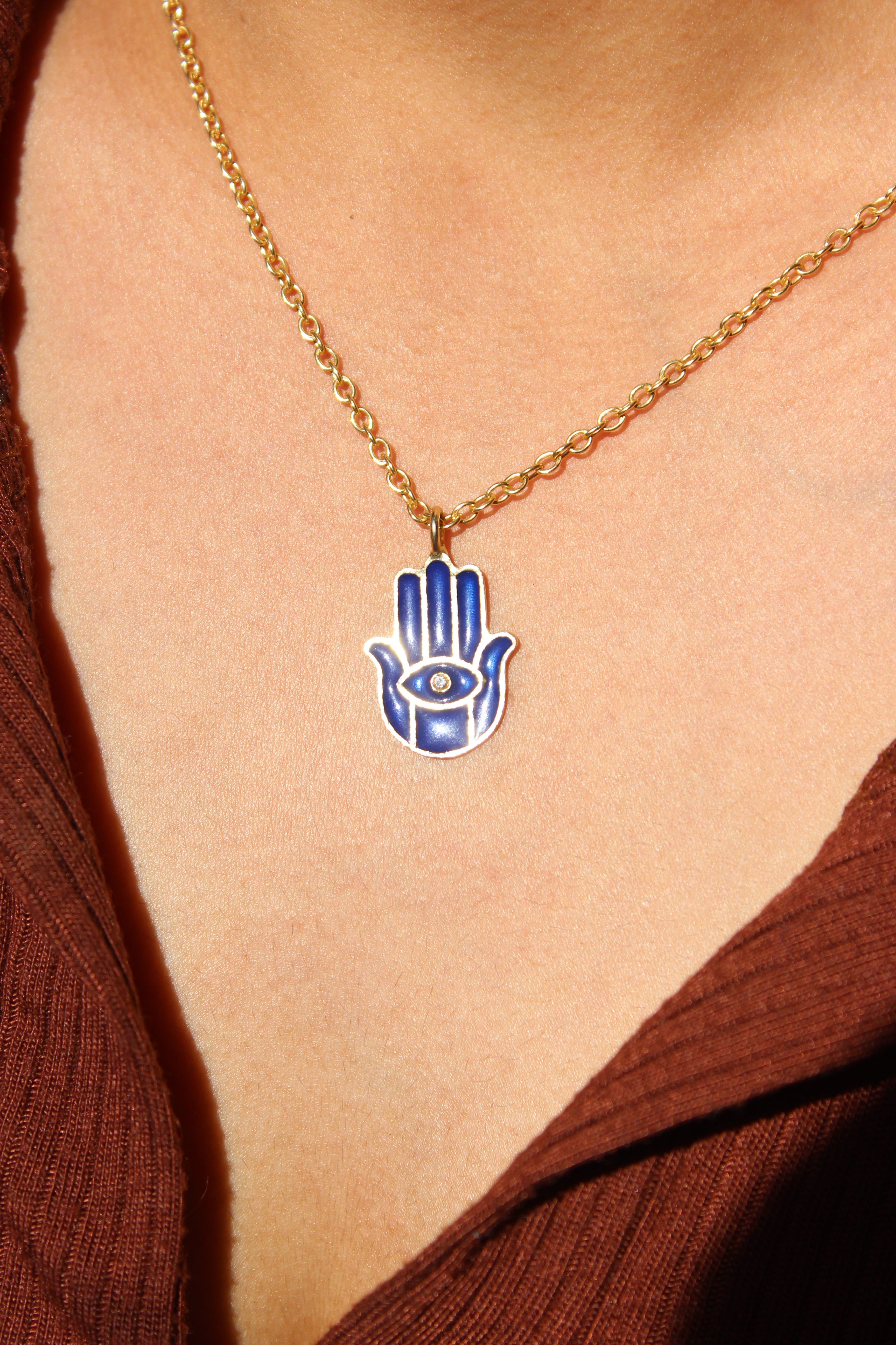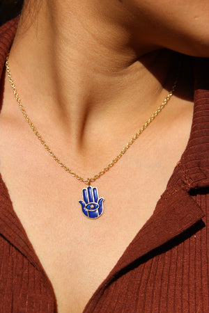 The Neelam Hamsa Pendant is a striking brass necklace featuring the protective Hamsa hand, intricately detailed in deep blue lacquer. A symbol of good fortune and protection, this timeless piece blends spiritual significance with effortless style, making it a meaningful addition to any jewelry collection.