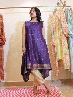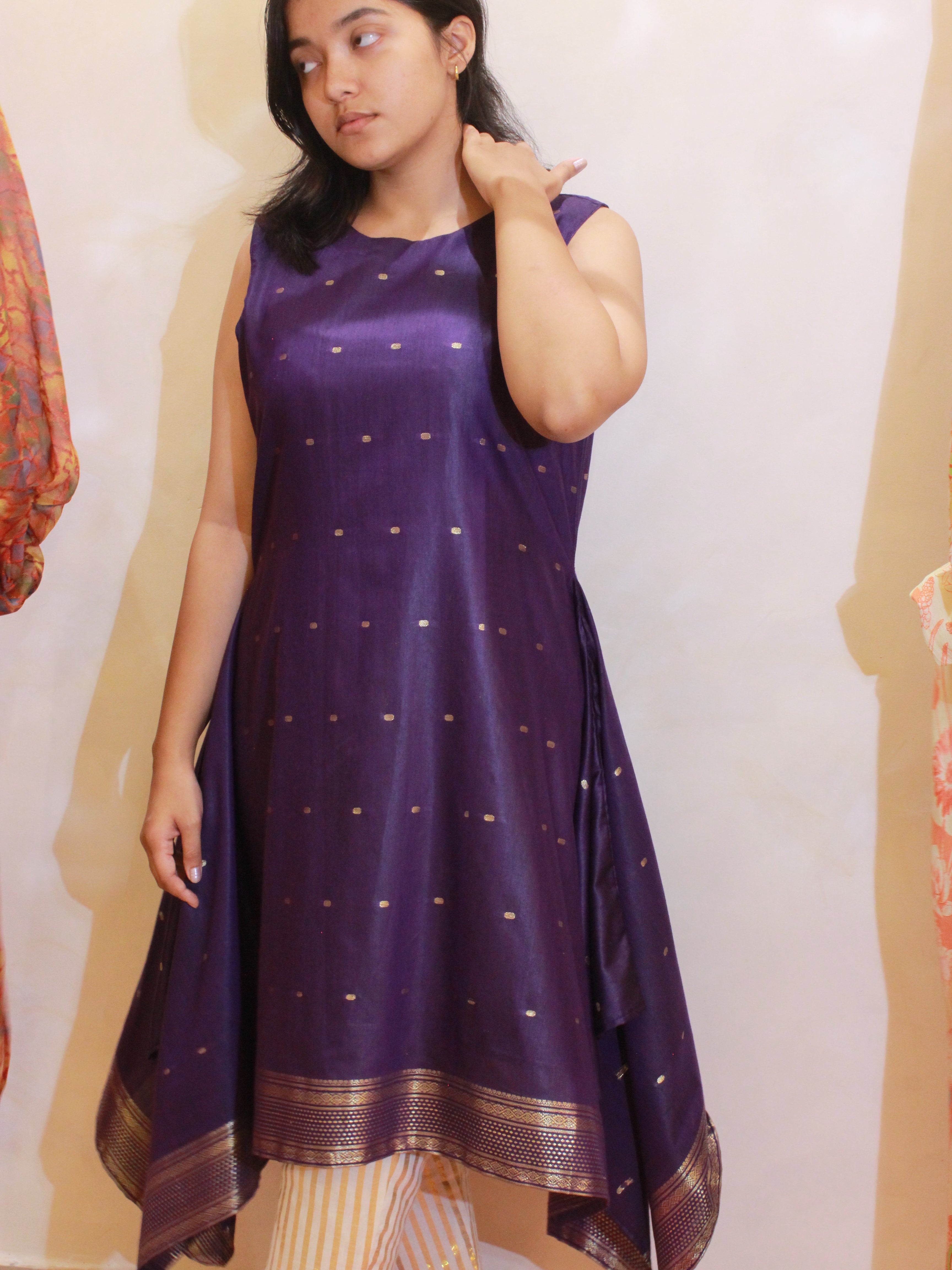 A short kaftan crafted from a preloved saree, in deep purple with gold bootas, perfect for effortless festive style. See the last image for size chart. Ships within 2-3 working days.