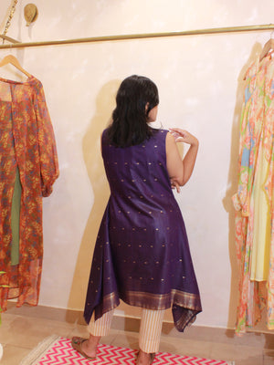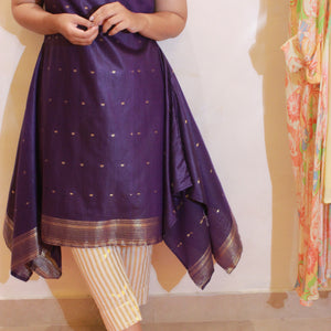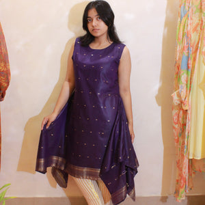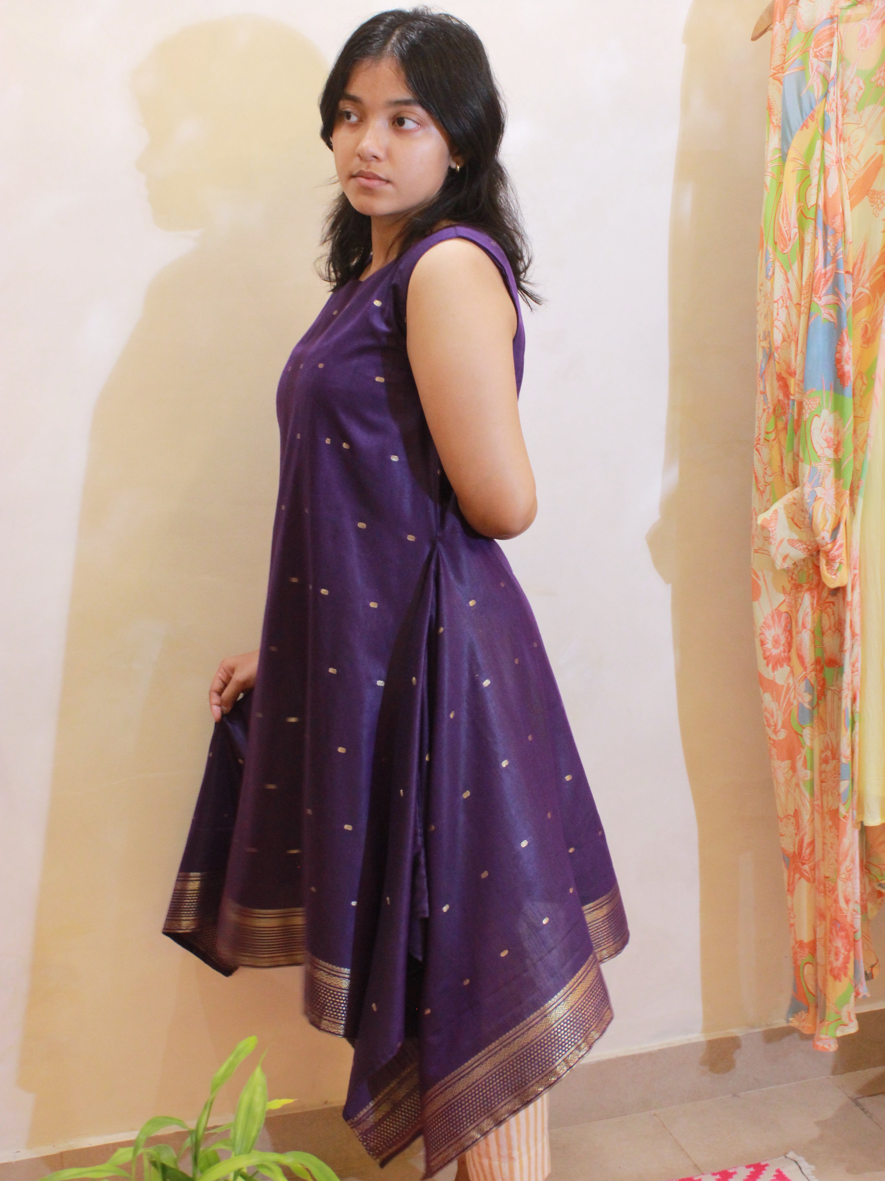A short kaftan crafted from a preloved saree, in deep purple with gold bootas, perfect for effortless festive style. See the last image for size chart.