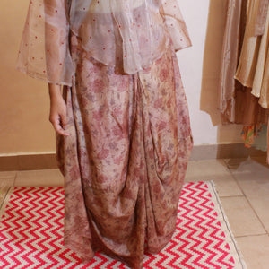 The Mridula Dhoti Skirt is crafted from a preloved georgette saree in a delicate dusty pink with floral prints. This reimagined piece merges tradition with contemporary style, featuring a dhoti-inspired silhouette that is both graceful and unique.
