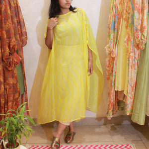 In airy georgette, this button-sleeved kaftan in yellow leheriya is your versatile, free-size layering piece. Adjust the sleeves to suit your style, and add effortless charm to your day. See the...