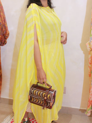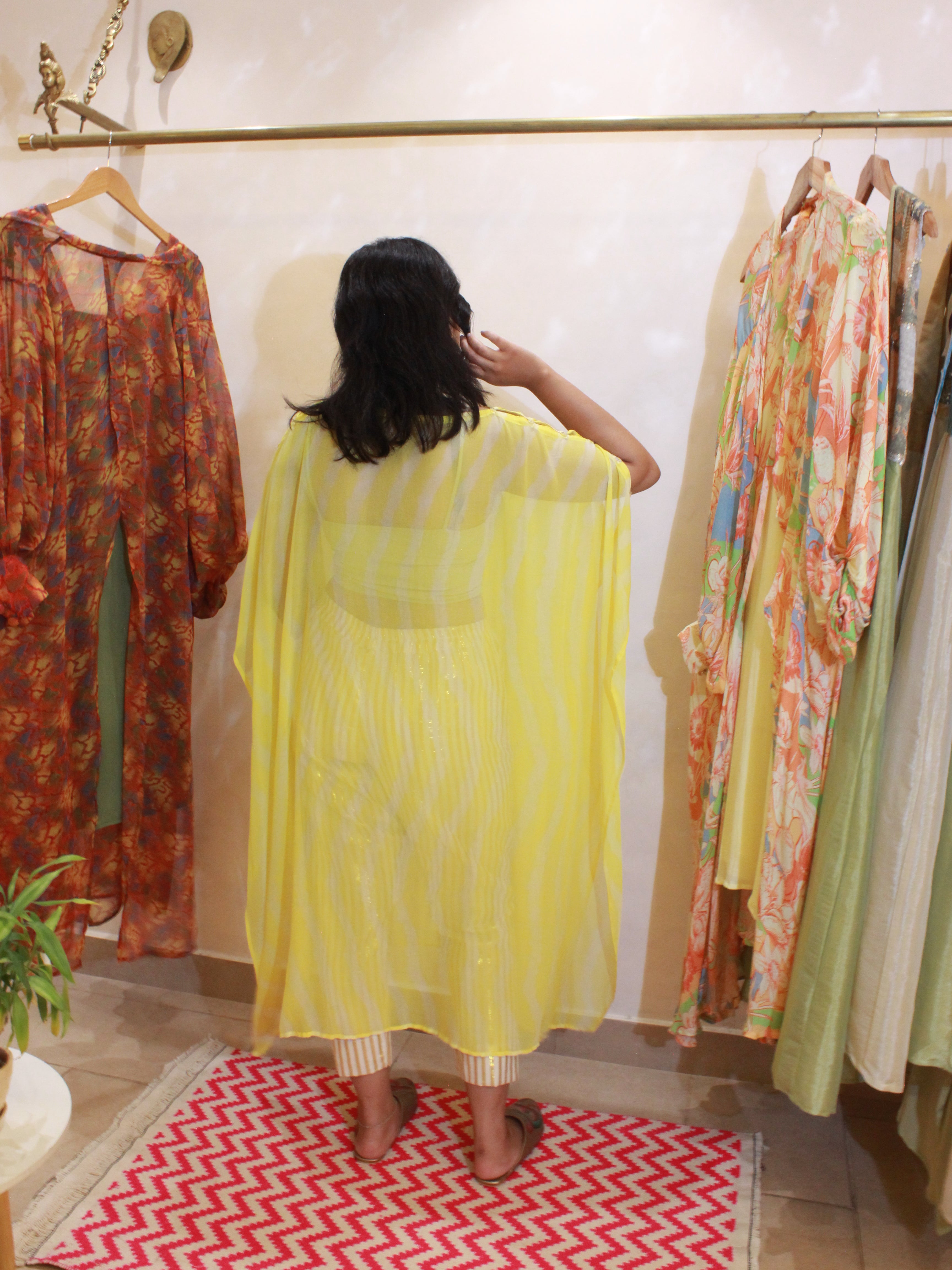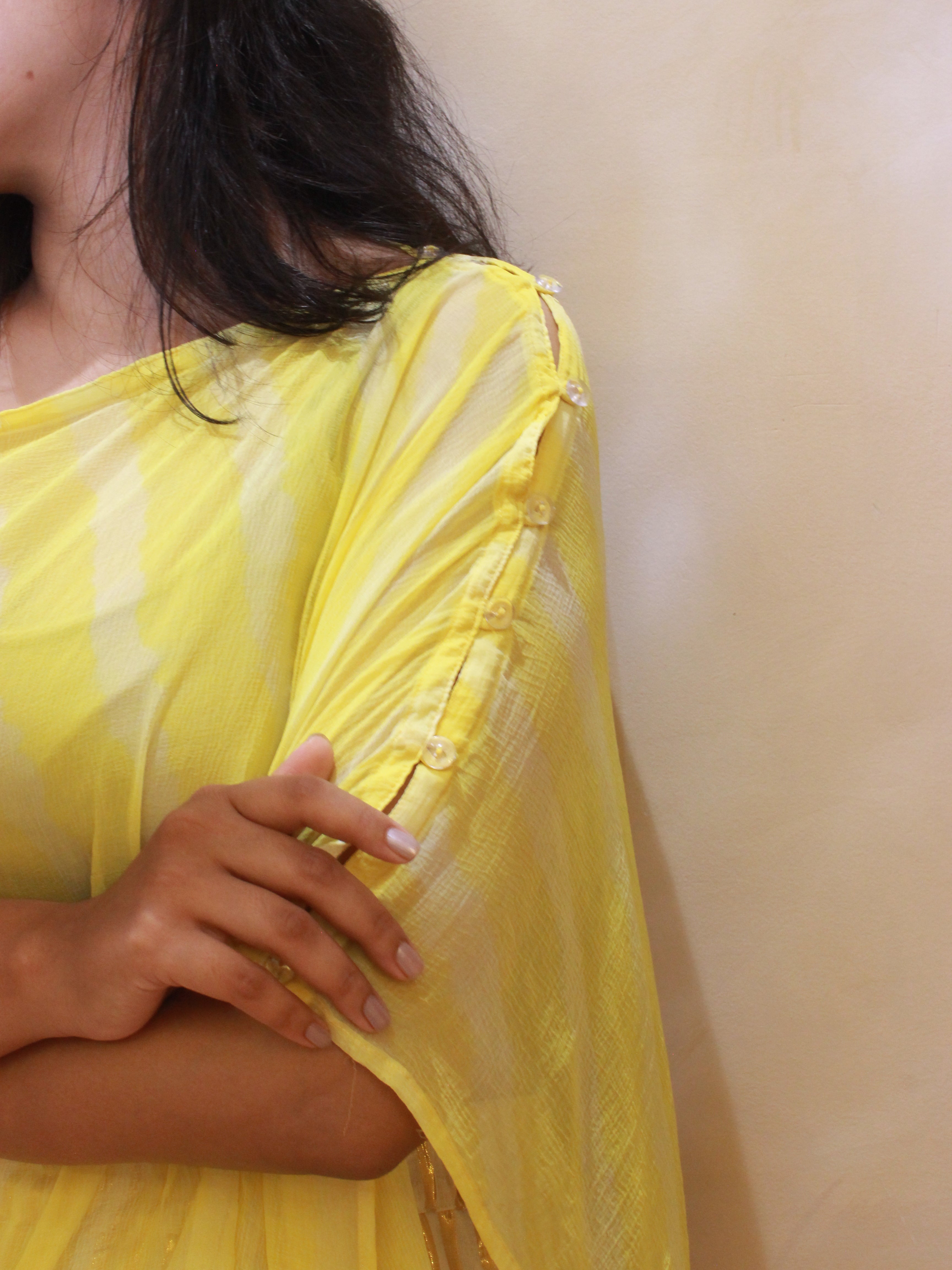 In airy georgette, this button-sleeved kaftan in yellow leheriya is your versatile, free-size layering piece. Adjust the sleeves to suit your style, and add effortless charm to your day. See the last image for size chart.