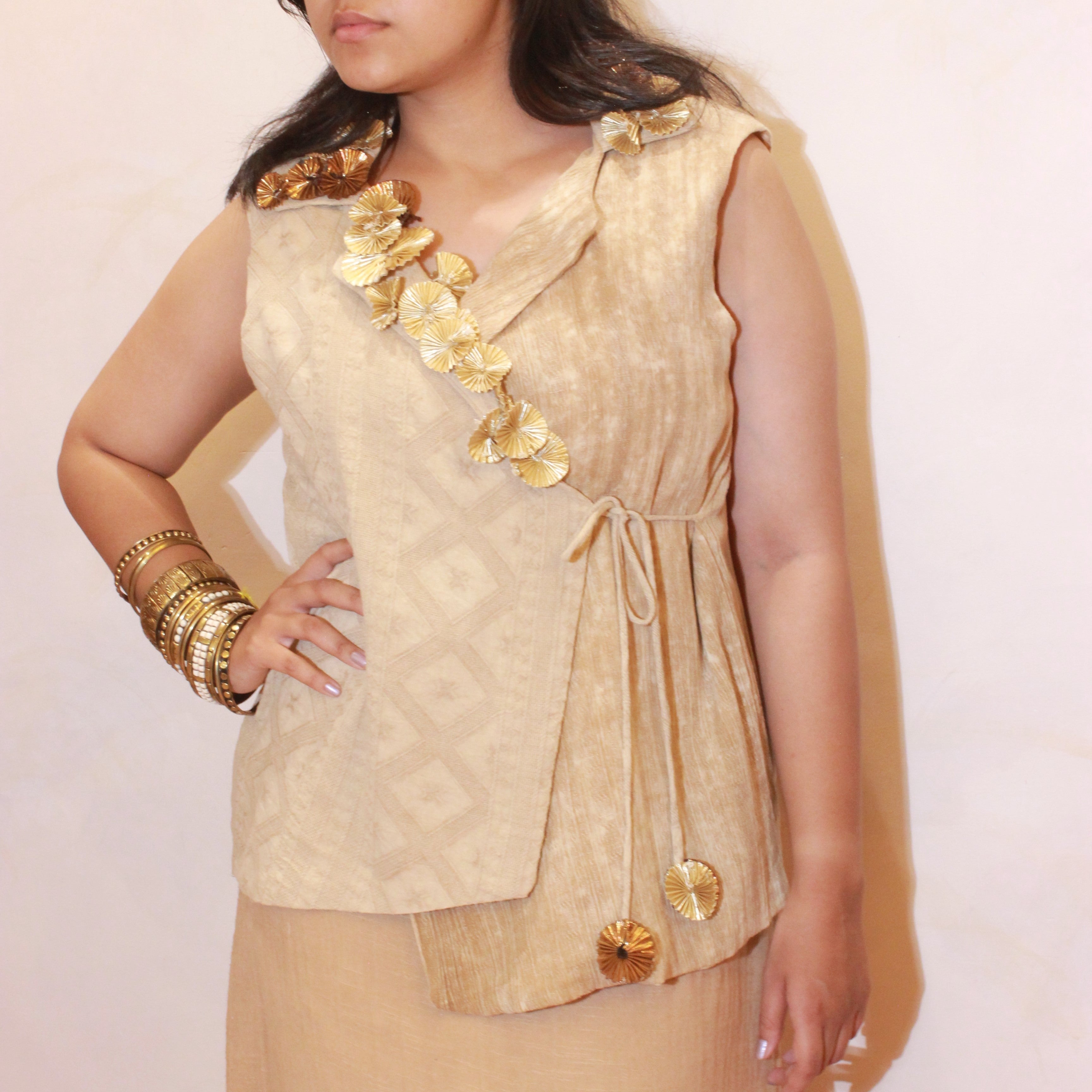 Inspired by desert hues, this beige angrakha jacket with tikli work on the collar embodies understated luxury.