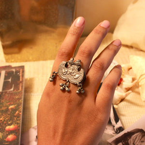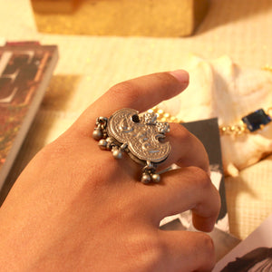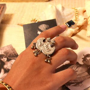 Crafted in German silver, this vintage oxidized ring resembles an amulet. The Tabeez Crescent Ring is an ode to heritage, blending symbolism and style effortlessly.