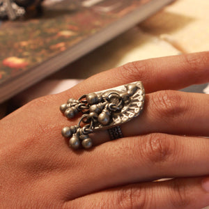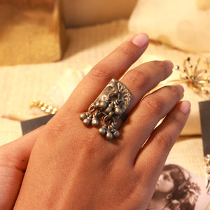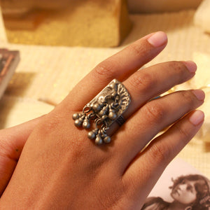 The Mayurvasini Ring features a rectangular oxidized surface embossed with a graceful peacock motif. Dangling ghungroos add a touch of movement to this piece, making it a vibrant addition to your jewelry collection.