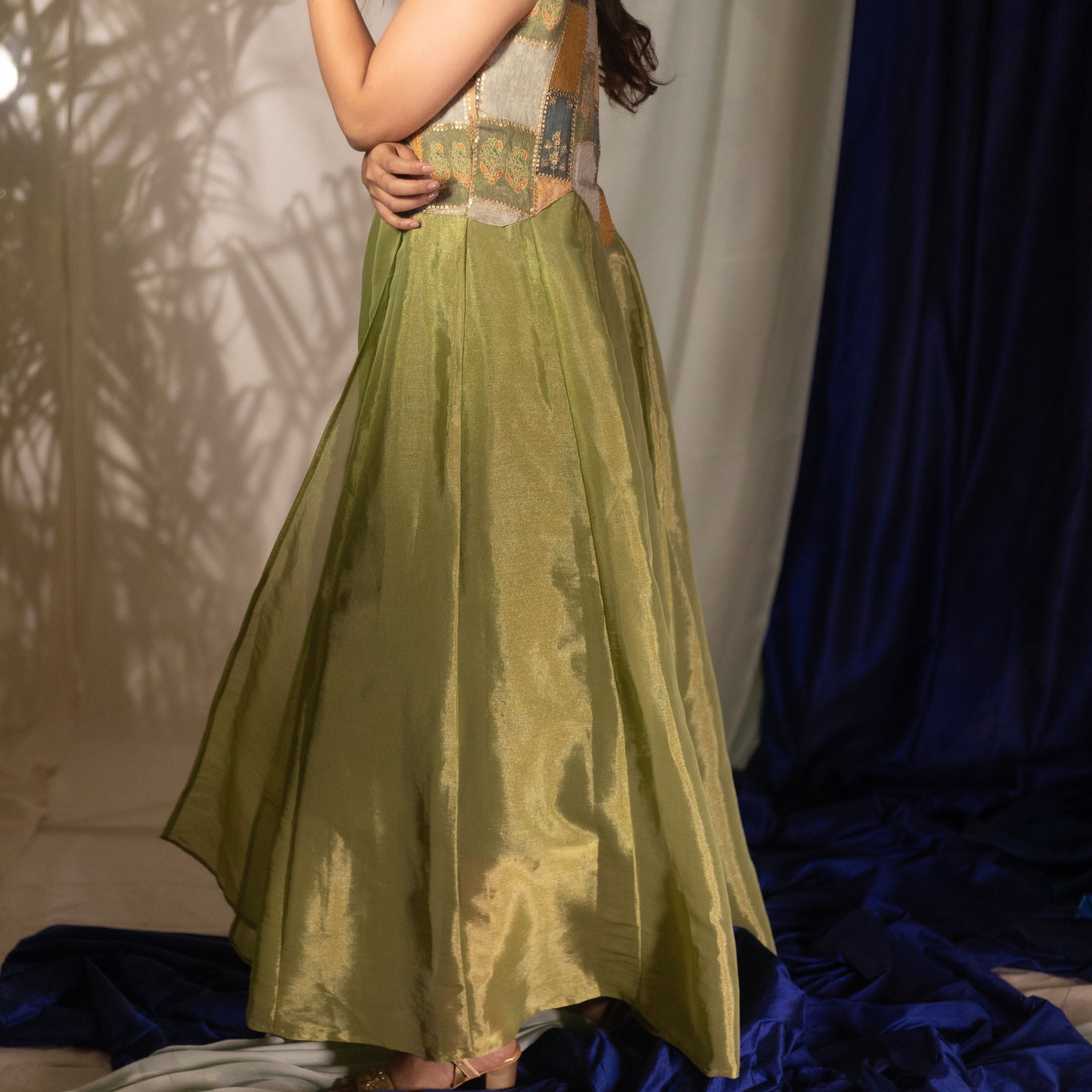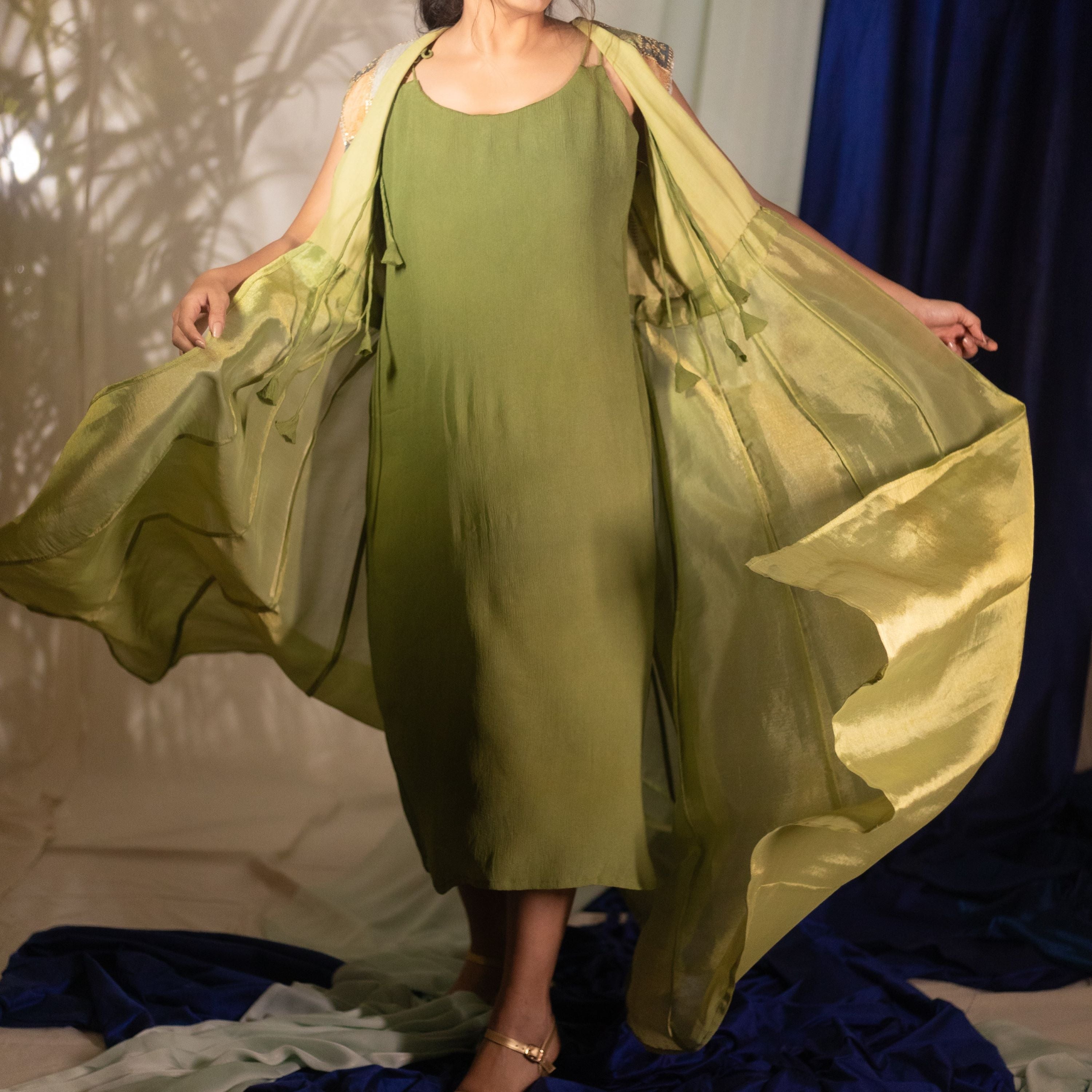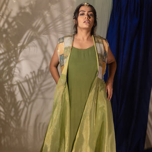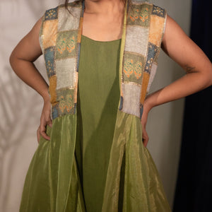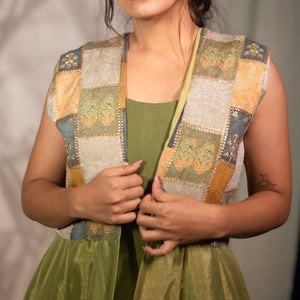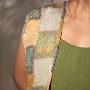 The Palak Jacket is a sleeveless shrug with an empire line, made from embroidered fabric in shades of green and grey, and finished with green organza kalis for a graceful flair....