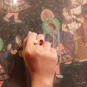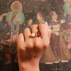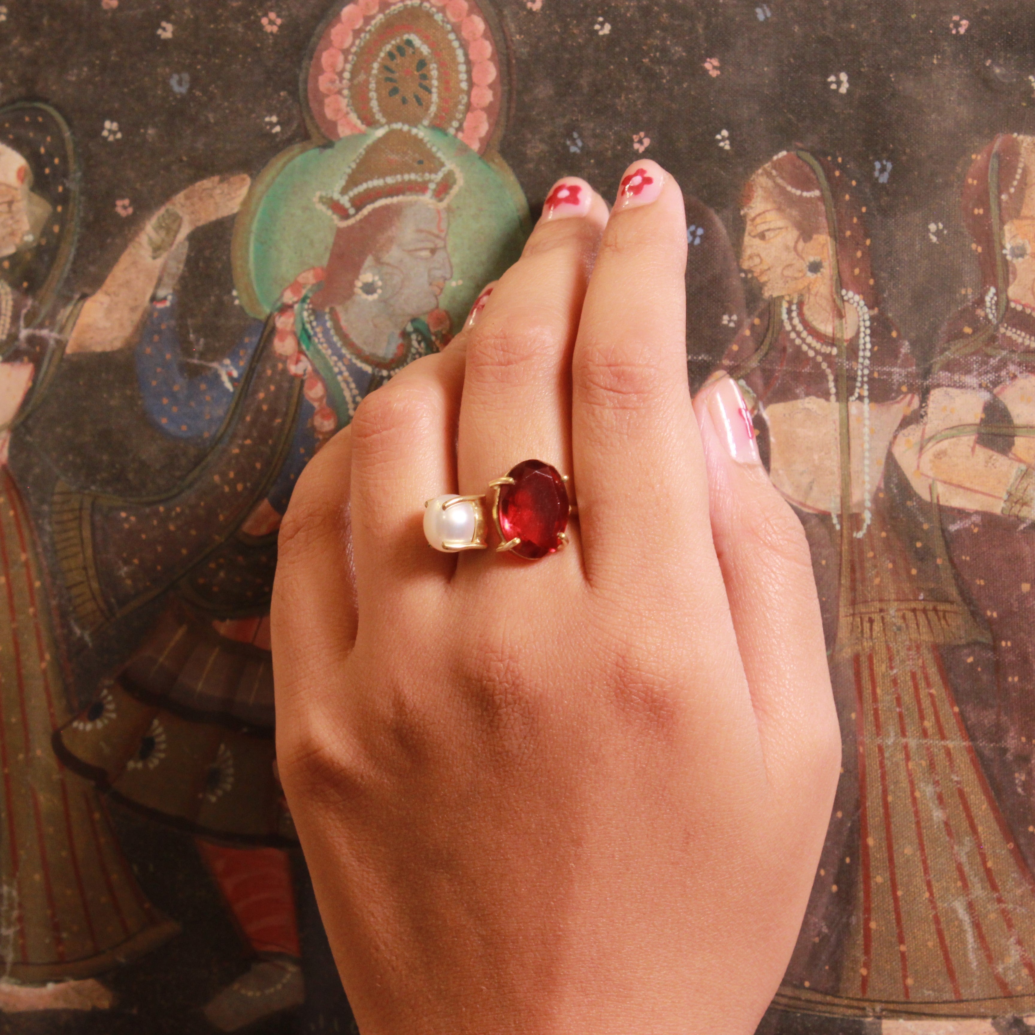 This adjustable brass ring features an embedded pearl on one end and a radiant oval ruby stone on the other. The Nayantara Ring is a versatile piece that adds charm to any look.