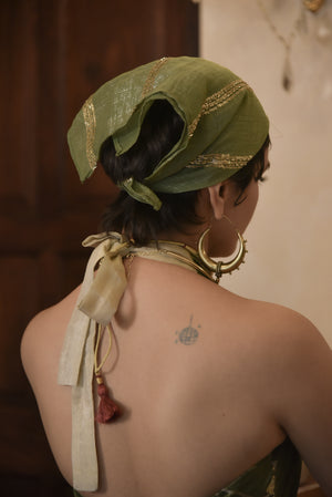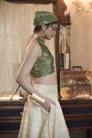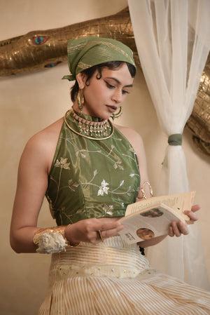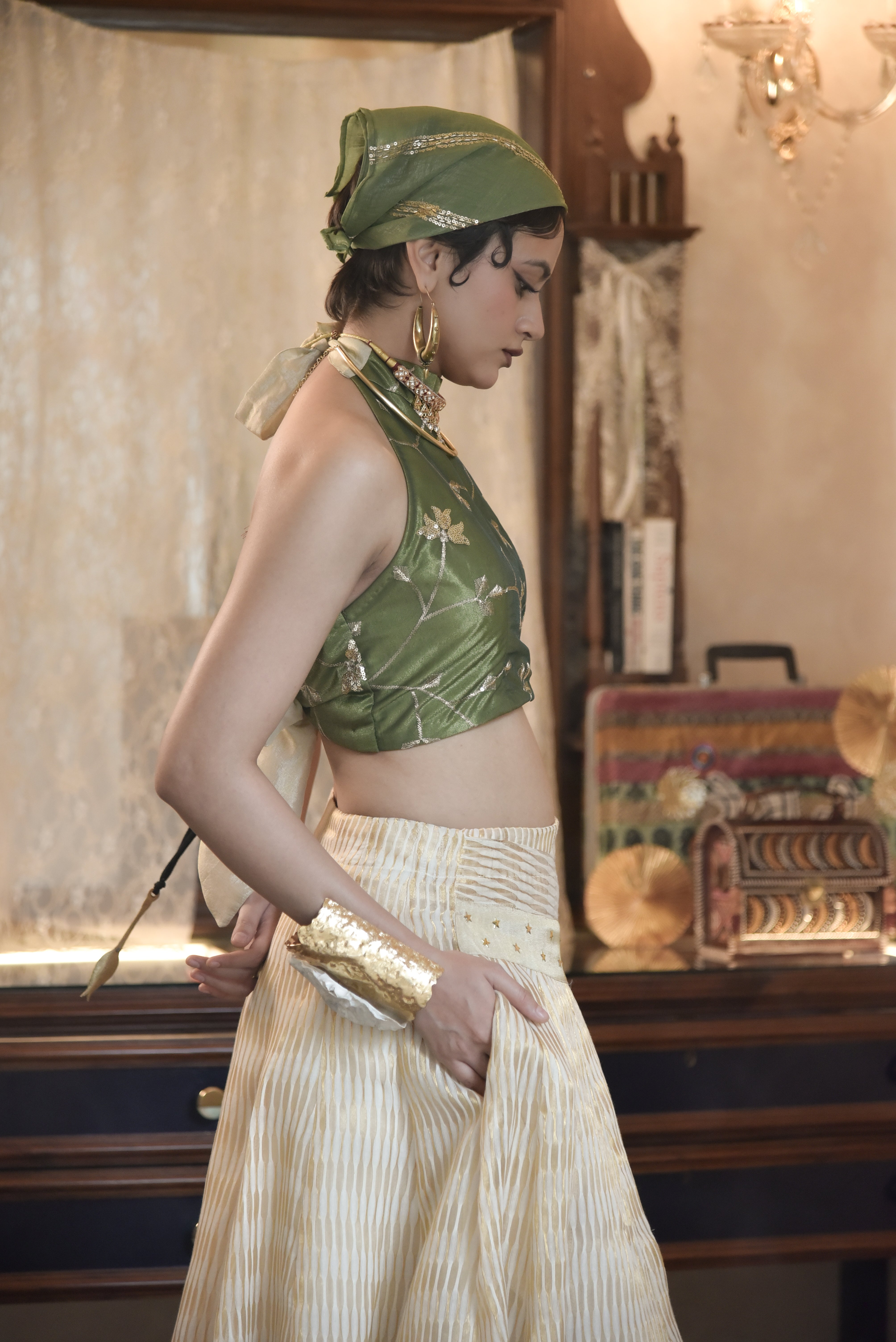 A fluid lehenga in golden-white textile paired with an embroidered green halter blouse in floral motifs. Comes as a set of two, or with a matching sleeveless jacket for a set of three.
