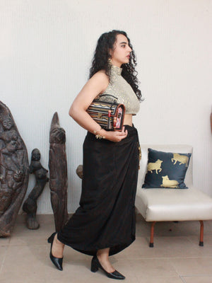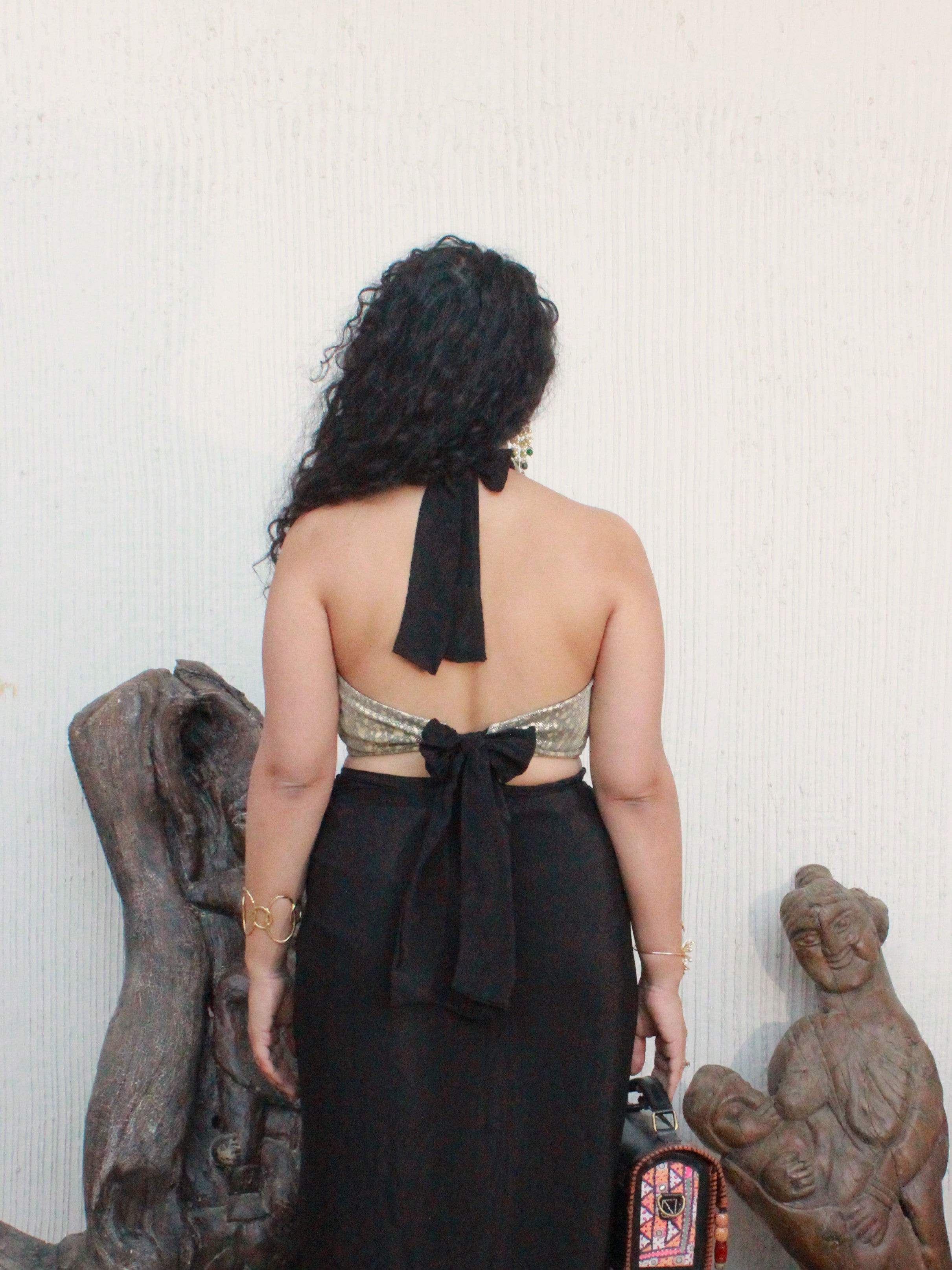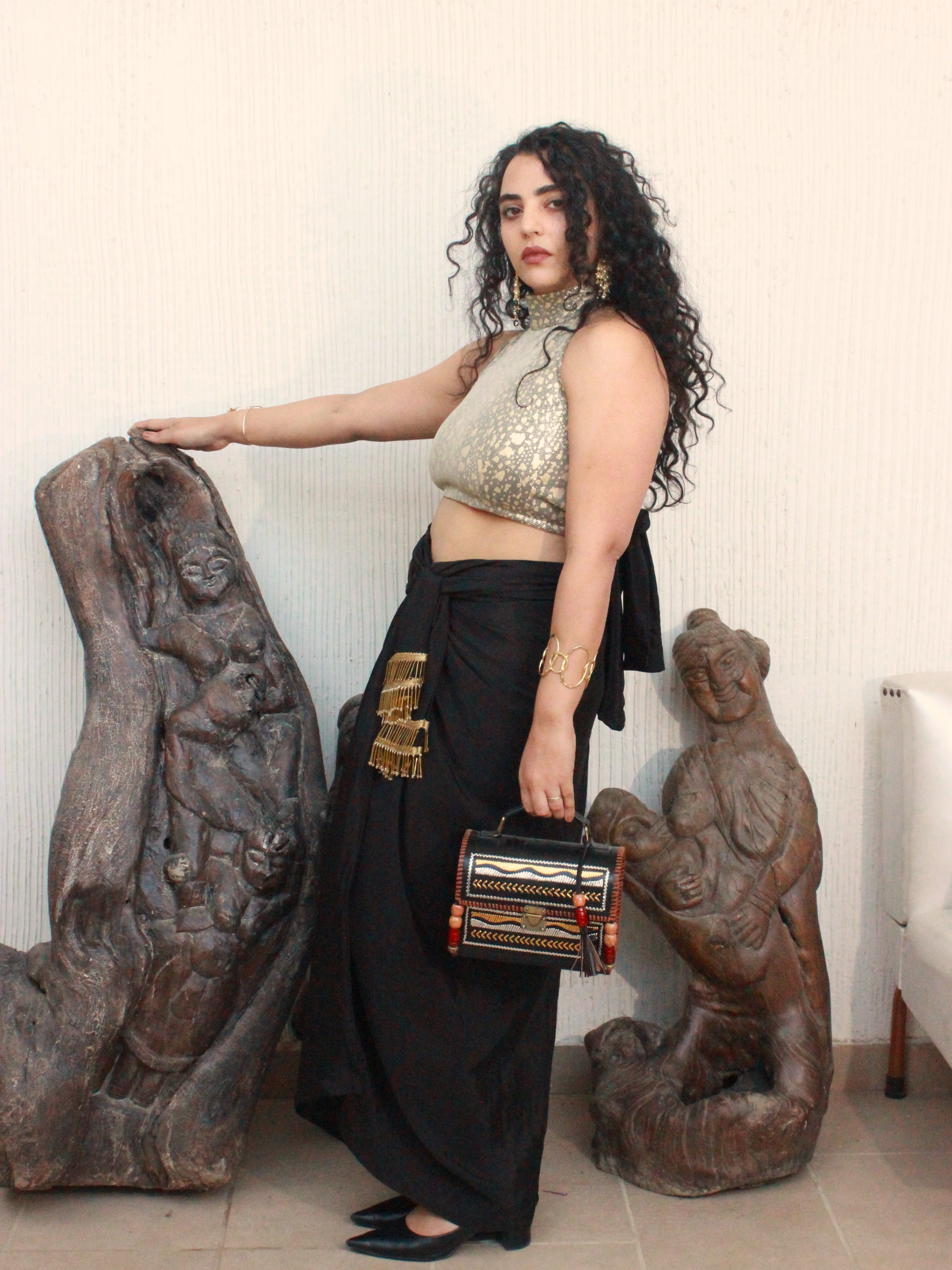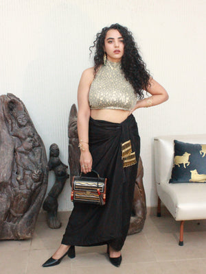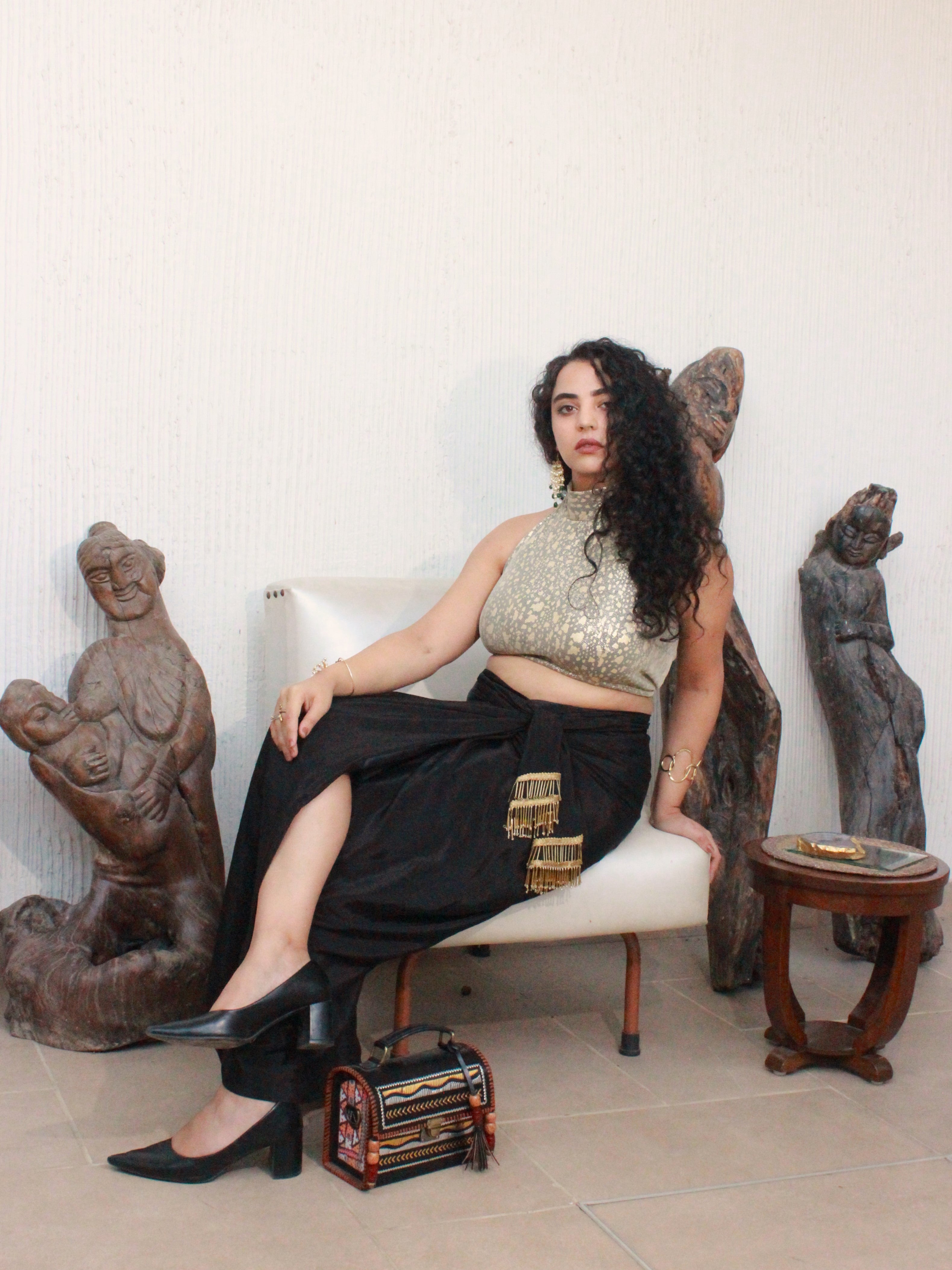 The Roop Blouse redefines elegance with its bold cheetah-printed metallic fabric. This halter-style blouse ties at the neck and back, offering a flattering fit while exuding a touch of contemporary glamour. Paired with Roop Wrap Skirt, designed in soft black crepe for a comfortable yet glamorous fit. This free-size wrap skirt adjusts effortlessly to your waist and hips, ensuring a flattering silhouette for every body type. Adorned with elegant golden tasseled lace on the edges of its tie-ups, this skirt is the perfect blend of functionality and flair. See the last image for size chart.