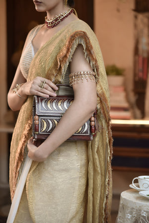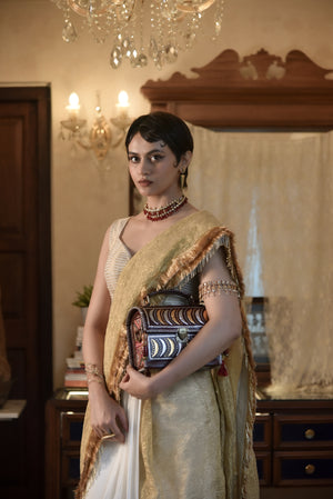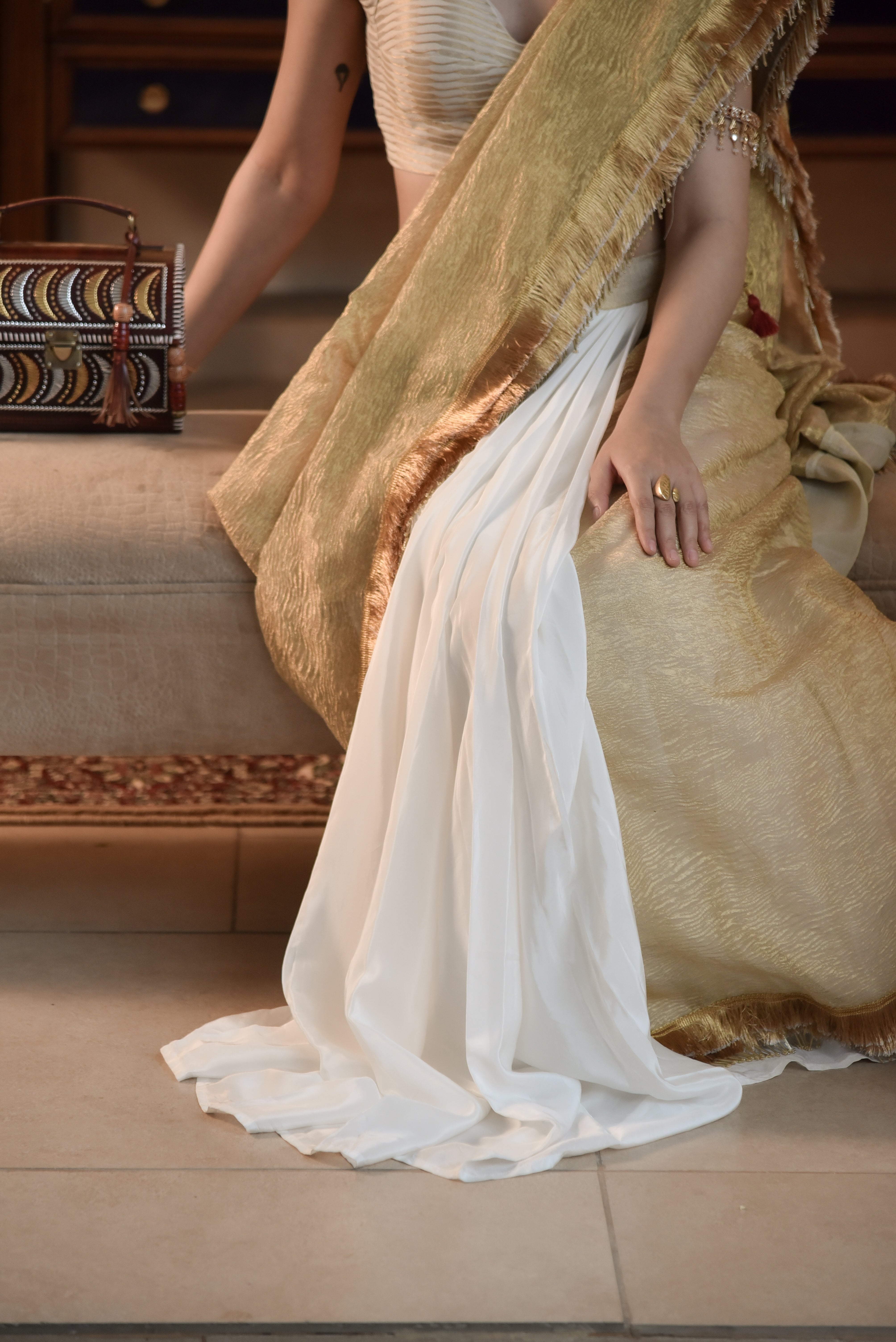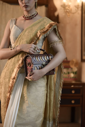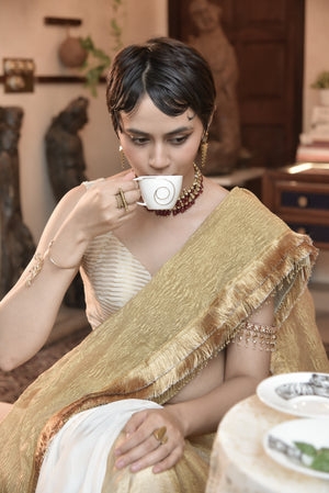A half-and-half pre-stitched saree in white crepe and golden textured tissue, finished with tasseled hems. Also available in purple-gold and black-gold variations.For the woman who celebrates ease and elegance alike — a...