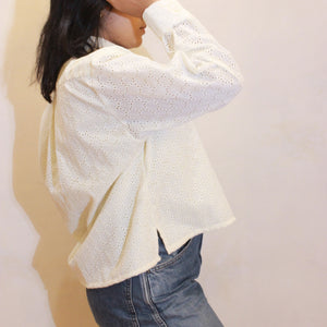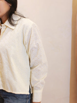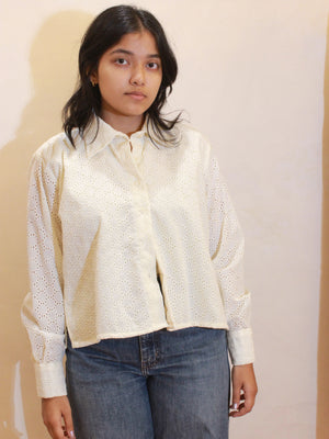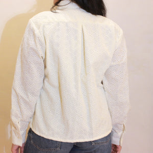 The Ivory Whisper Schiffli Shirt embodies effortless elegance with its intricate Schiffli embroidery. Buttoned through the front, this shirt in crisp white is a wardrobe essential. See the last image for size chart.
