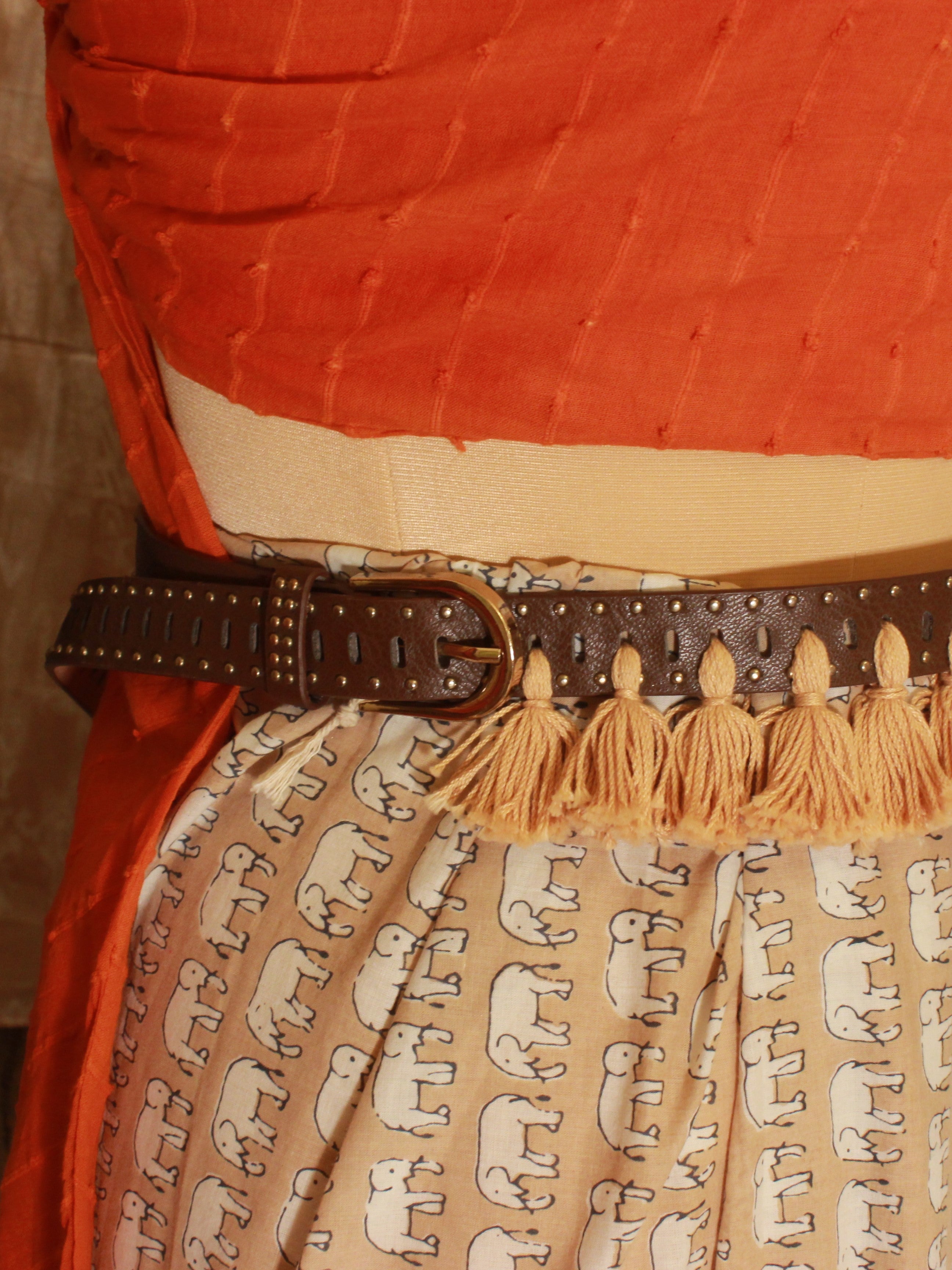 The Brown Leather Belt with Beige Tassels is a sophisticated blend of elegance and a hint of whimsy. This 42" long, 1" broad leather belt features small beige tassels tied through holes, alongside a metallic buckle. The neutral tones make it perfect for adding texture and detail to any outfit.