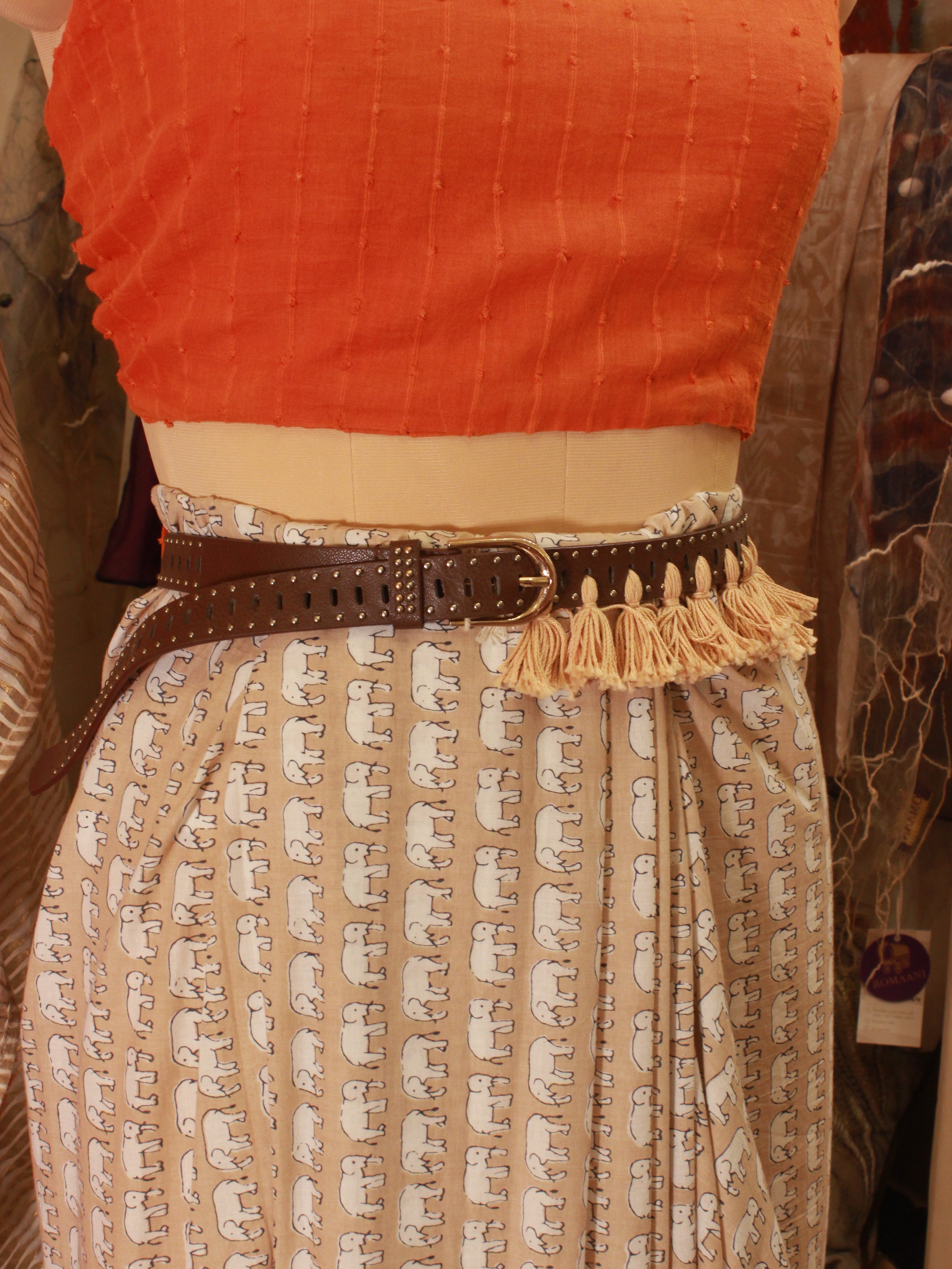 The Brown Leather Belt with Beige Tassels is a sophisticated blend of elegance and a hint of whimsy. This 42" long, 1" broad leather belt features small beige tassels tied through...
