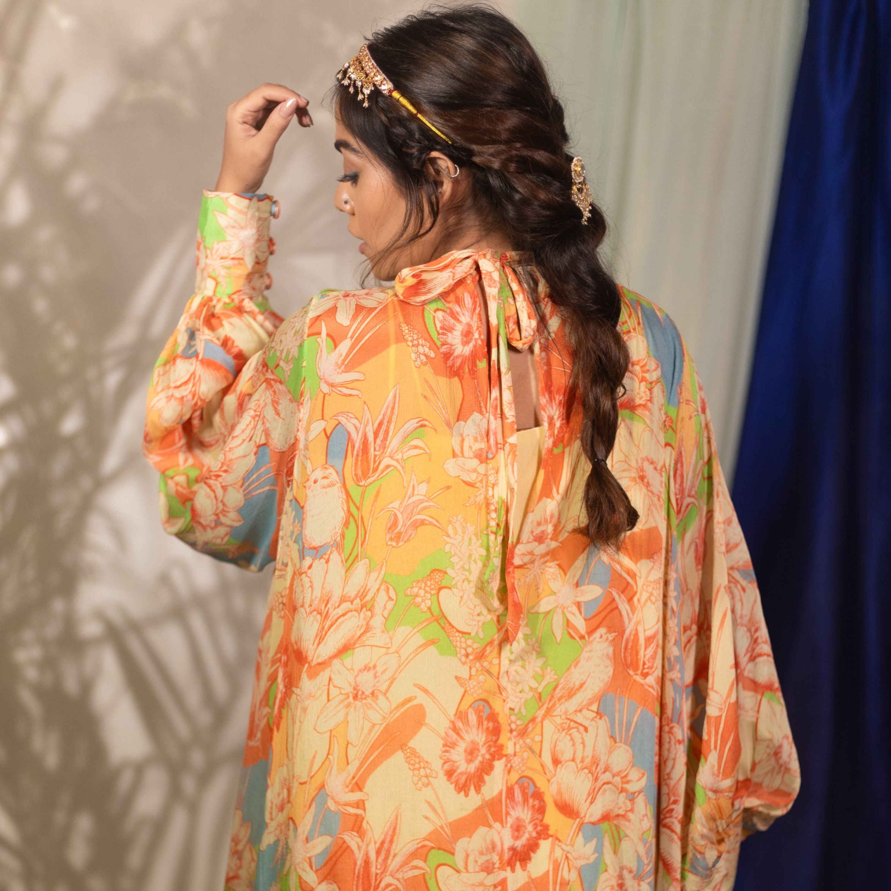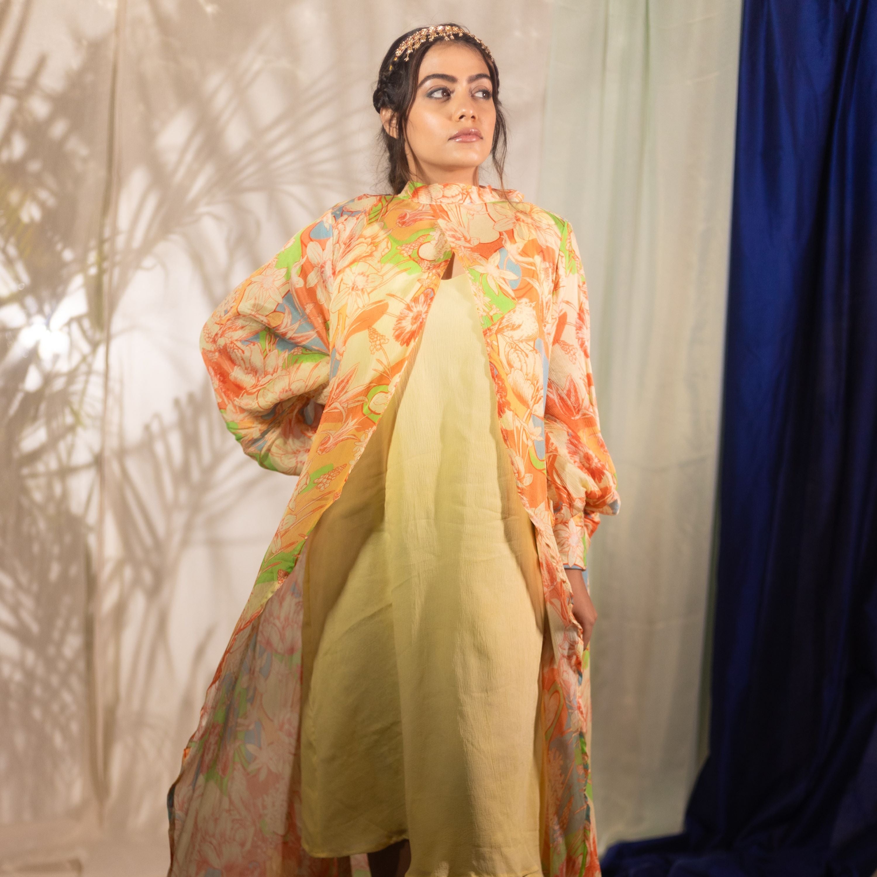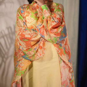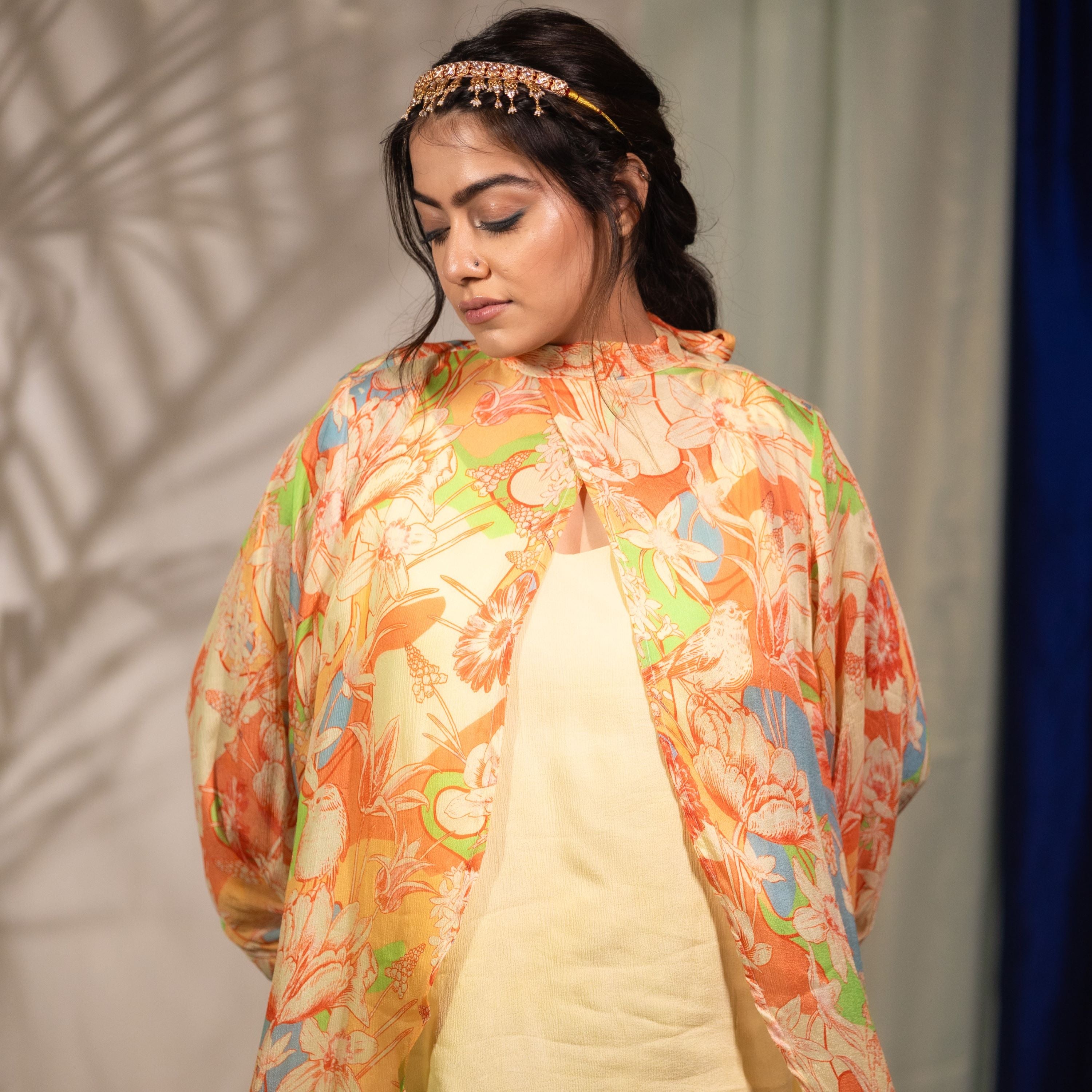 Embrace the breezy elegance of summer with the Zohra Cape from Romaani’s Summer 2024 Collection. This floral chiffon cape is as light as air, offering a crush-free, effortless style that's perfect for your resort wear wardrobe. The tropical print adds a vibrant touch, making it a versatile piece that can easily transition from a casual day out to a fun day wedding—ideal for Mehendi and Haldi looks.