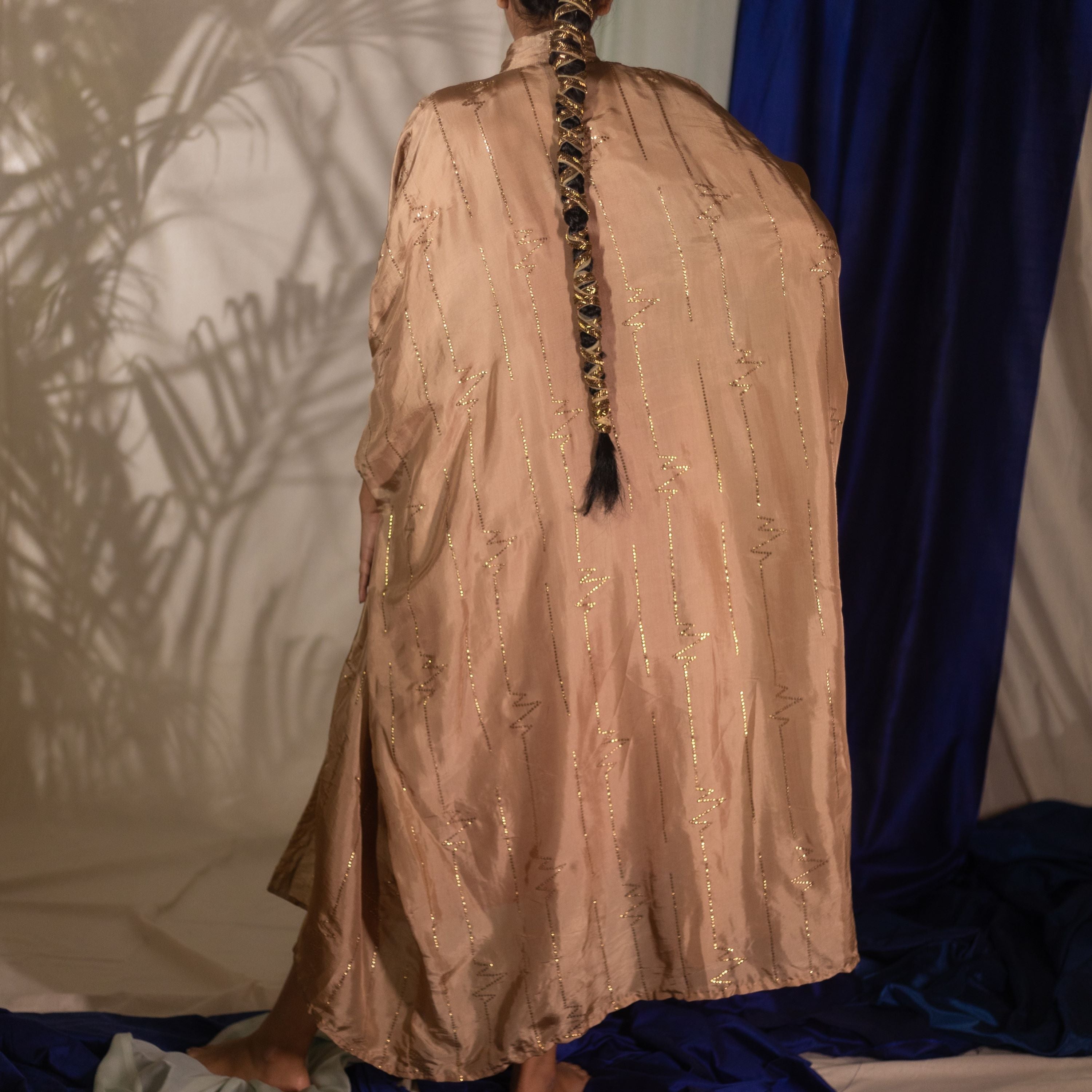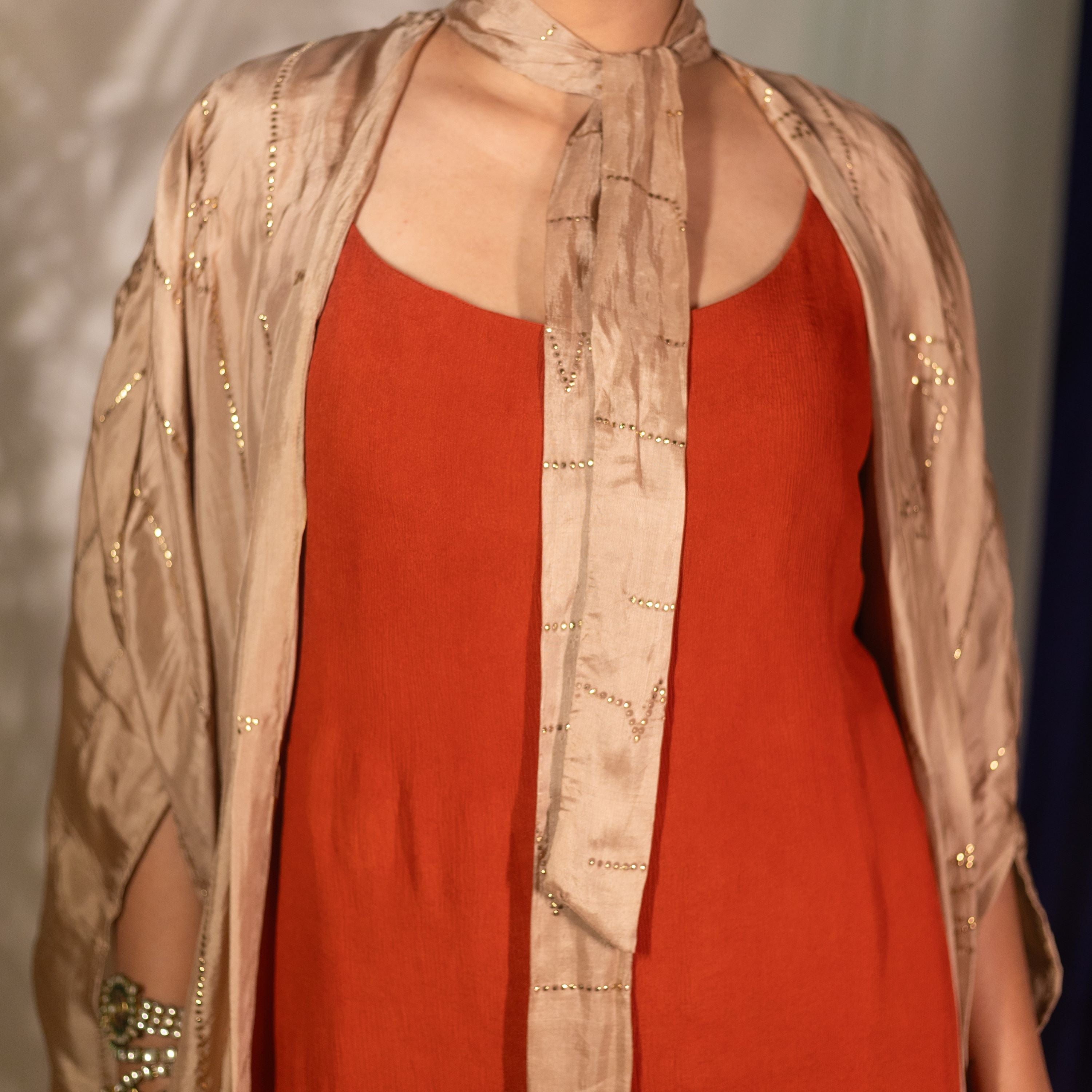 Free flowing bow tie neck cape with mukesh work. See the last image for size chart.
