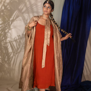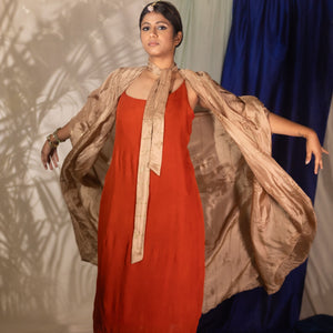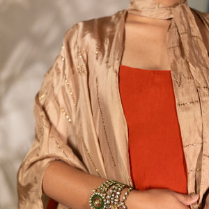 Free flowing bow tie neck cape with mukesh work. See the last image for size chart. Ships within 5-7 working days.