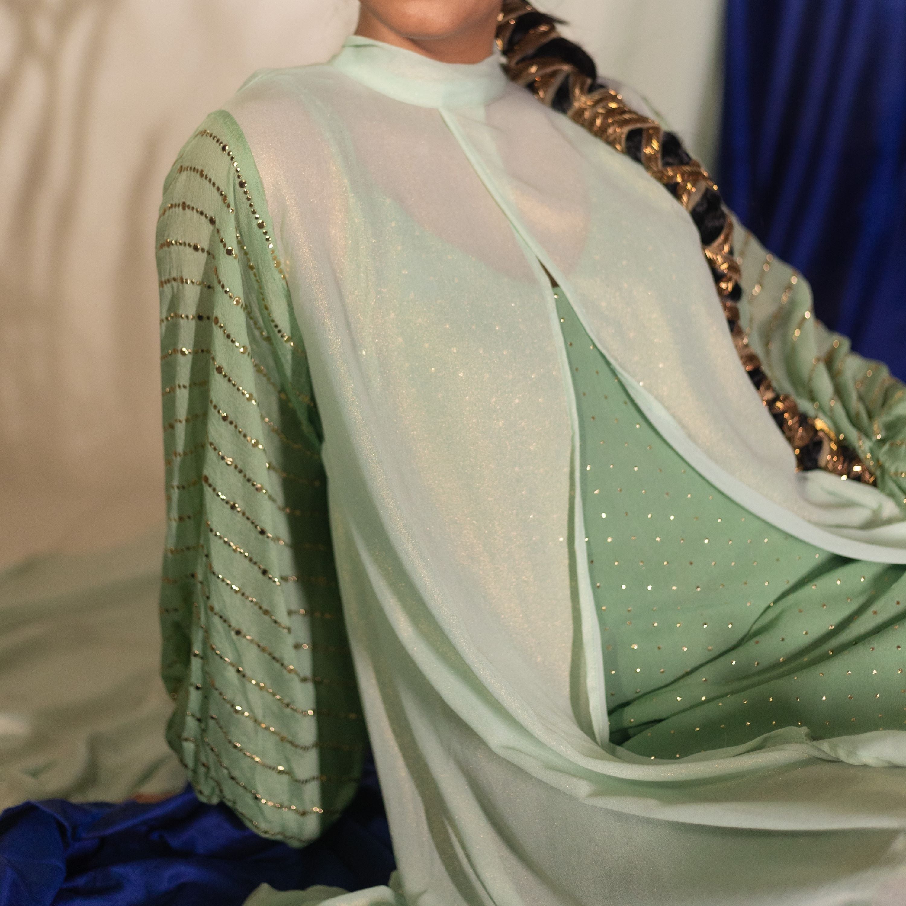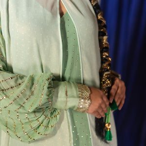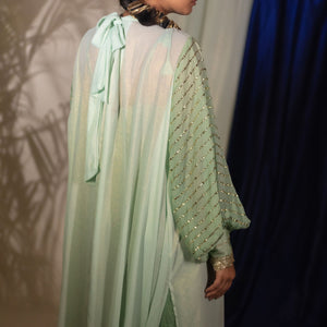 Add a touch of sophistication with the Urmi Bishop Sleeve Jacket, crafted from shimmering green fabric. The jacket features bishop sleeves with foil work and embroidered organza cuffs, with a bowtie...