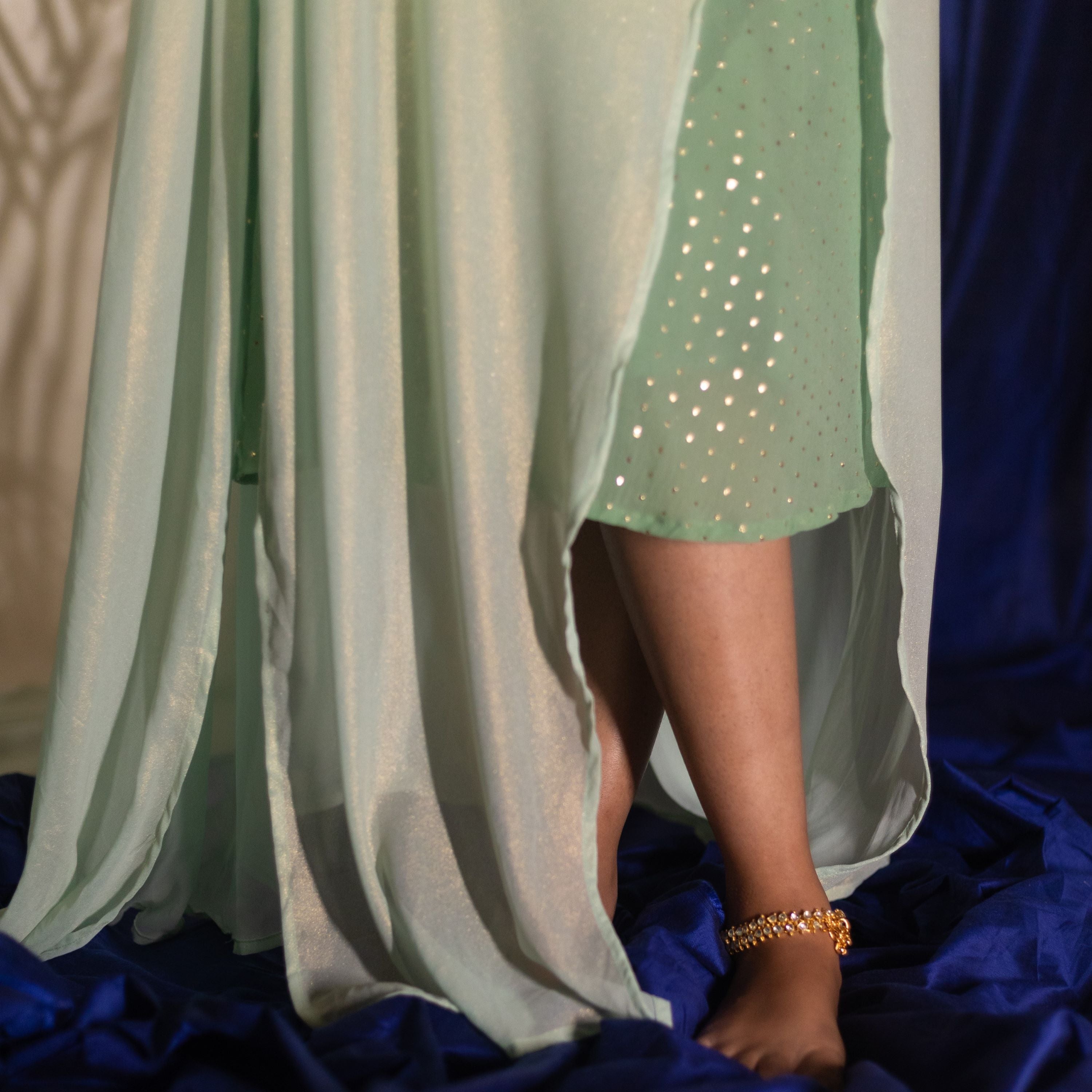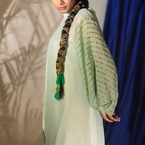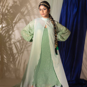Add a touch of sophistication with the Urmi Bishop Sleeve Jacket and Dress, crafted from shimmering green fabric. The jacket features bishop sleeves with foil work and embroidered organza cuffs, with a...