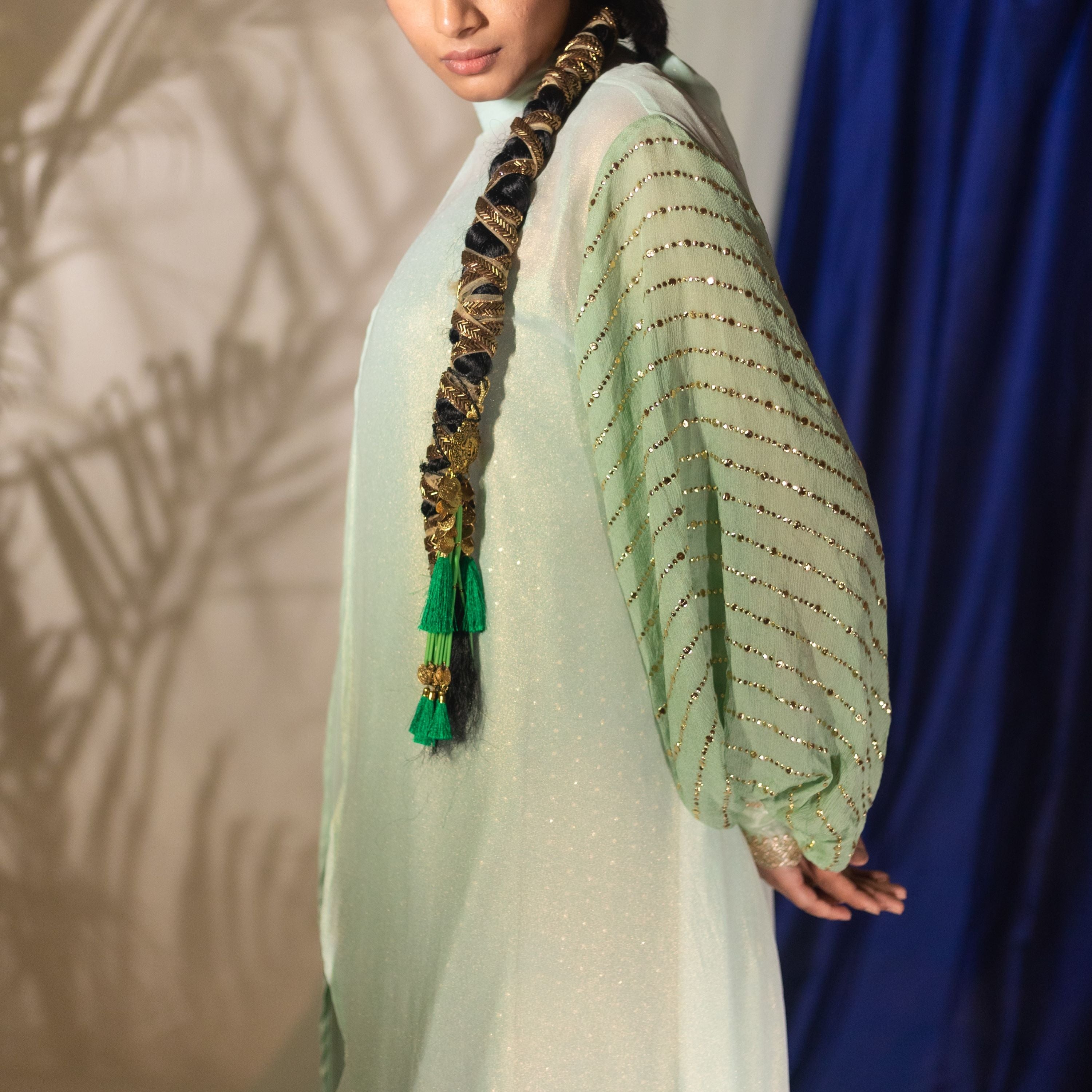 Add a touch of sophistication with the Urmi Bishop Sleeve Jacket and Dress, crafted from shimmering green fabric.