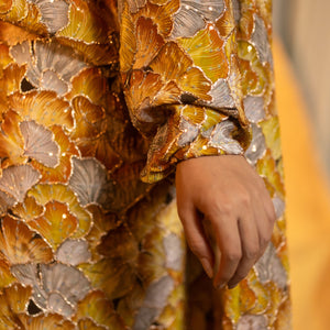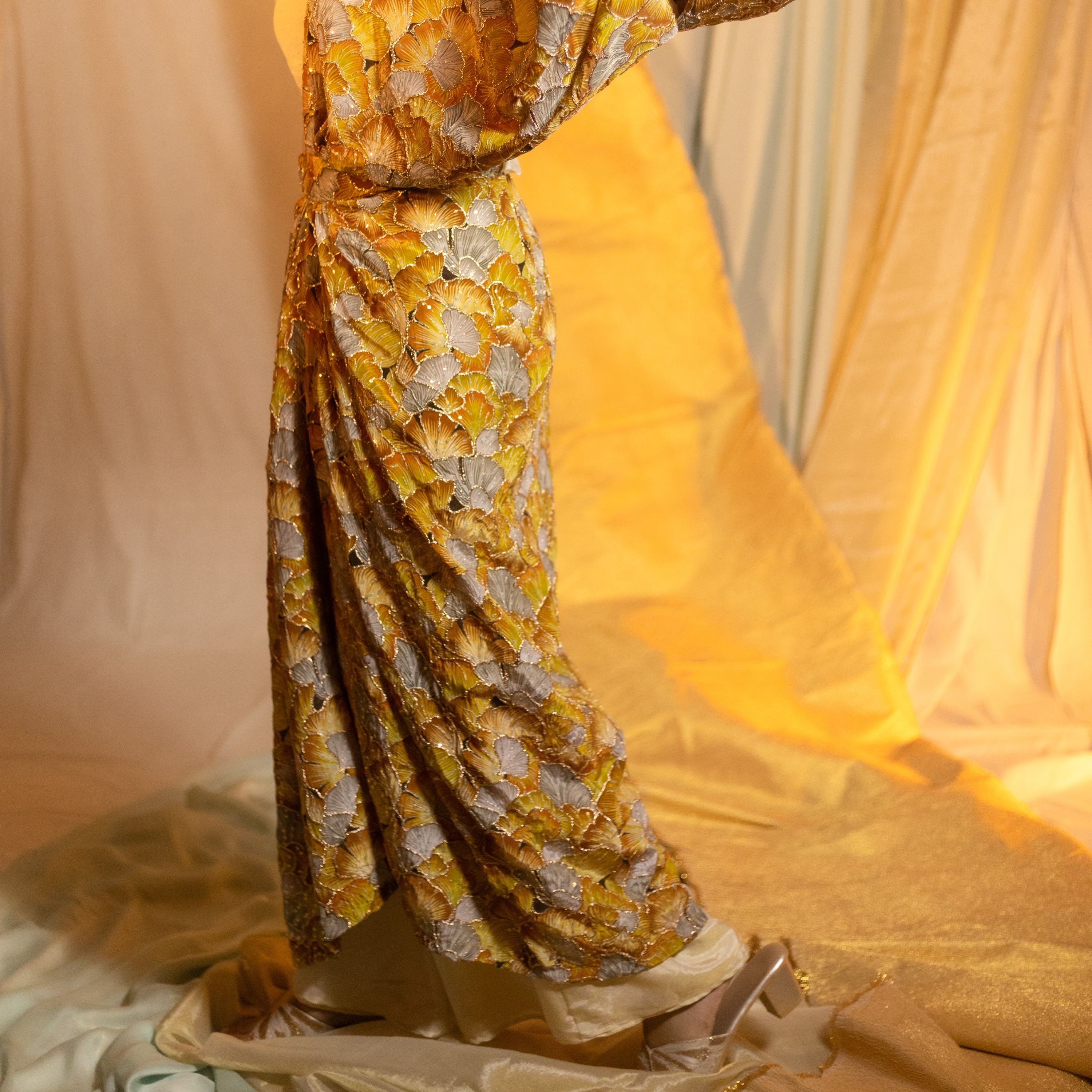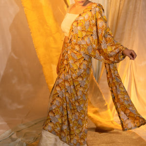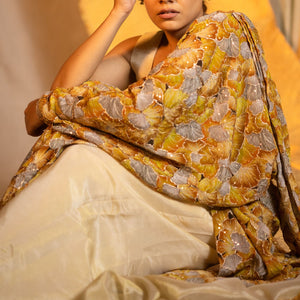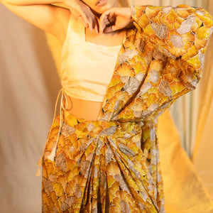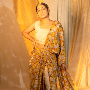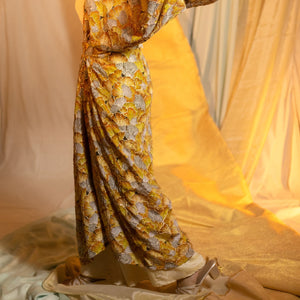 Step into effortless style with the Saundh Saree Drape from Romaani’s Spring Summer 2024 Collection. Inspired by the earthy tones of the desert, this Pre-Stitched Printed Saree in shades of brown, mustard, and beige is crafted from luxurious embroidered georgette.